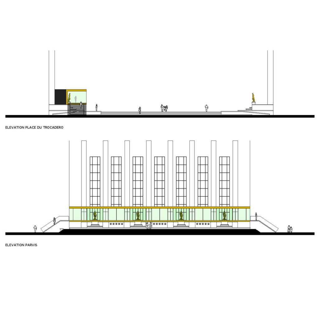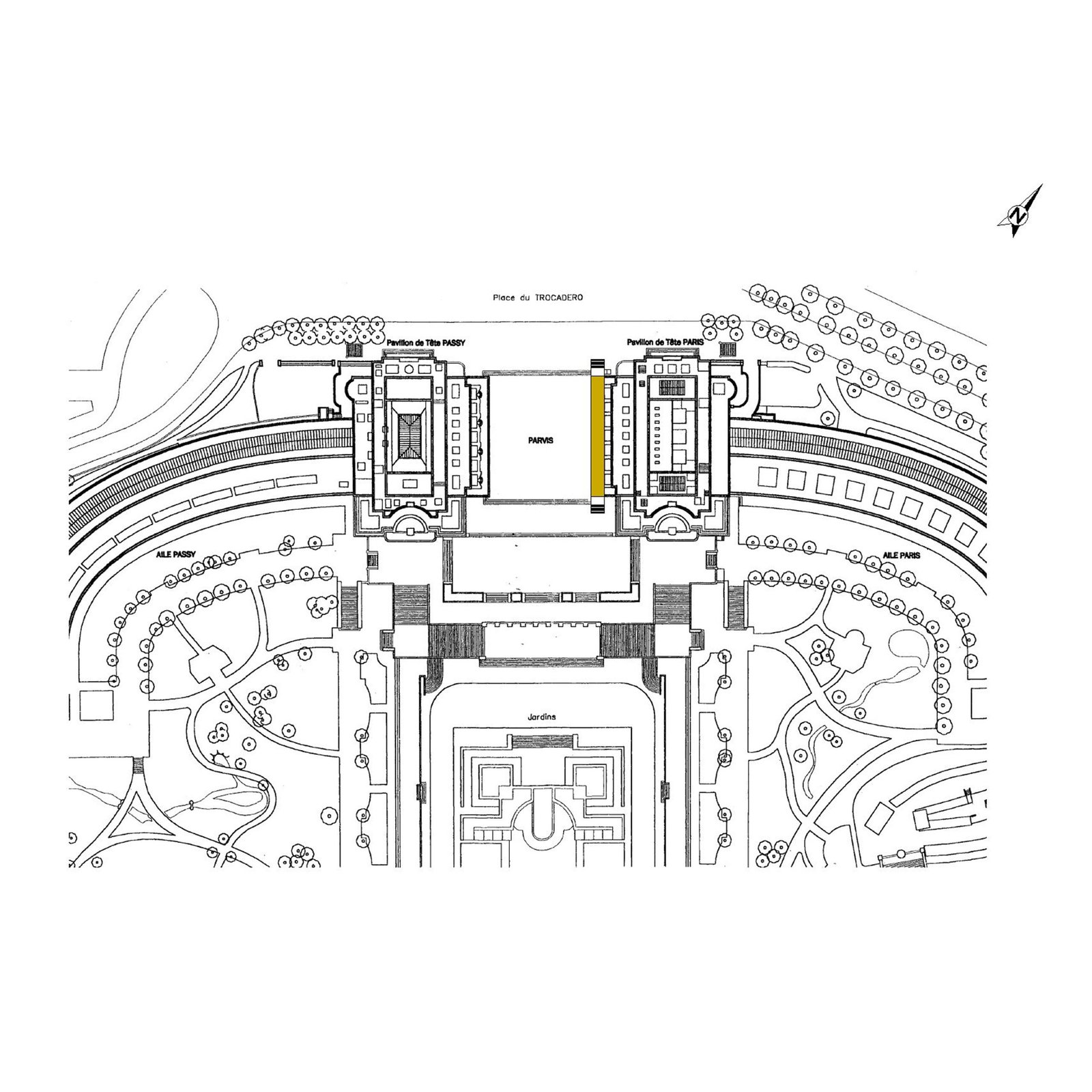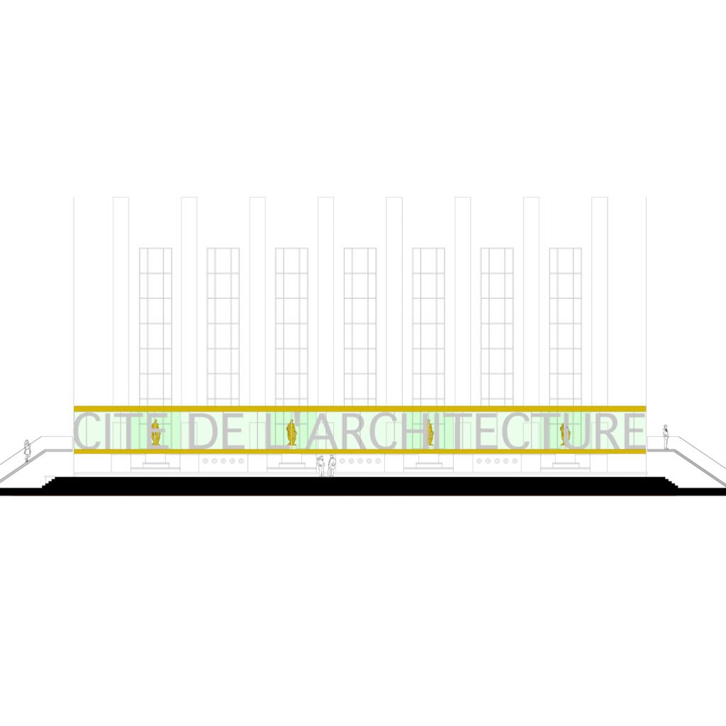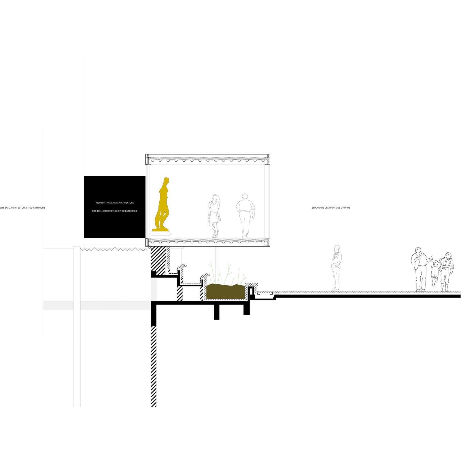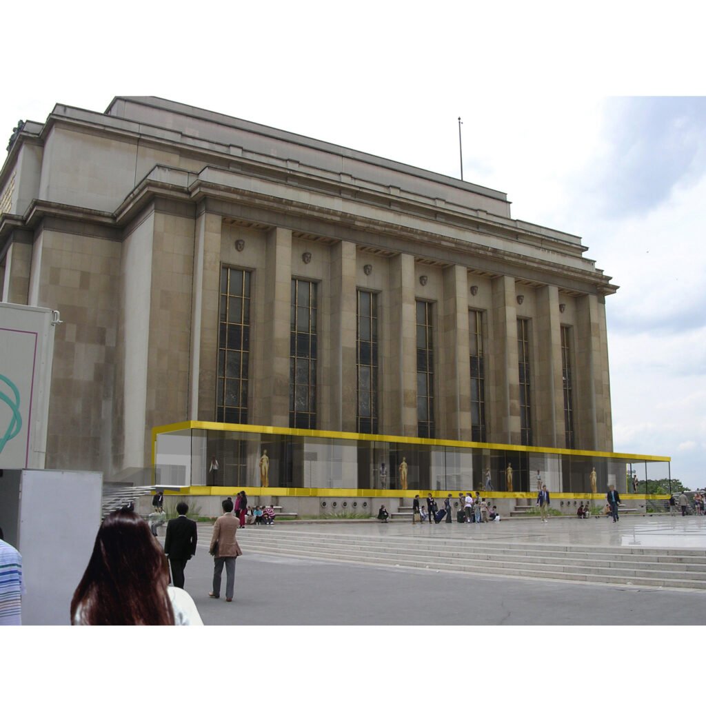 Étude de définition pour un lieu d’exposition temporaire pendant les travaux de la Cité de l’Architecture et du Patrimoine, ce projet devait s’implanter sur les bassins côté Cité.