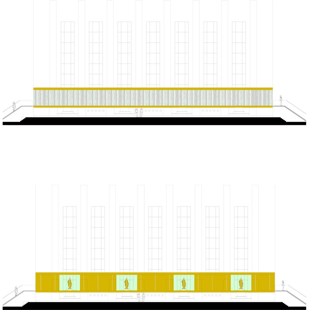 Les statues dorées se retrouvent à l’intérieur, “muséifiées”. Entièrement bardé d’inox gold, ce lieu d’information et d’exposition est une passerelle suspendue qui fait le lien entre architecture contemporaine et patrimoine historique sur un site emblématique.