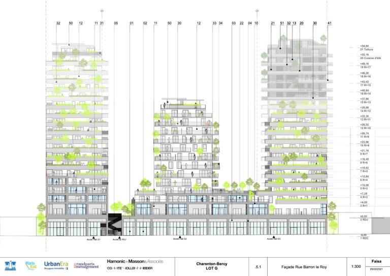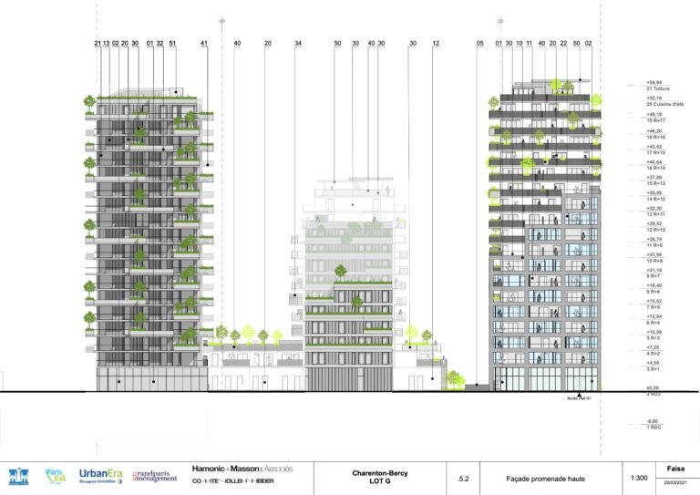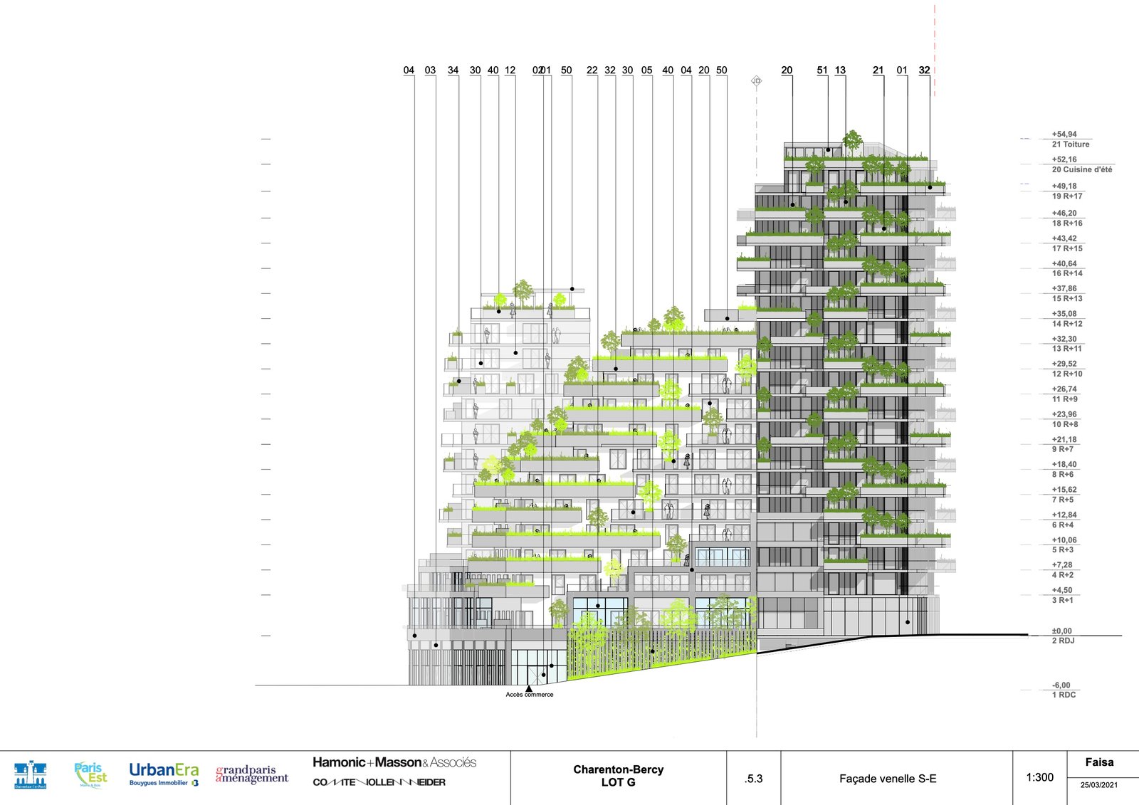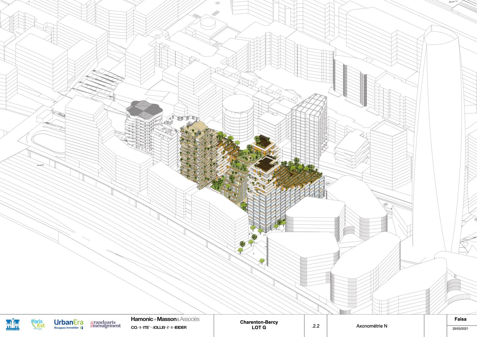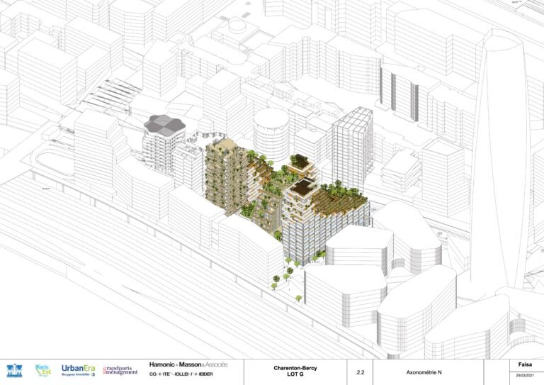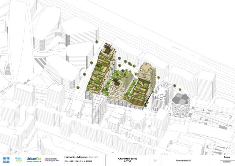 Situé au cœur de l’opération Charenton-Bercy, le lot G relie ainsi deux éléments constitutifs du site : le bois de Vincennes et la Seine. L’accent est mis ici sur la continuité paysagère de la parcelle vis-à-vis de son environnement proche. Grâce à son emplacement, il ponctue cette organisation et renforce la densité végétale à tous les niveaux du projet. Le bâtiment devient ainsi un morceau de territoire extrudé, un paysage en hauteur, dans lequel une nature indigène se développe librement à l’abri.