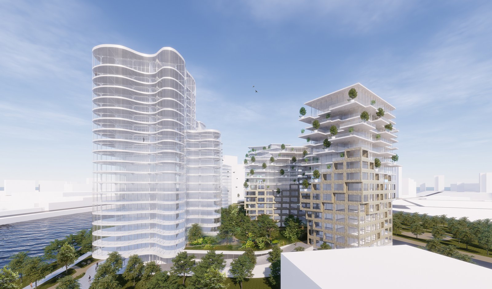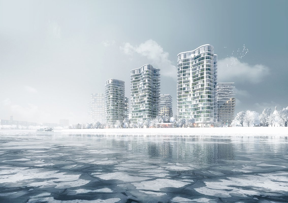 The waterfront’s towers echo the river’s liquid shape. Their curves impersonate the natural flow of the water, their glass materiality extends the river’s color and reflection vertically into the building.