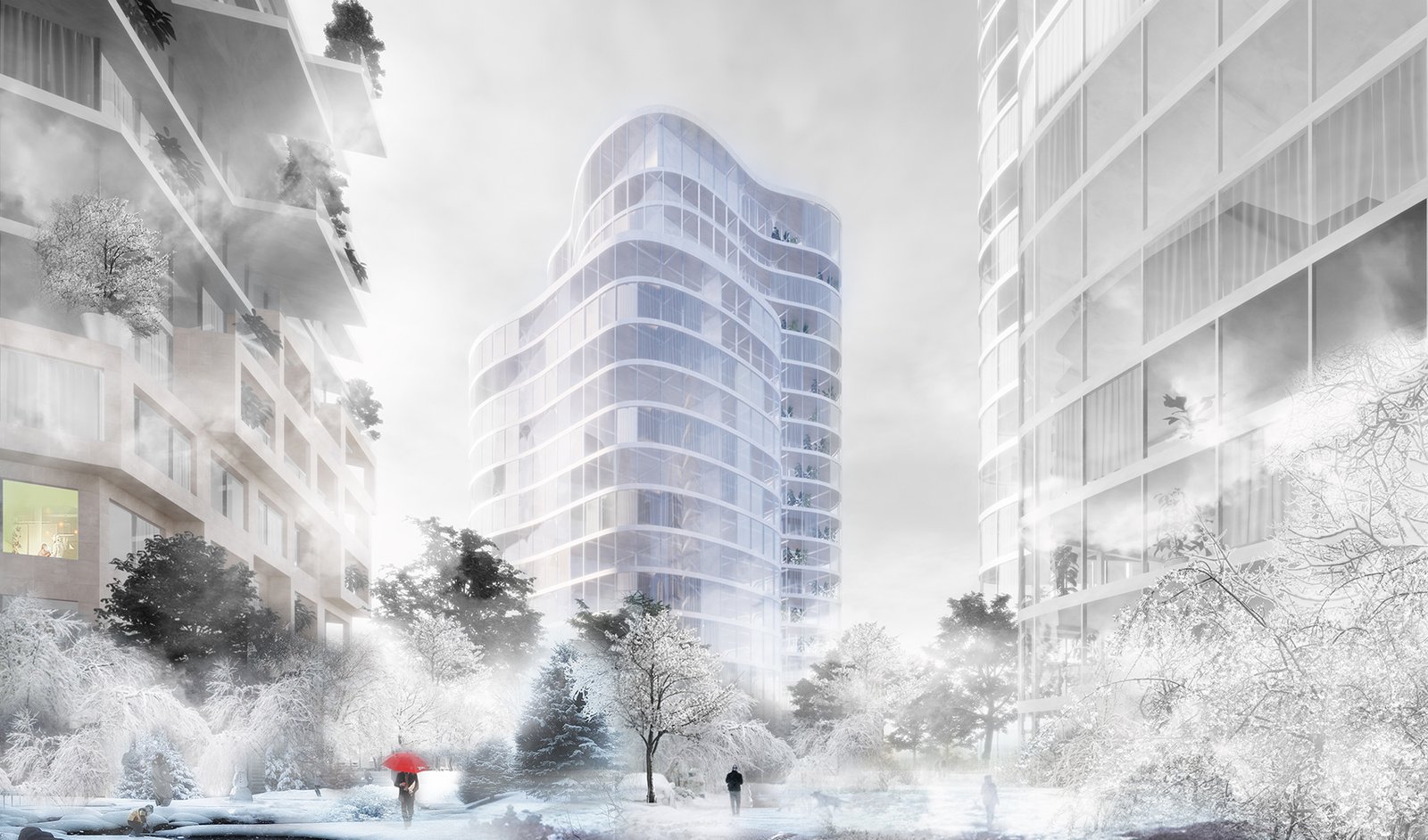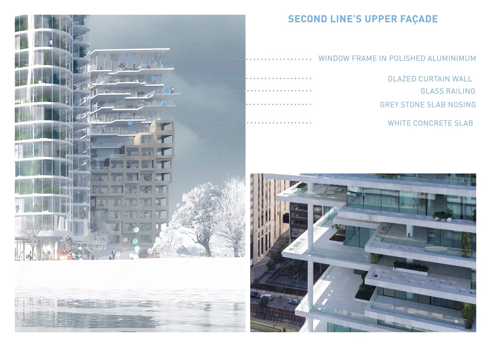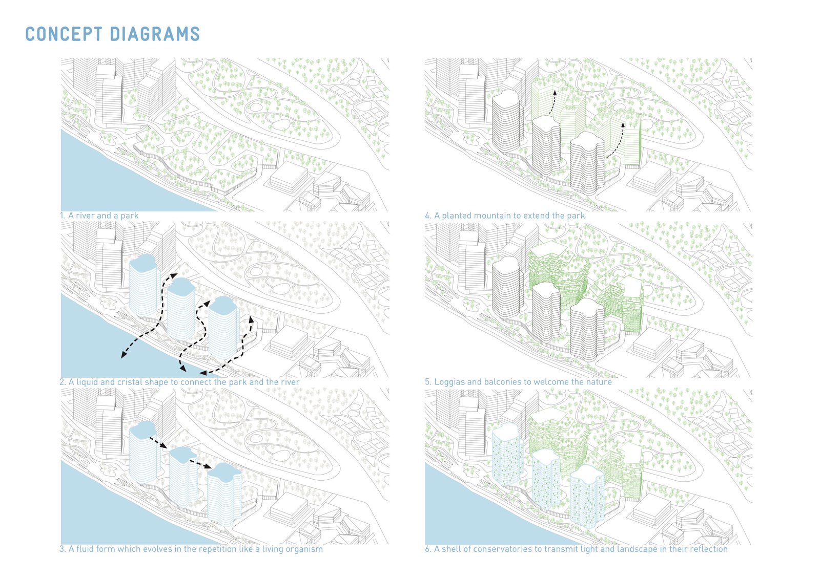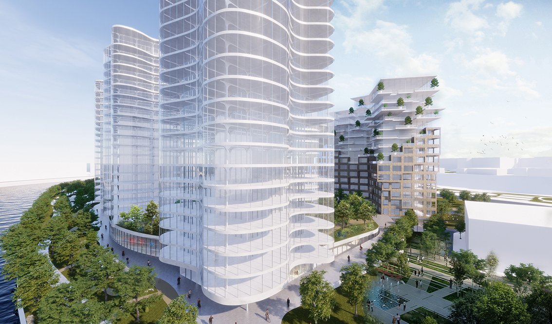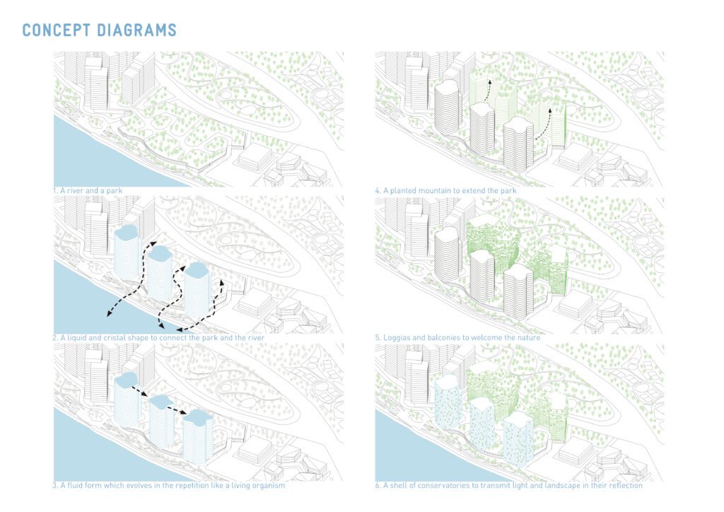 The facade, made of a double skin of conservatories, has a thermal benefit for the apartments and transform these exteriors space into greenhouse with luxurious vegetation. The towers become the absolute synthesis between the liquid form of the river and the natural dimension of the public space.