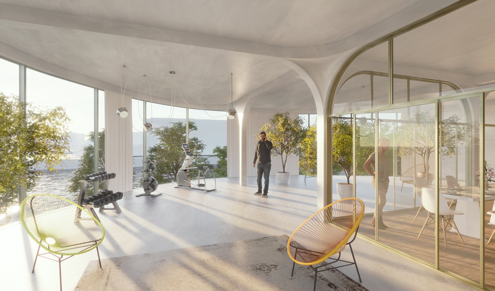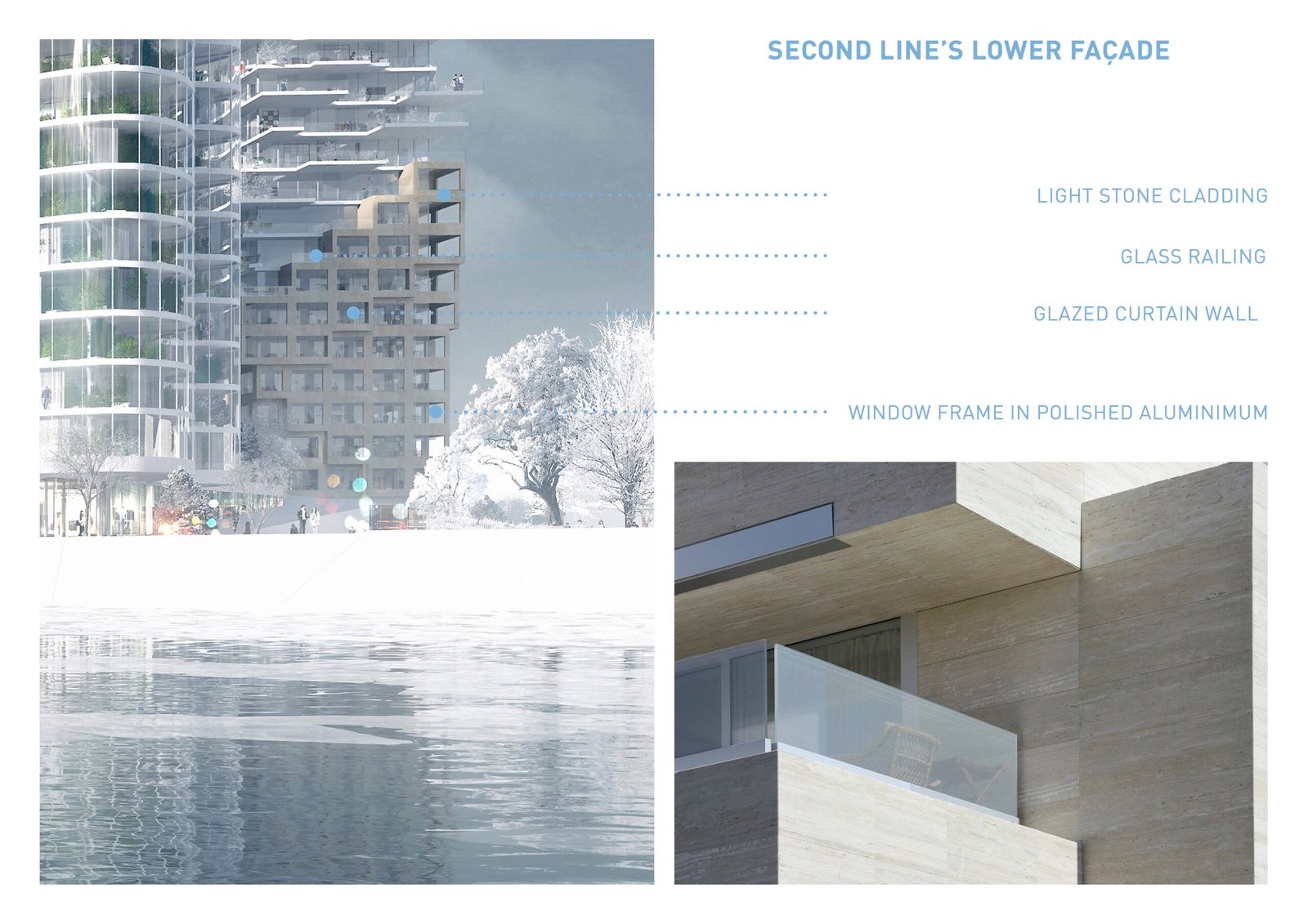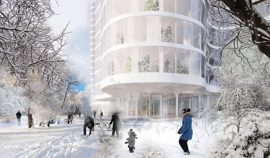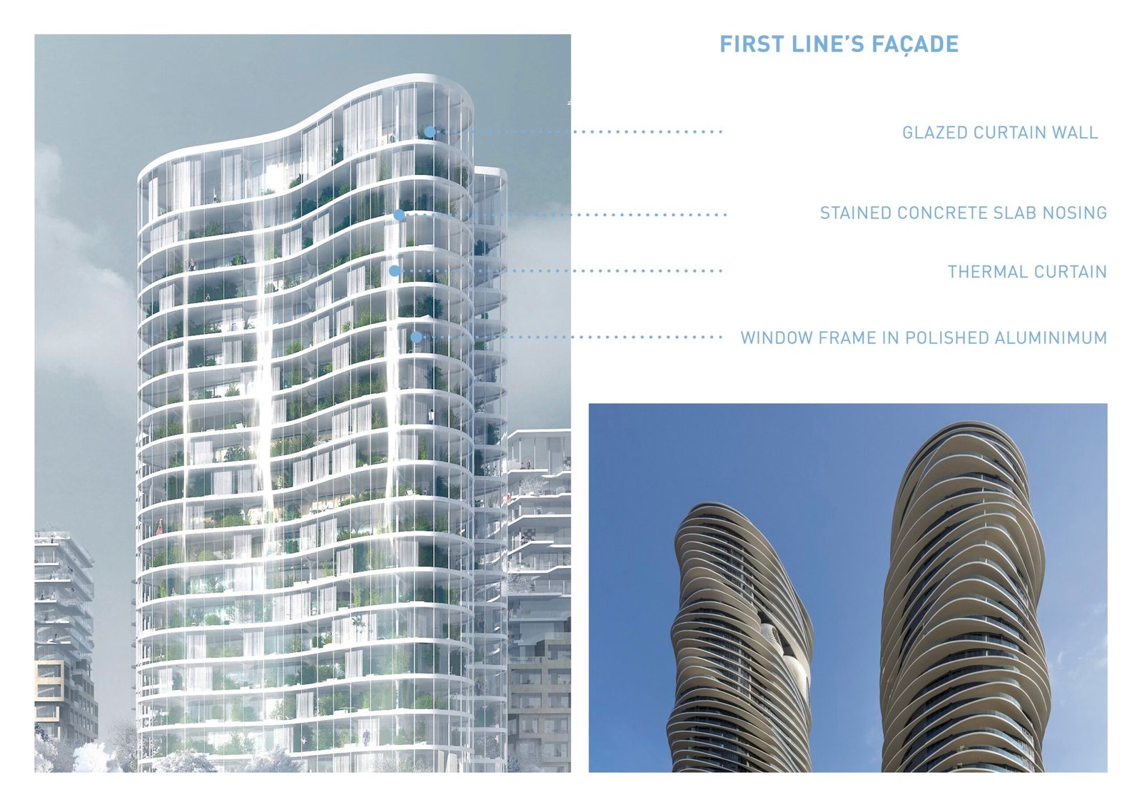 The facade, made of a double skin of conservatories, has a thermal benefit for the apartments and transform these exteriors space into greenhouse with luxurious vegetation. The towers become the absolute synthesis between the liquid form of the river and the natural dimension of the public space.