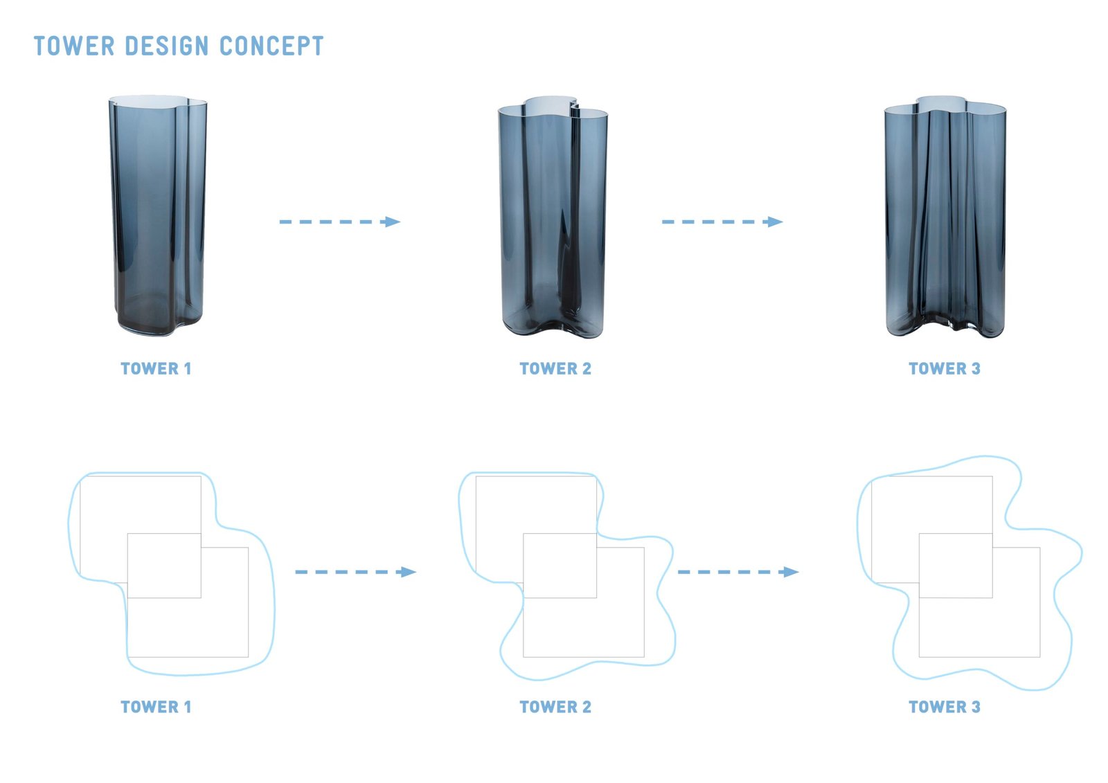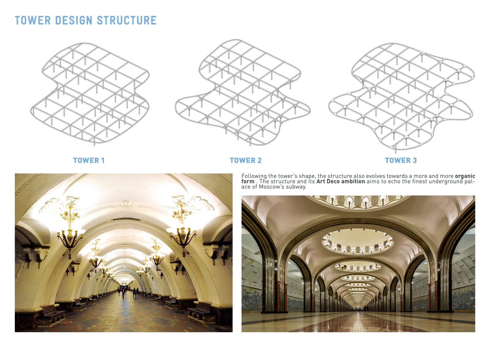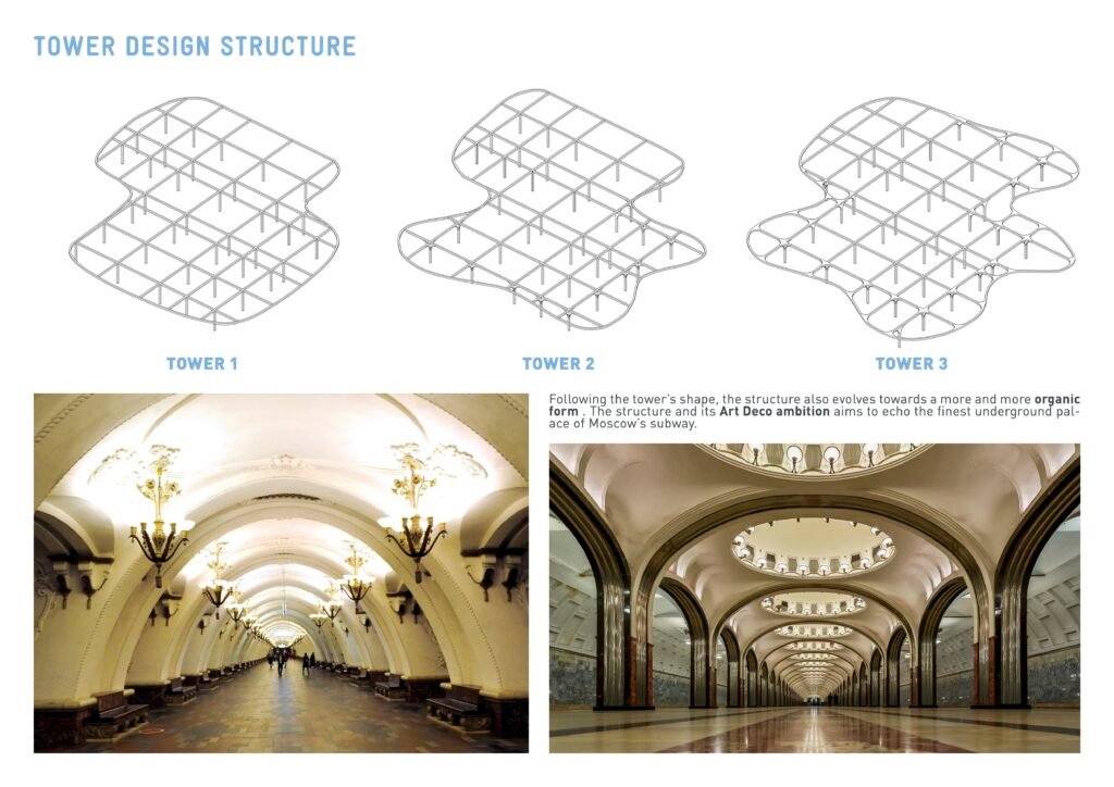 Each tower, from north to south, evolves from the same basis into a more and more expressive form, with the last becoming the true icon of the neighborhood. The structure follows this transformation to reach an Art Deco level of organic sophistication.
