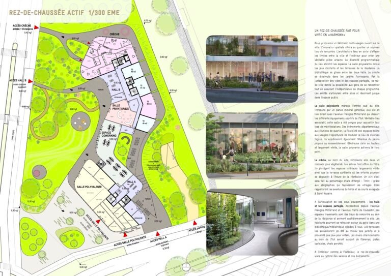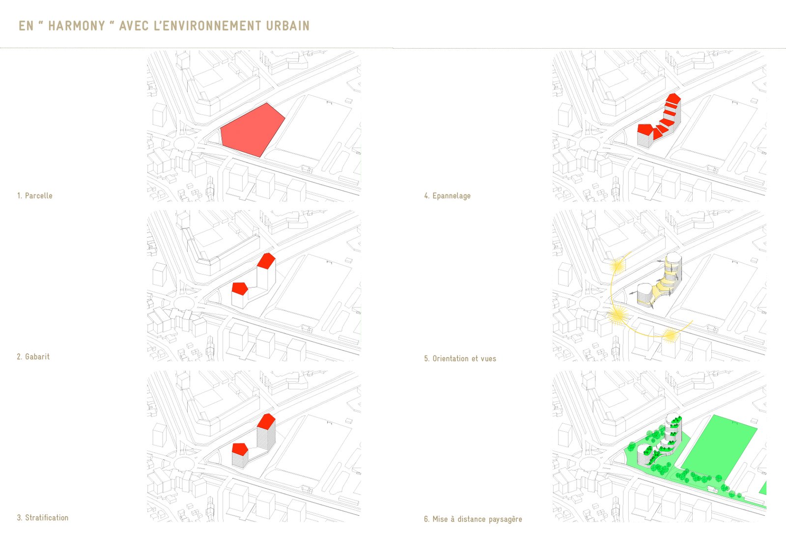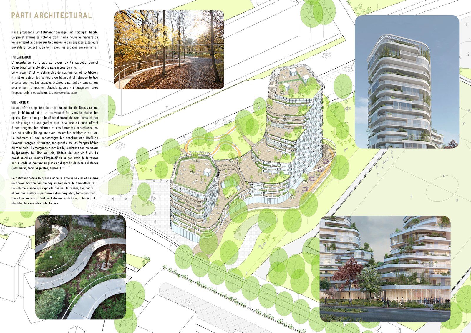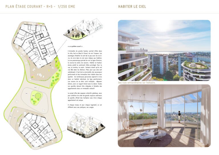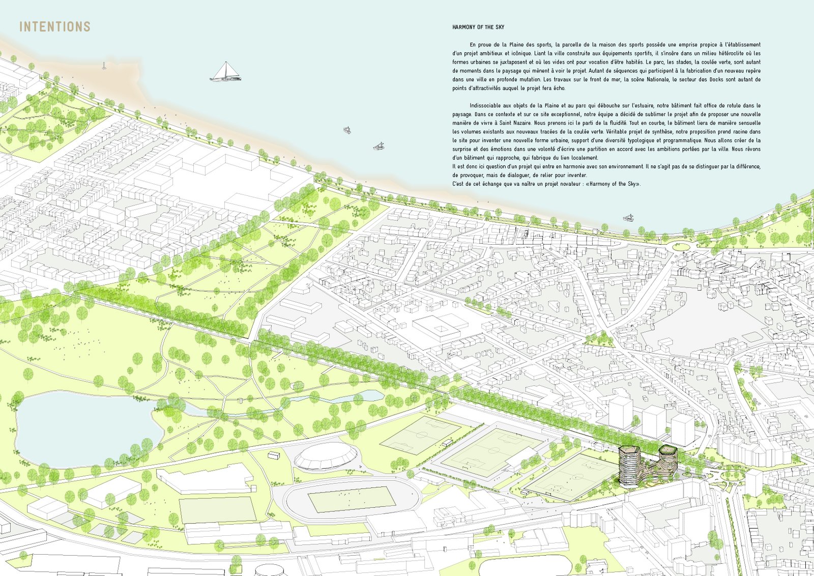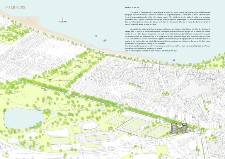 Linking the built city and its sport facilities, the project is located in a heterogeneous context where surrounding urban forms juxtapose each other, and where empty spaces call out for housing projects. The park, stadiums and green walkway are all elements of the landscape that lead to the project. They are also sequences which fabricate a new landmark in a transforming city. The regeneration of the seafront, the national theatre and the Docks are numerous points of interest that the project echoes.
