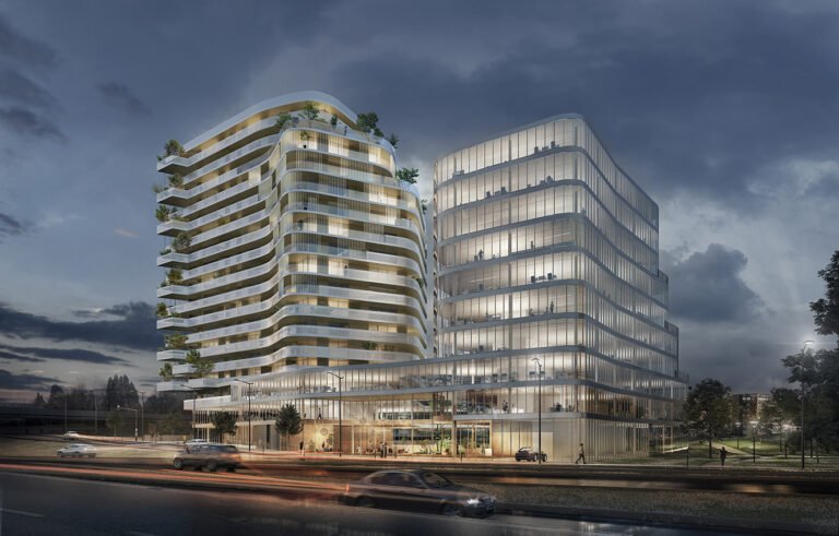 The building’s curved morphology accompanies the nearby park and the organic flux that surrounds the project (pedestrians, bikes, cars, bus, tram and rail.)