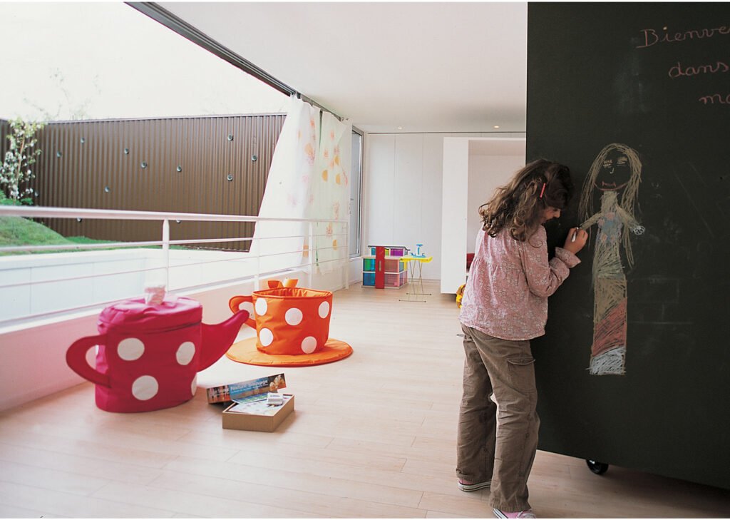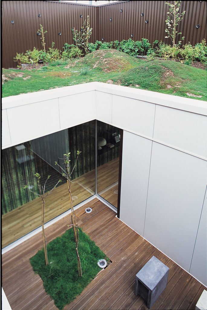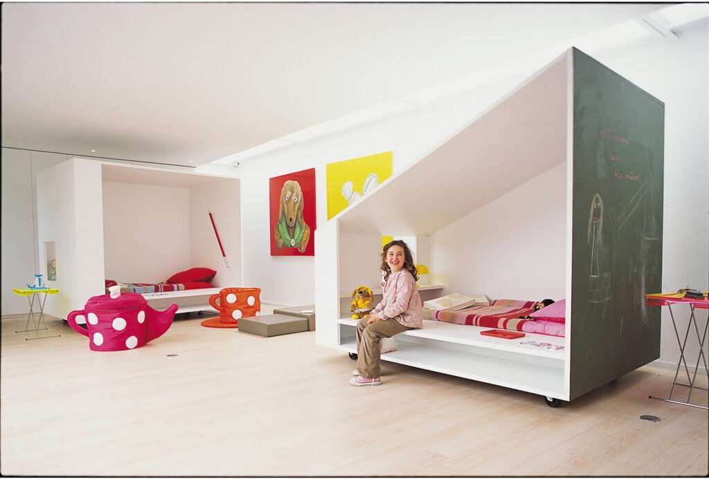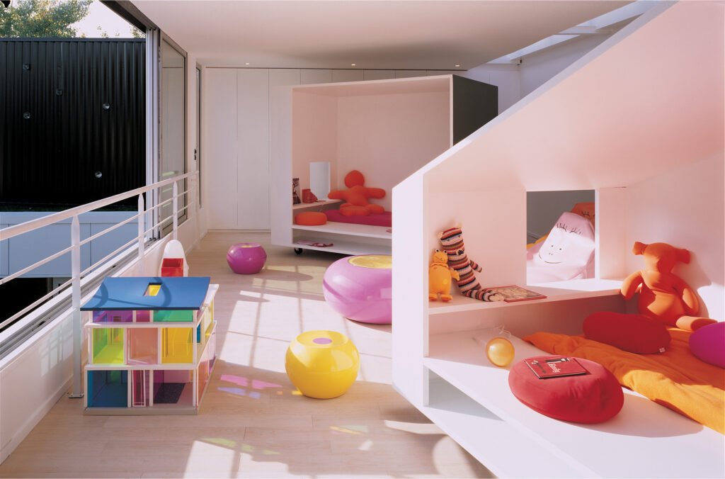 Where as the ground floor speaks of an extroverted relationship with nature, the top floor is the secret garden, reserved only for children. More than half of the floor space is given to an enclosed landscaped area, full of whimsical mounds, gullies and spy holes to both the world outside and down to the ’parent’s space’ below. The playful nature of the garden is reflected in the only enclosed space: the children’s bedroom, a large open space with beds constructed as movable cubby houses.