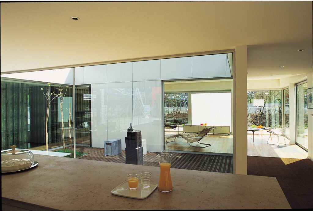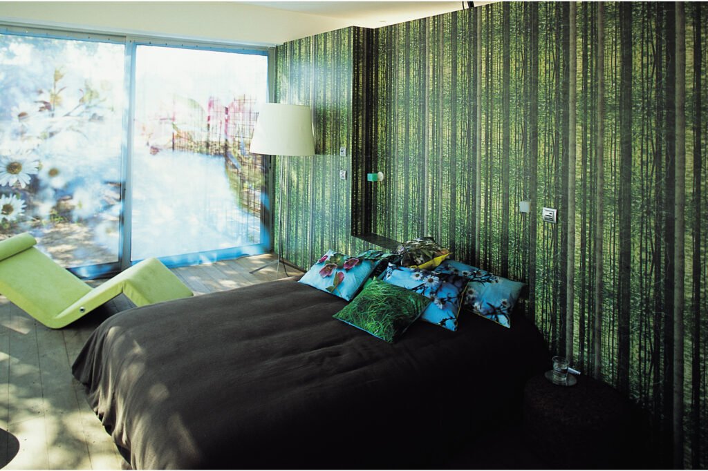 A ribbon of vegetation dominates the ground floor, while outside it consists of a planted trellis wall that allows sunlight to penetrate while providing privacy. Within the building it playfully becomes a block wrapped in super graphics showing a photorealistic forest motif and hiding service spaces within. The living spaces are bound by this ribbon: they find themselves both inside and out, extending through the constructed limits and into the garden through a dematerialized façade of mirrored stainless steel and glass.