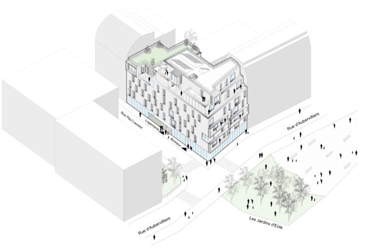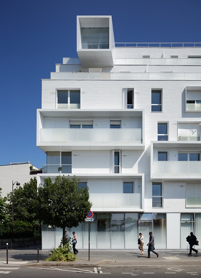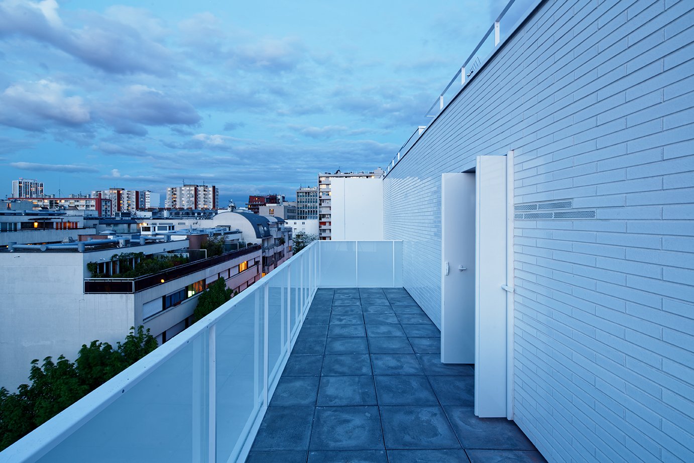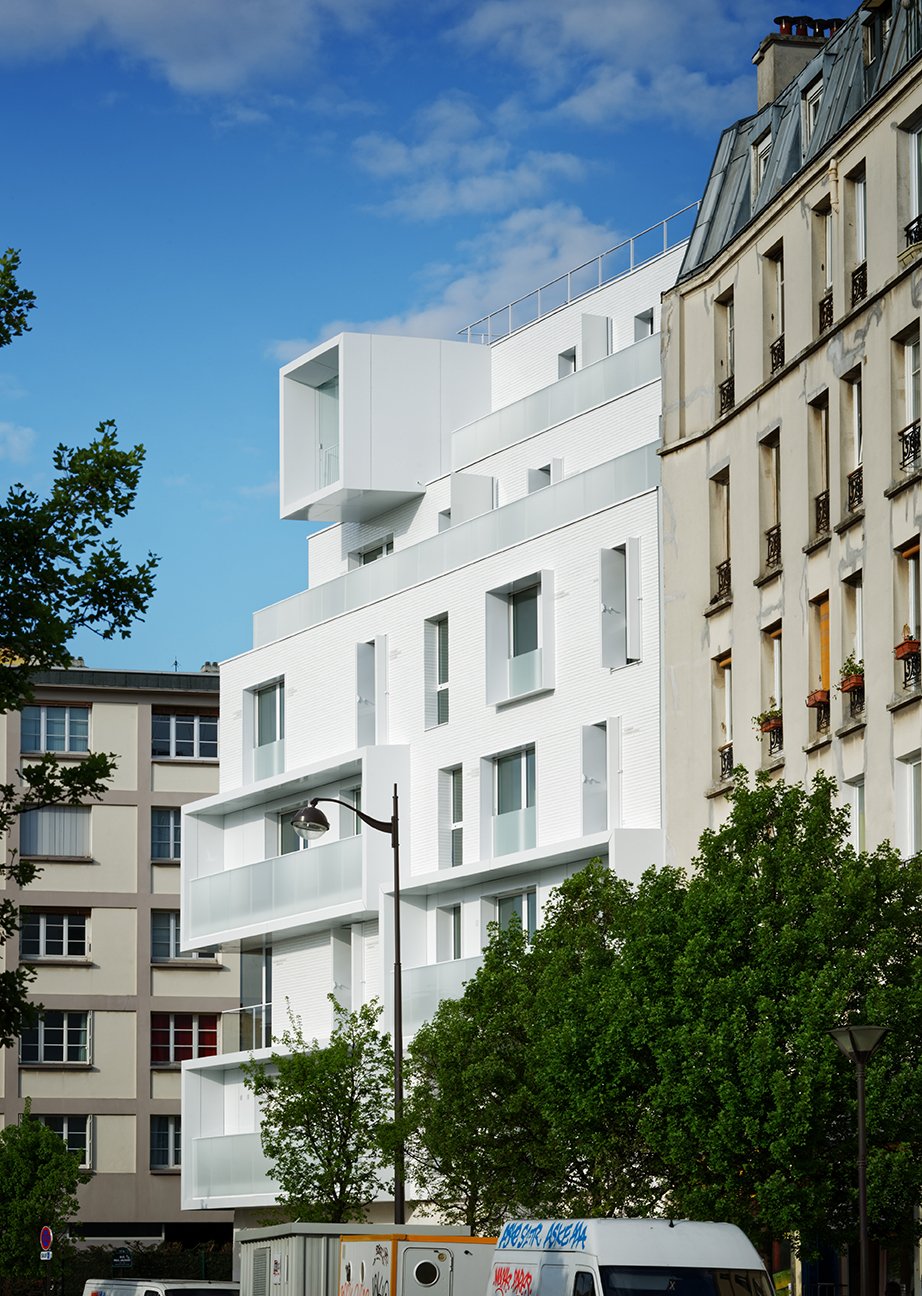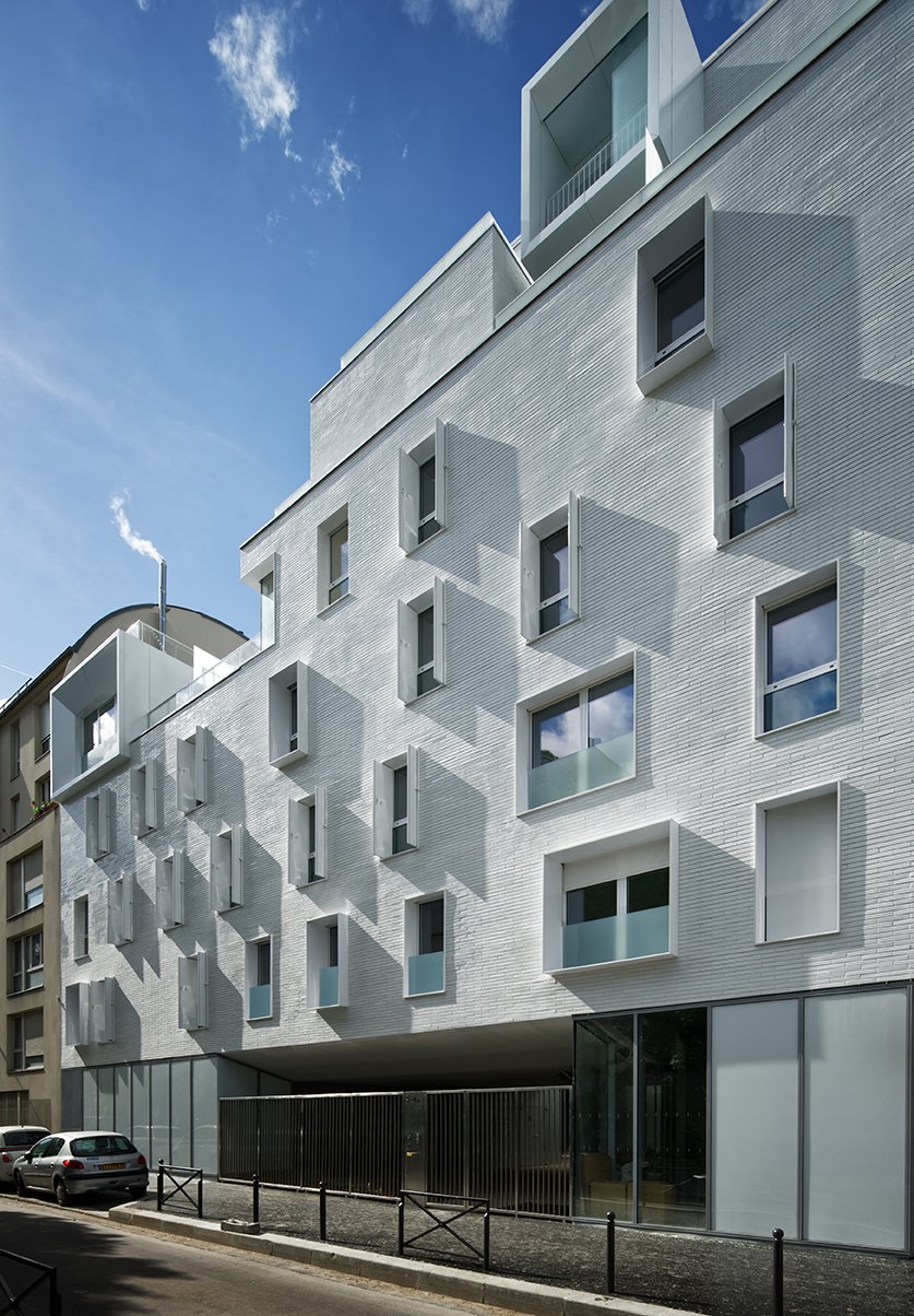 Composed of simple elements, it offers an image of sobriety through its monochrome appearance and continuous cladding. Wrapped in subtle white-varnished brick, the building occupies the corner of the rue d’Aubervilliers and rue Paul Laurent.