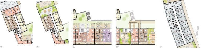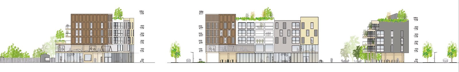 La juxtaposition des maisons conduit à l’homogénéité architecturale du concept holistique. Orientées sud et ouest, les façades sur rue principale cachent de généreuses terrasses, des espaces ouverts et des loggias. Le caractère du quartier est mis en valeur par la mise en œuvre de différents types de façades urbaines. Les fragments individuels sont réunis en un tout.