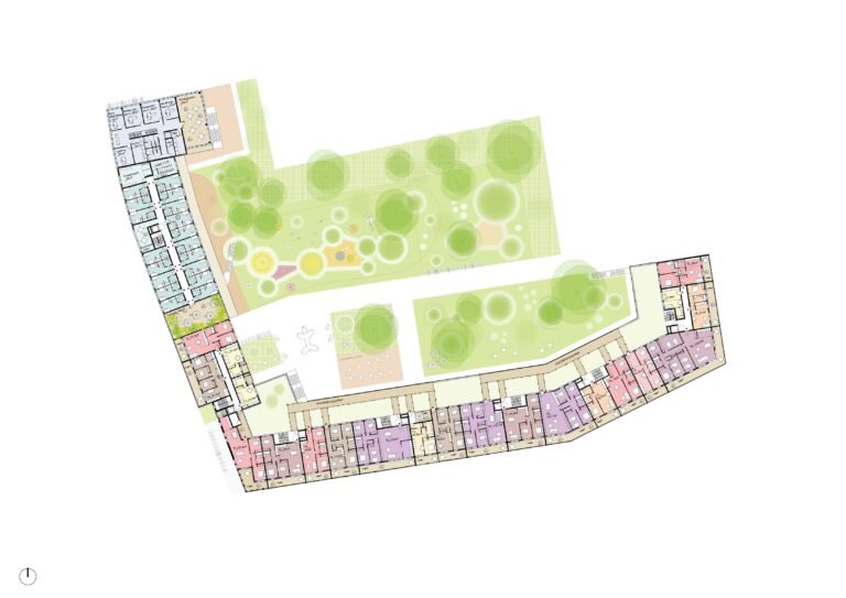 Le design offre une configuration simple et efficace. En traçant des divisions irrégulières des façades, une nouvelle texture urbaine est créée. À la manière d’un puzzle, des fragments sont réassemblés, en écho à la typologie de l’habitat à petite échelle.