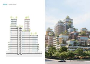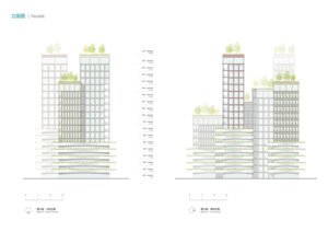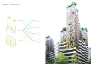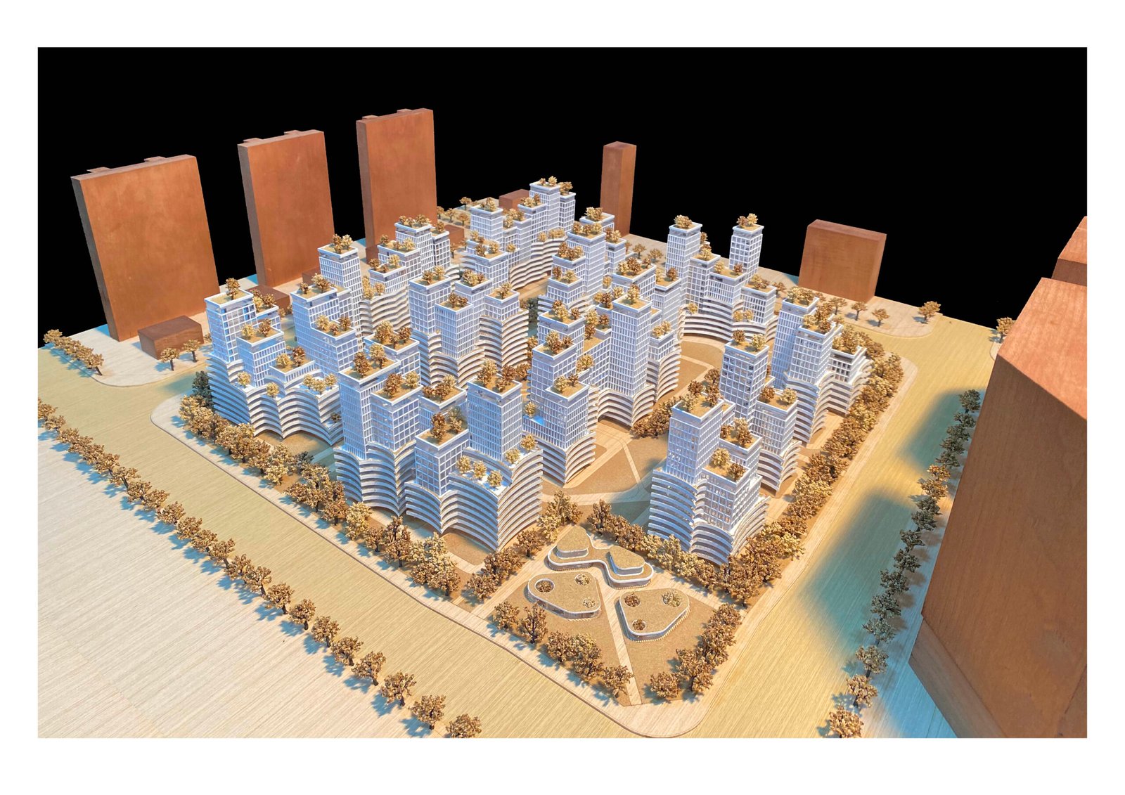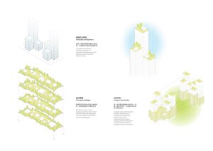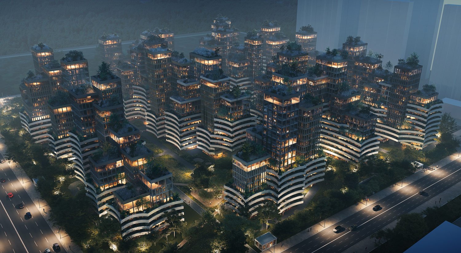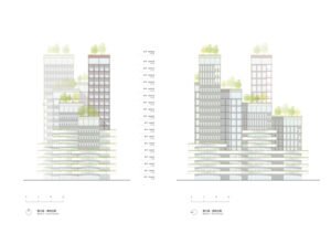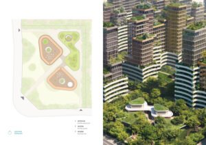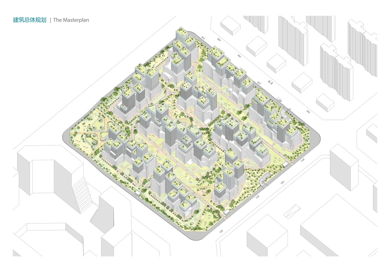 Ce projet de 150 000 m² introduit une nouvelle vision de la vie en haute densité pour les générations futures dans ce quartier. Une vie différente de celle proposée par le marché immobilier conventionnel en Chine aujourd’hui. Le but est d’offrir plus de verticalité et de clarté ; de créer des styles de vie différents selon les strates ; de donner plus de possibilités d’échanges entre les quartiers à travers des espaces collectifs de différentes échelles et de privilégier une vie harmonieuse entre le paysage et la nature présente dans le quartier.