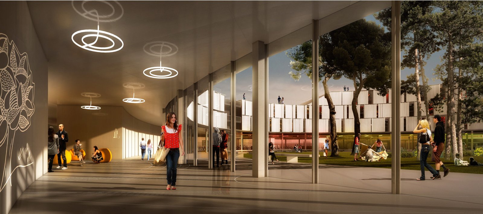 En continuité avec le hall d’entrée, la salle des pas perdus se présente comme un large péristyle. Elle se développe sur le périmètre intérieur, en relation directe avec le jardin, et oriente vers les différents lieux de vie collective. En connectant le hall et les salles polyvalentes, elle devient l’espace de représentation par excellence qui privilégie les échanges et rencontres.