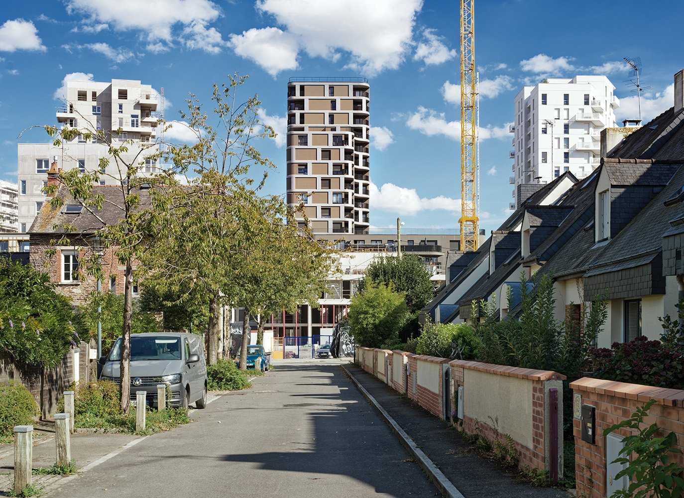 Le travail de façades réfléchissantes est l’occasion de lui donner son image en lui apportant une subtilité, une poésie. C’est aussi la possibilité de l’insérer dans le ciel de Rennes et ses changements dans la journée comme au cours des saisons, de la faire réagir à ce ciel par tous les temps. C’est une donnée essentielle du projet. Nous avons retenu le métal, le verre et le béton comme matières capables de proposer des dimensionnements les plus fins (en assemblage, en épaisseur, en structure, en texture), de jouer sur les reflets et allant dans le sens de la légèreté.