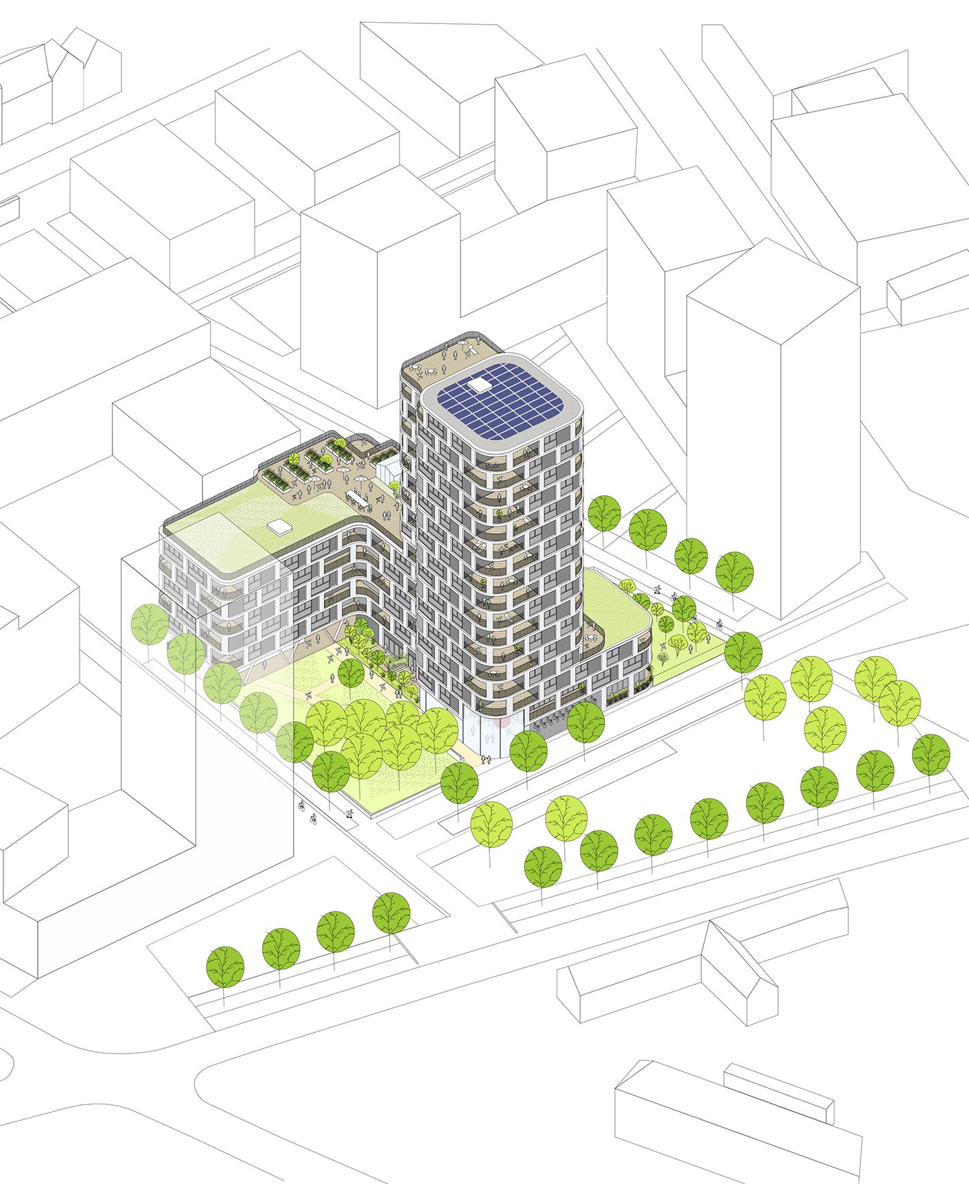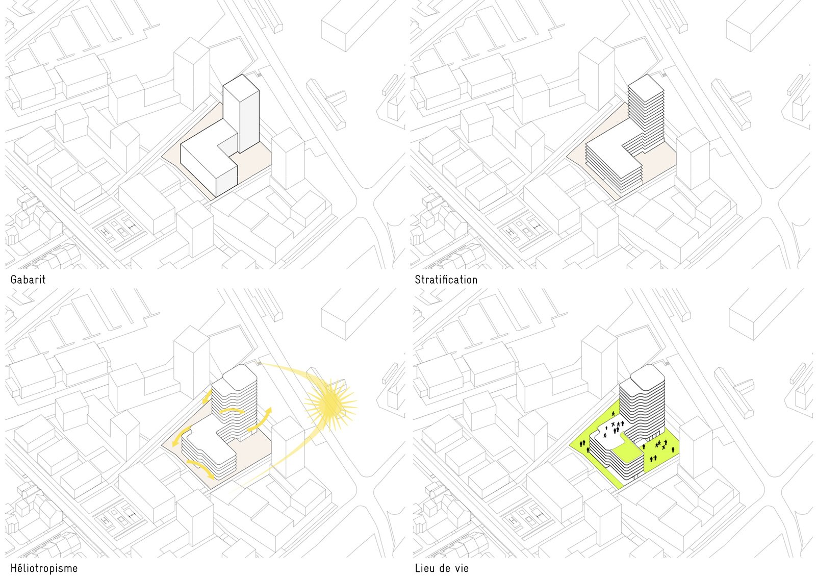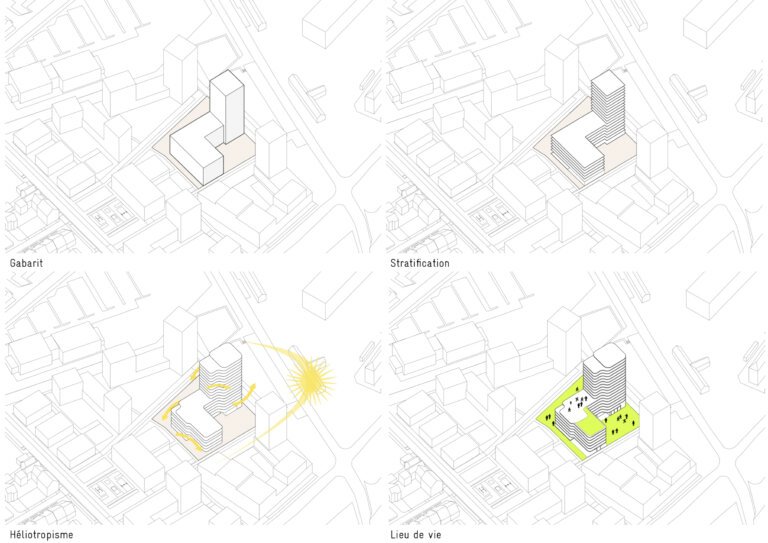 Sa position stratégique centrale, en pivot, renvoie le projet à plusieurs lectures, à des histoires différentes en fonction de l’éloignement ou du rapprochement et provoquent des multiples sensations. La découpe de la silhouette offre aux habitants alentours une vue dynamique et aux usagers du bâtiment, des lieux diversifiés.