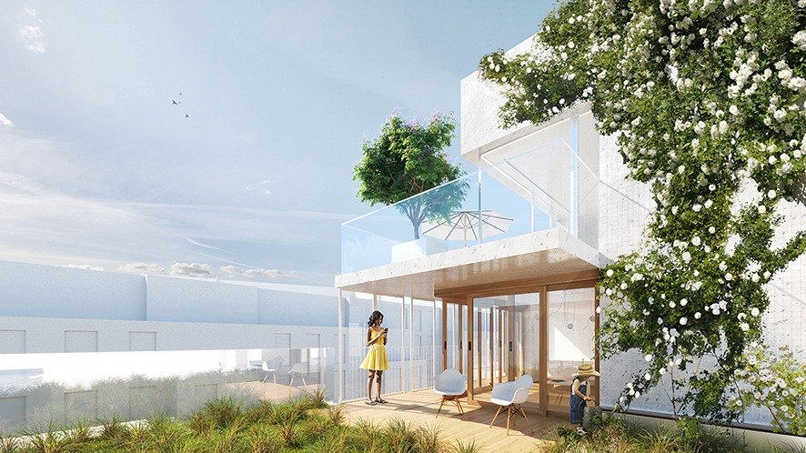Cette « épaisseur » extérieure sert ainsi de filtre visuel vivant avec le bâtiment en vis-à-vis. Orienté plein sud, notre dispositif offrira un gigantesque jardin suspendu et lumineux au regard des habitants voisins. Plaisir d’usages et plaisir des yeux.