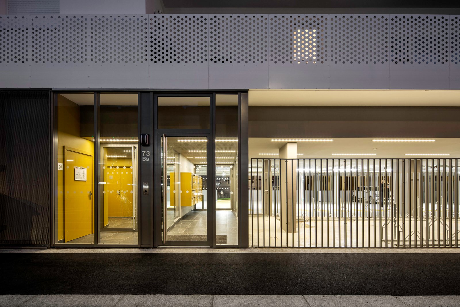 Des éléments de transparence permettent une interaction visuelle entre l’espace public et le cœur d’îlot paysagé, ajoutant une dimension d’ouverture et de connexion à l’environnement extérieur.
