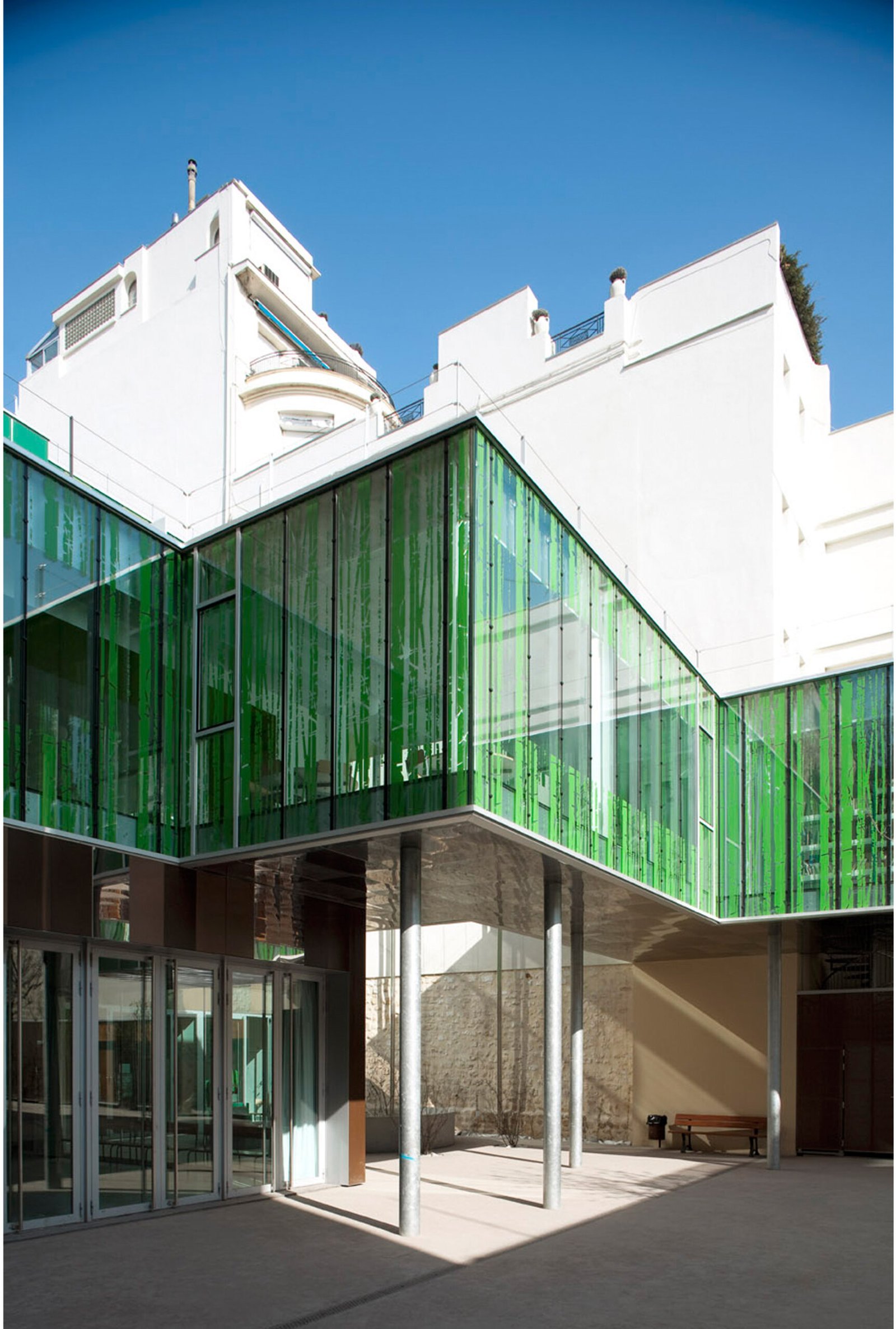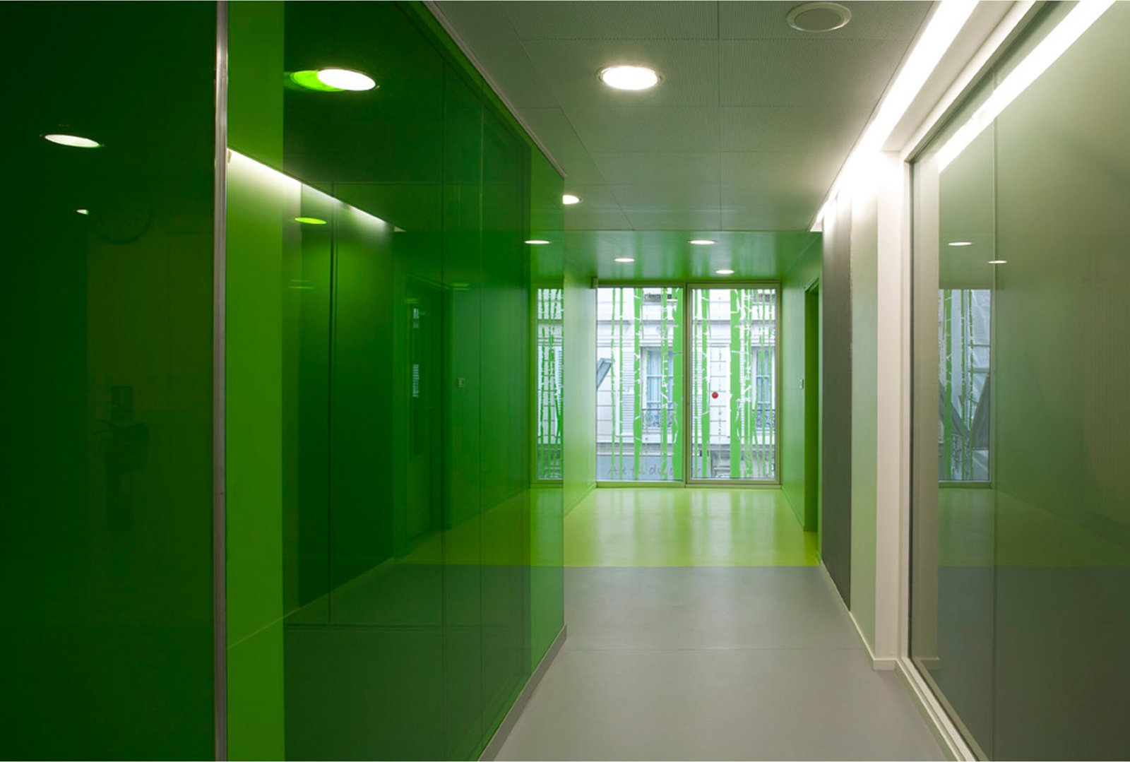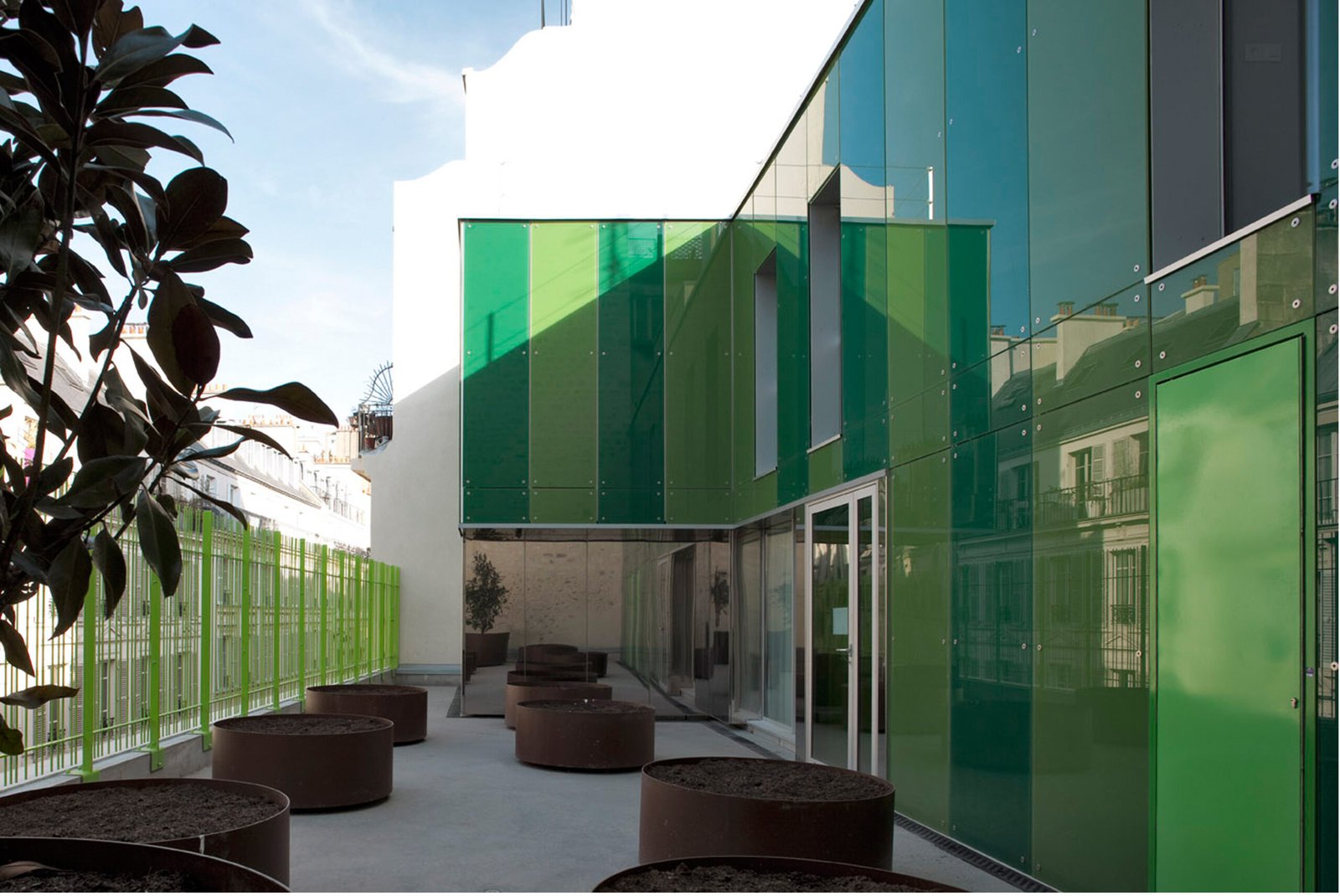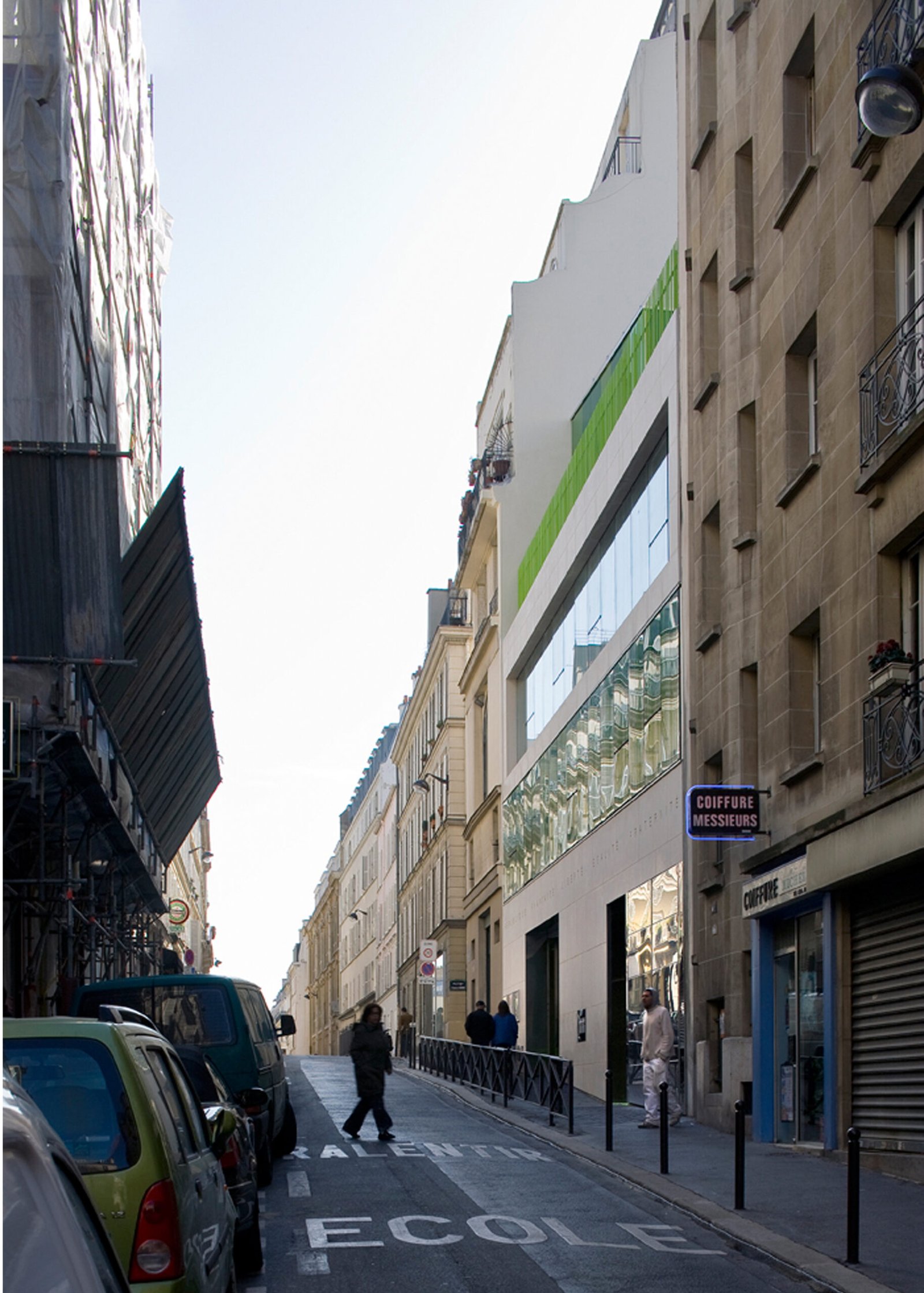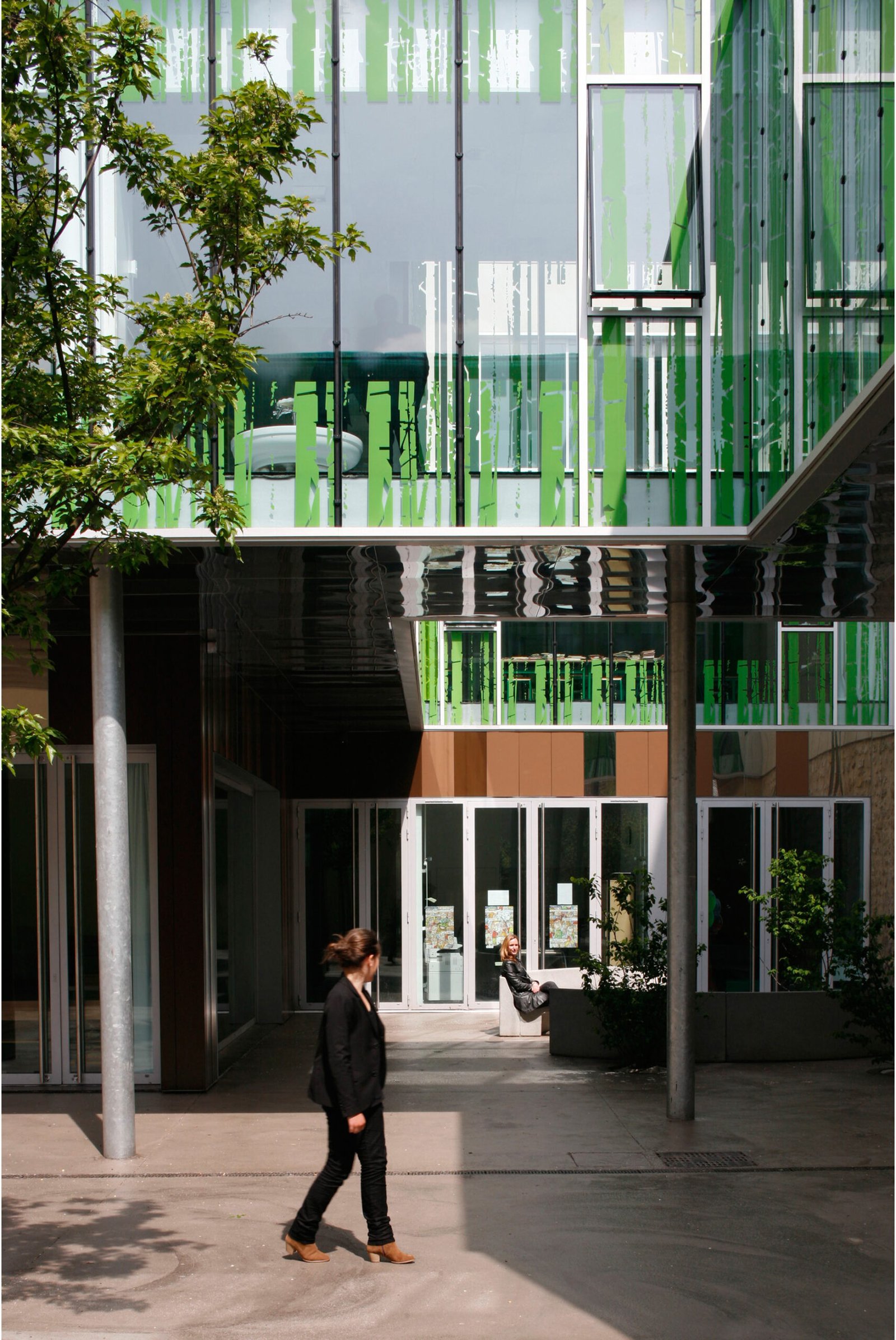 Il parvient à désamorcer l’étroitesse de la parcelle. En la trouant et la couvrant partiellement de ses sous-faces réfléchissantes, il vient qualifier la cour. Sur rue, le bâtiment s’élève à R+4 dans une logique de strates de pierre, verre, sérigraphies vertes, bareaudages et emalits aux diverses tendances de vert.