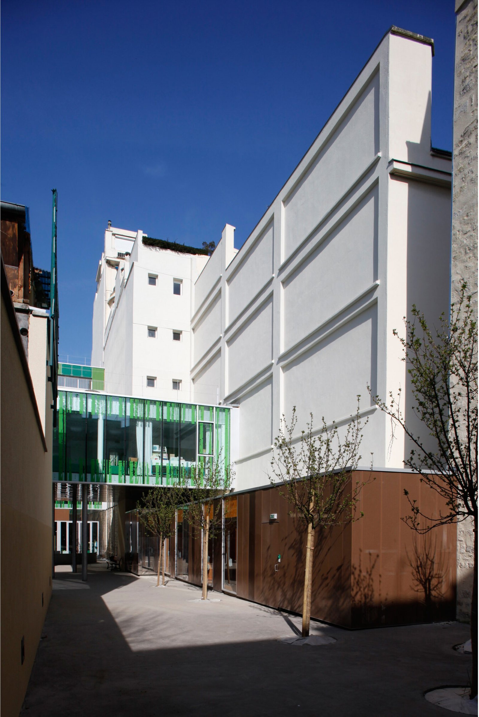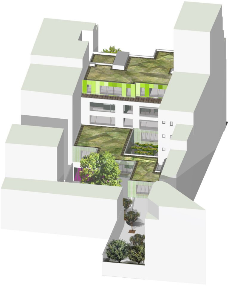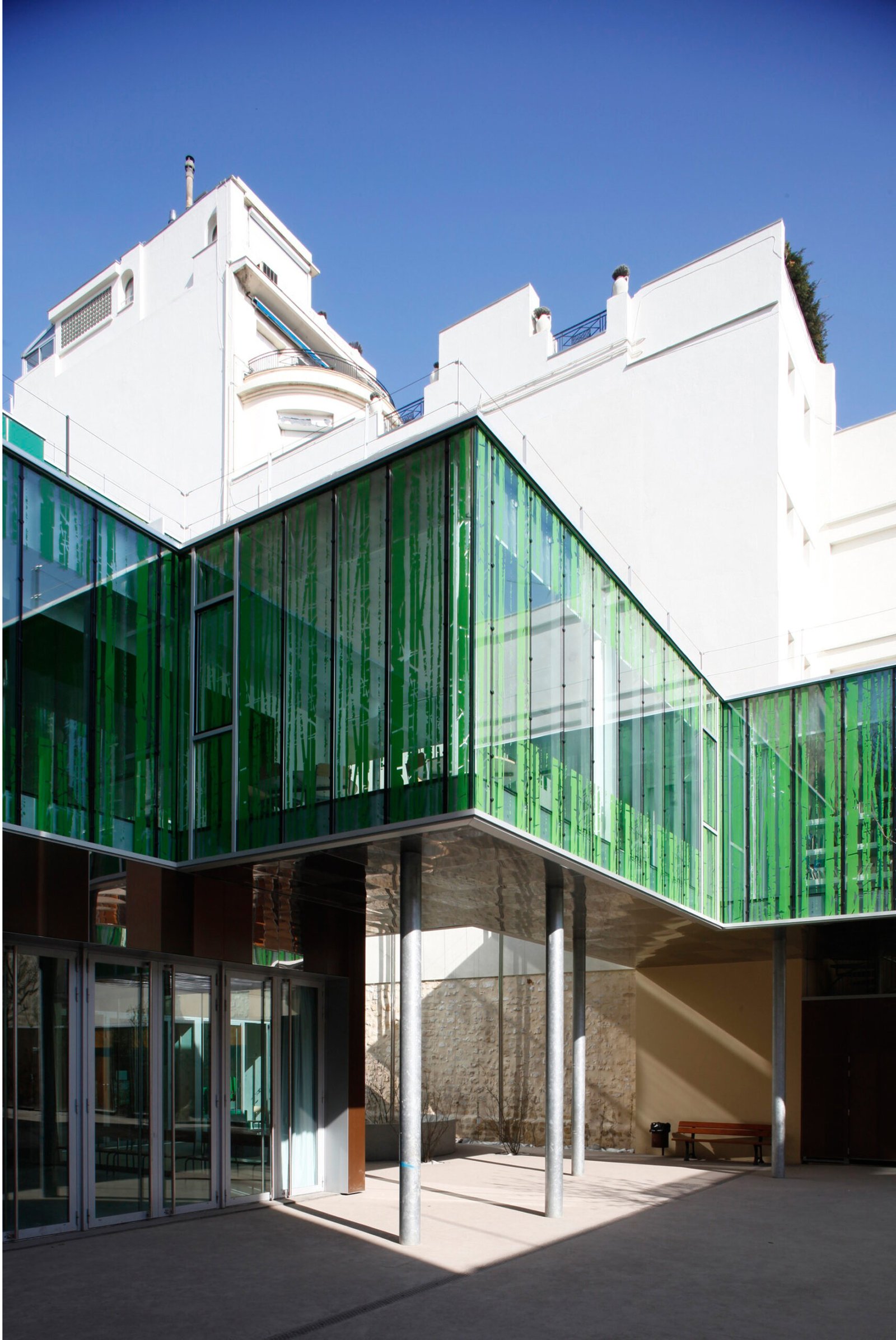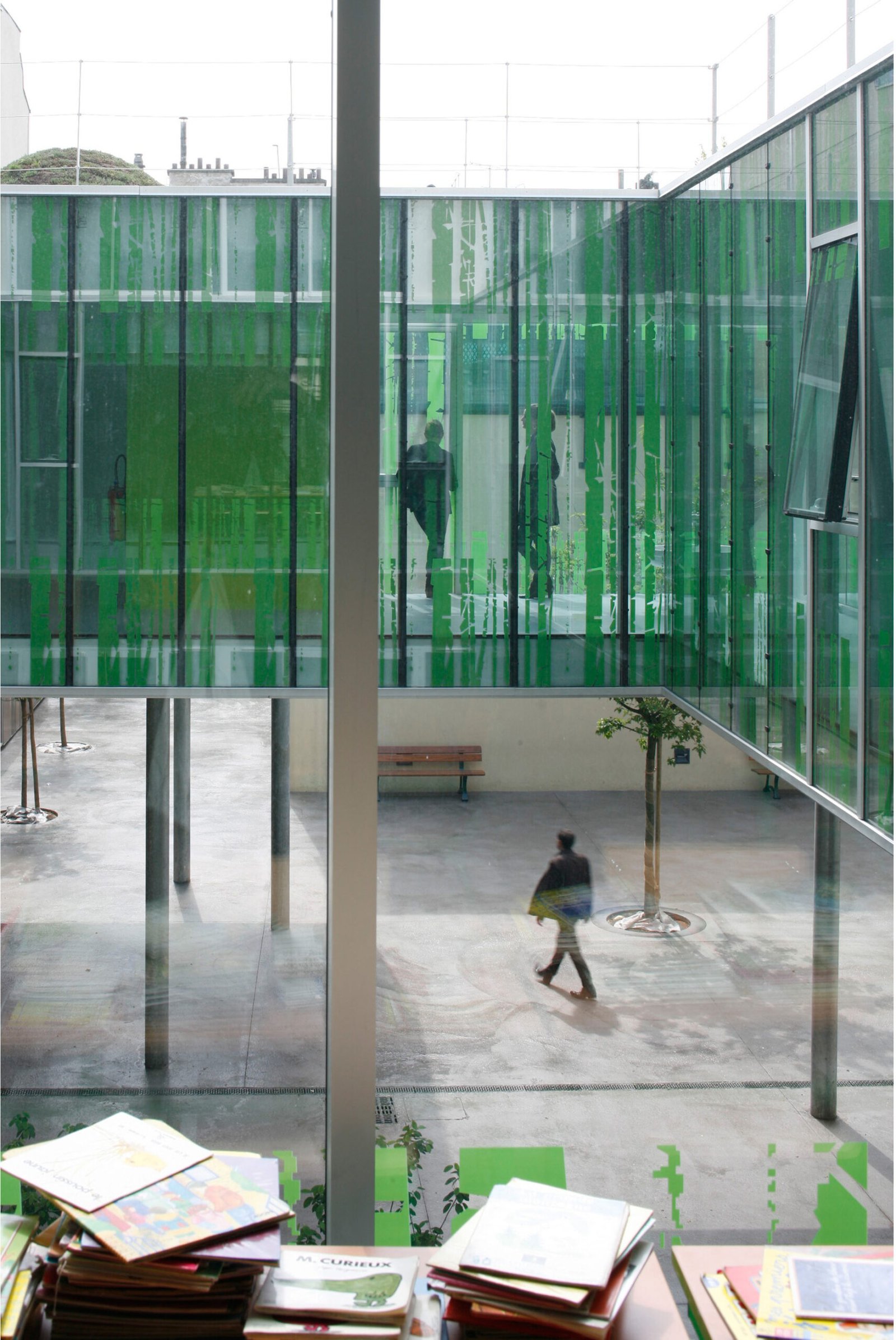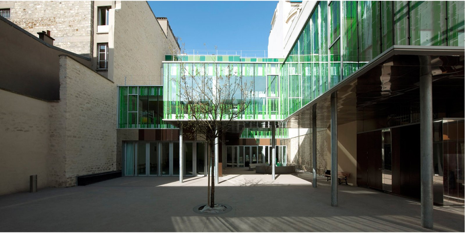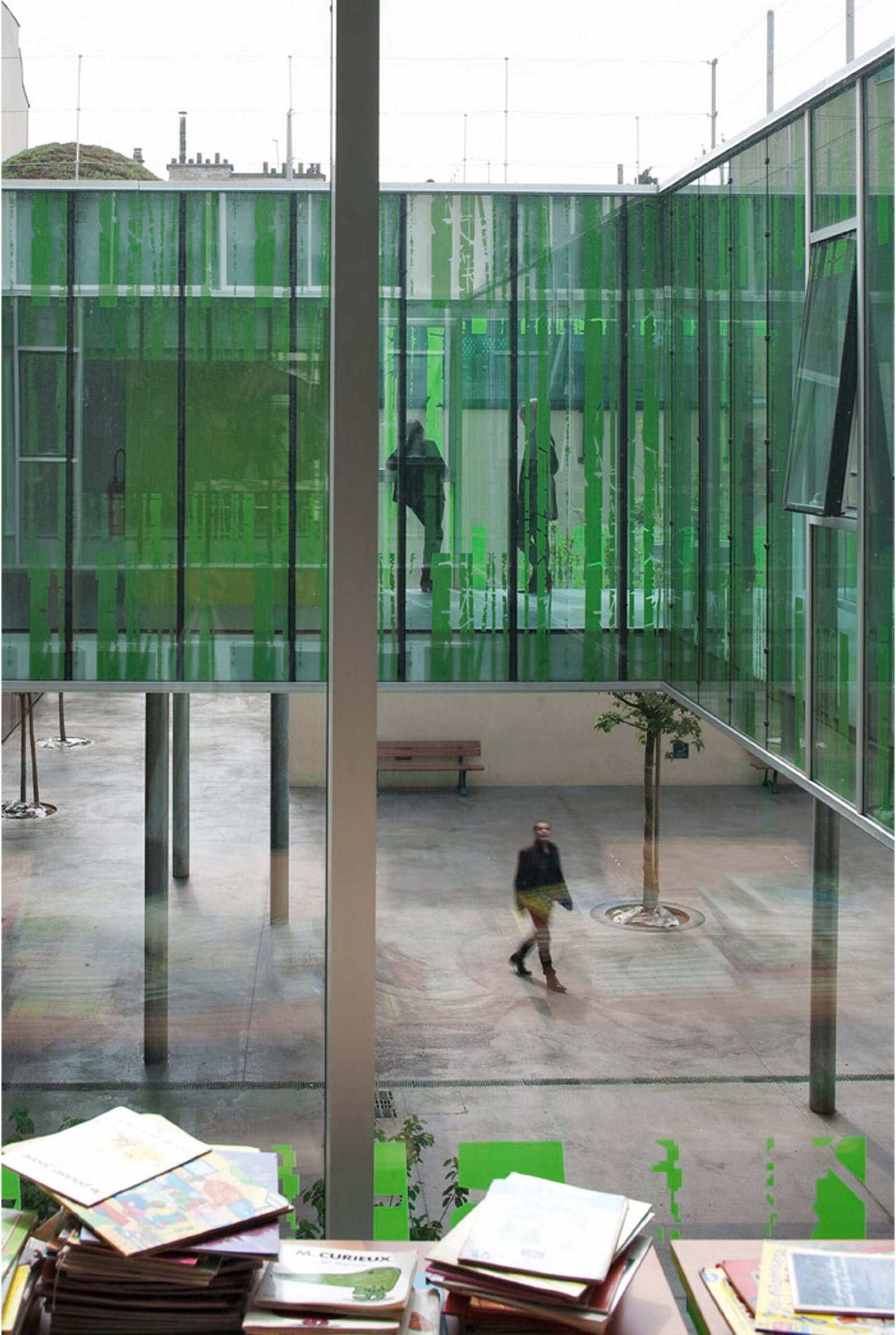 Il parvient à désamorcer l’étroitesse de la parcelle. En la trouant et la couvrant partiellement de ses sous-faces réfléchissantes, il vient qualifier la cour. Sur rue, le bâtiment s’élève à R+4 dans une logique de strates de pierre, verre, sérigraphies vertes, bareaudages et emalits aux diverses tendances de vert.