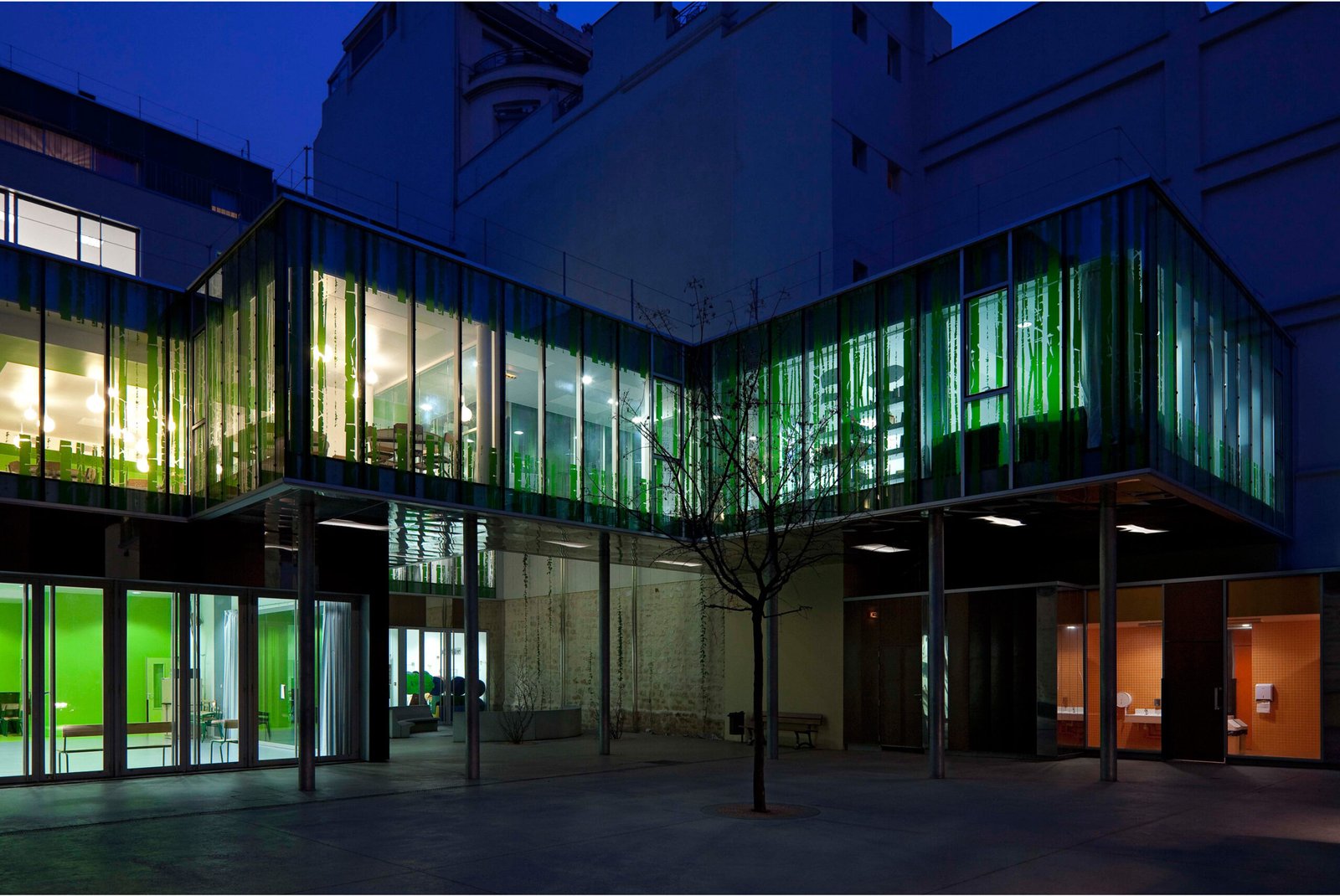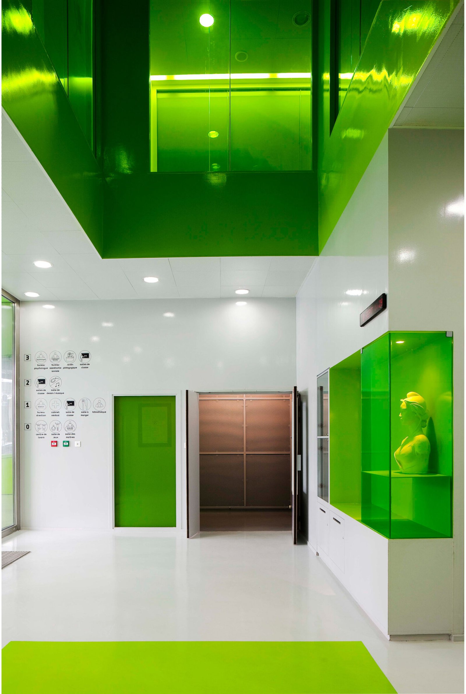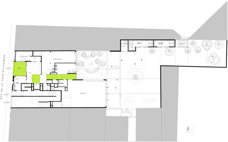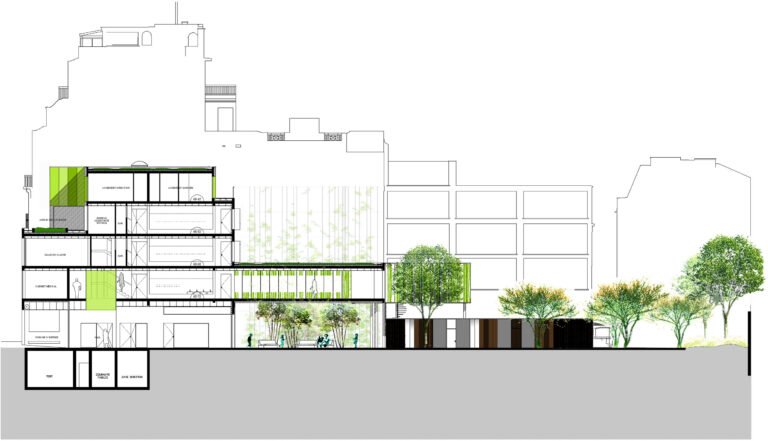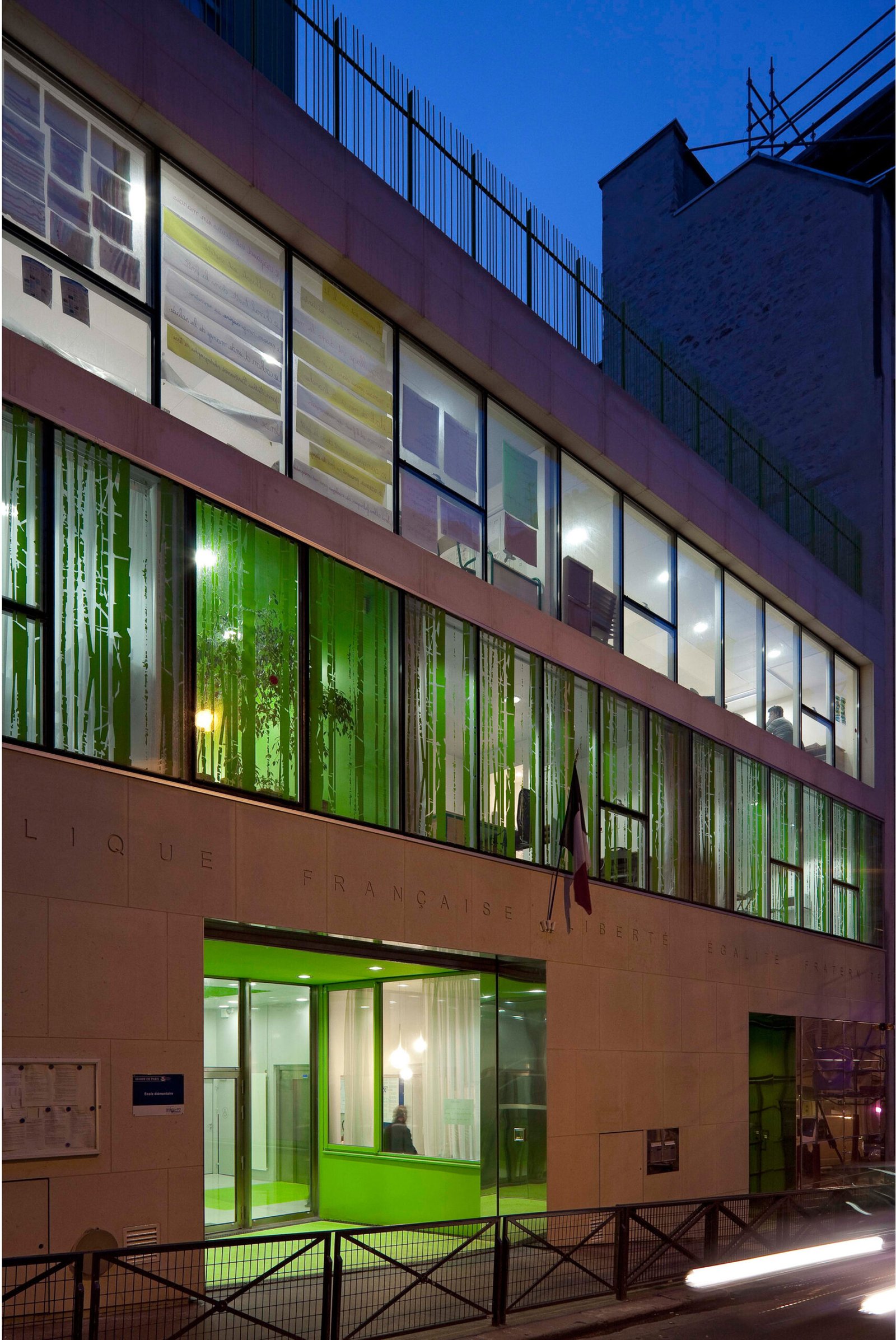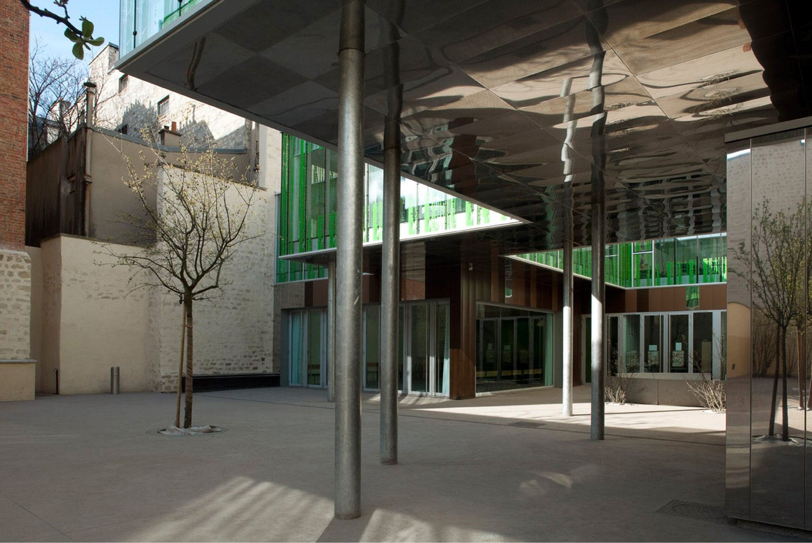Il parvient à désamorcer l’étroitesse de la parcelle. En la trouant et la couvrant partiellement de ses sous-faces réfléchissantes, il vient qualifier la cour. Sur rue, le bâtiment s’élève à R+4 dans une logique de strates de pierre, verre, sérigraphies vertes, bareaudages et emalits aux diverses tendances de vert.