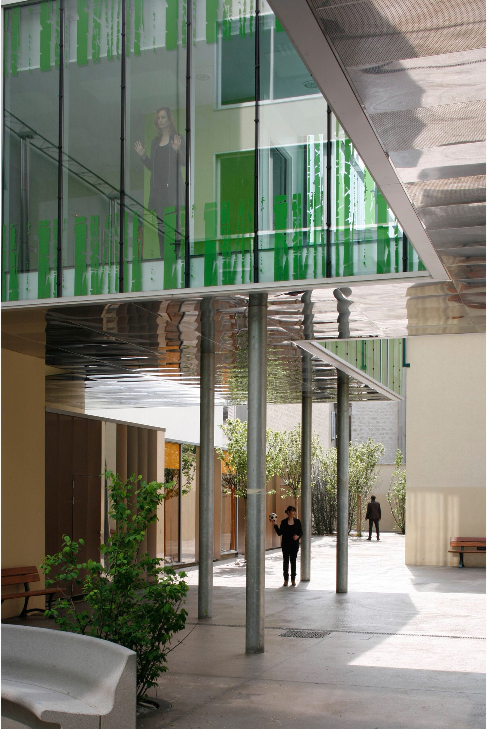 Lire la suite : École élémentaireLe serpentin métallique juché sur pilotis qui lèche les héberges à R+1 au gré des possibles occupations y crée des espaces différenciés. Ce serpentin qui accueille les lieux des espaces collectifs (restaurant et bibliothèque) permet de créer dans l’école des parcours et des séquences et d’échapper à l’ennui d’une organisation simple en étage. Dans la cour, il restitue une échelle que les enfants peuvent s’approprier.