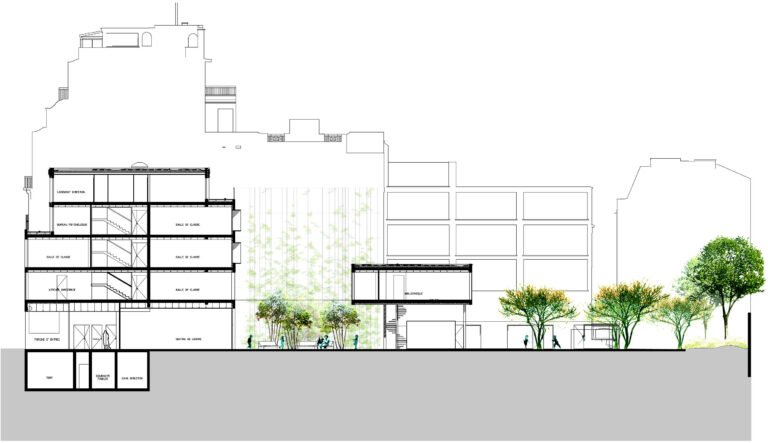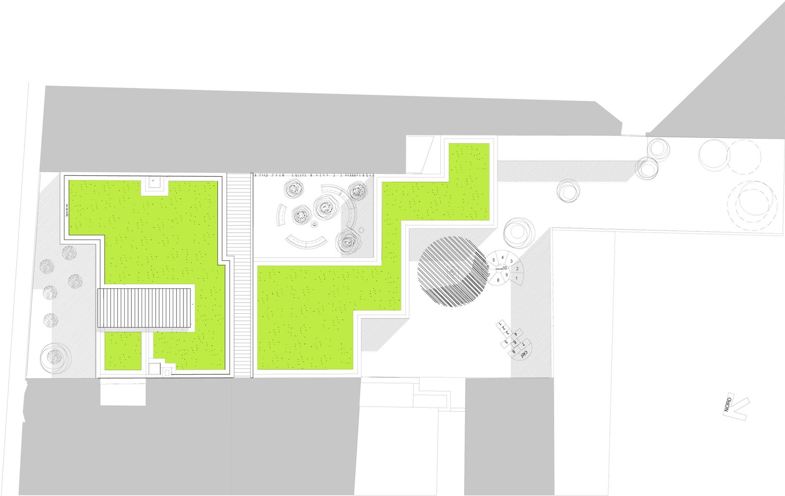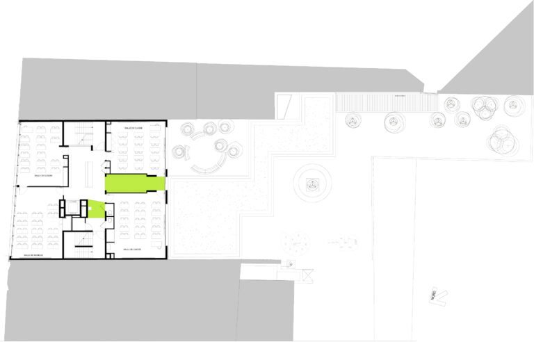 La problématique de l’échelle était sérieuse. Impossible de surenchérir dans la verticalité : nous avons dès lors choisi de composer un paysage de strates, horizontal, et de déjouer la règle du gradinage du sol. La cour a pu être maintenue en un plan unique et horizontal.