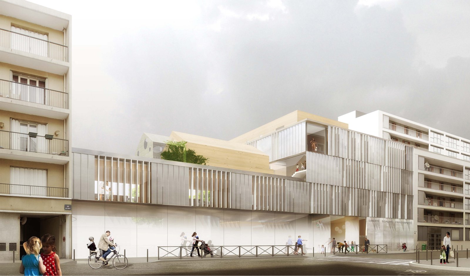 Depuis la rue, l’école se soulève pour accueillir le hall.