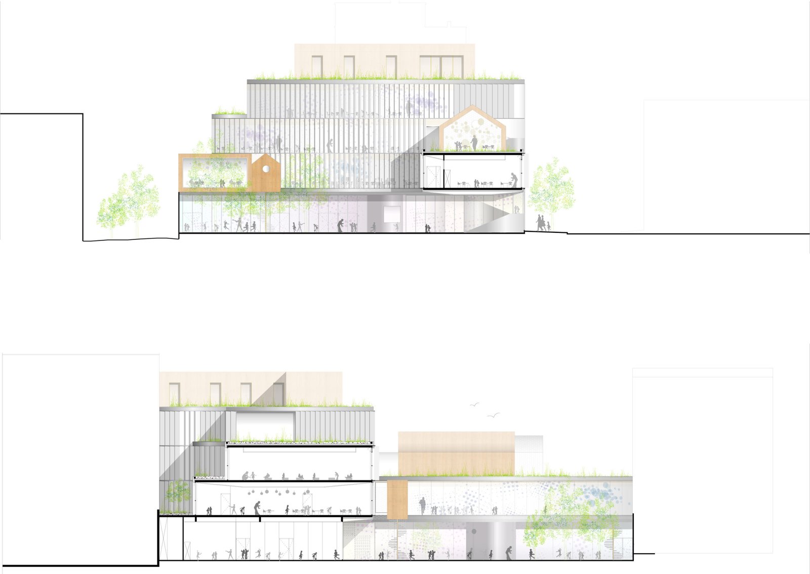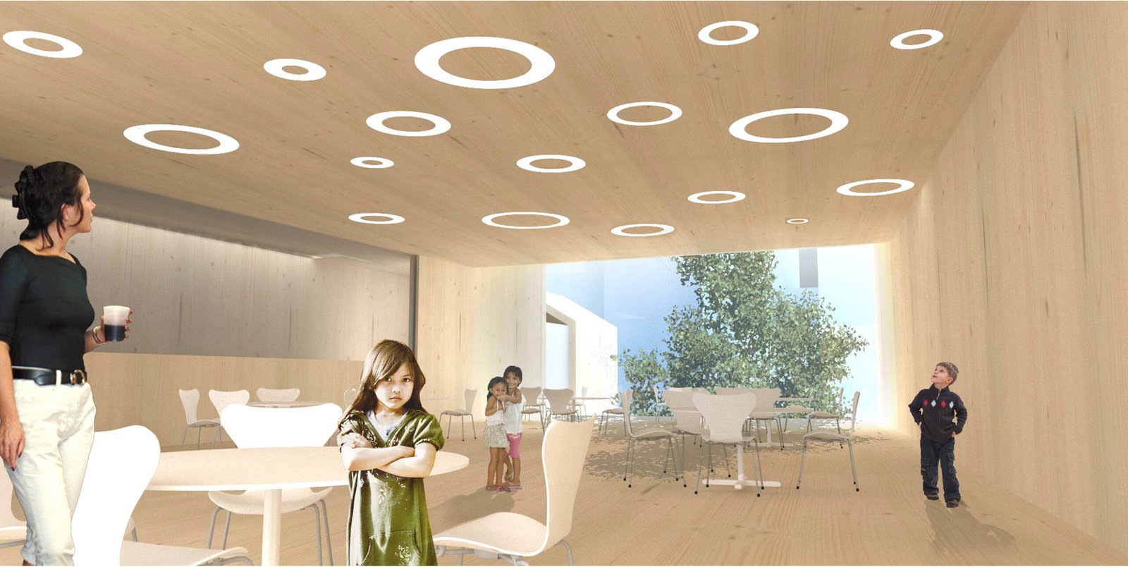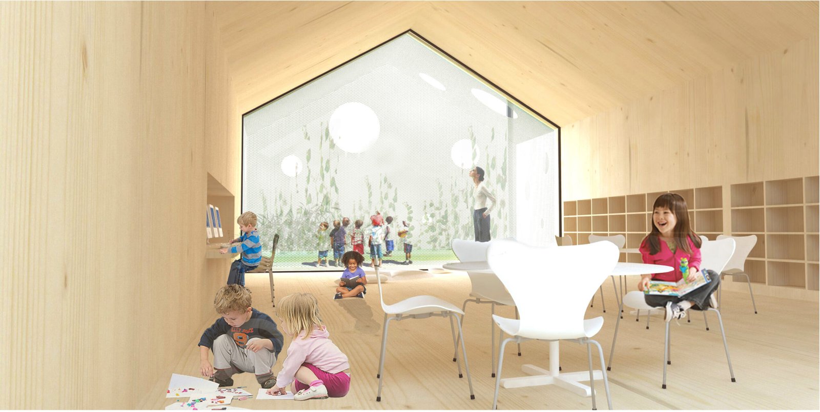 La salle de lecture, la salle de restauration, les logements de fonctions ponctuent le bâti par un traitement architectural particulier. Cette mise en scène des usages offre une facilité de repérage pour les enfants et engendre un bâtiment né de l’hybridation des paramètres urbains et programmatiques.