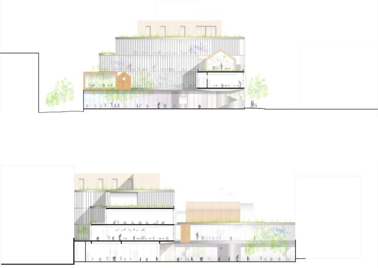 Cette large percée horizontale relie visuellement les éléments du programme avec l’environnement alentour et sculpte le vide pour dynamiser l’espace public.