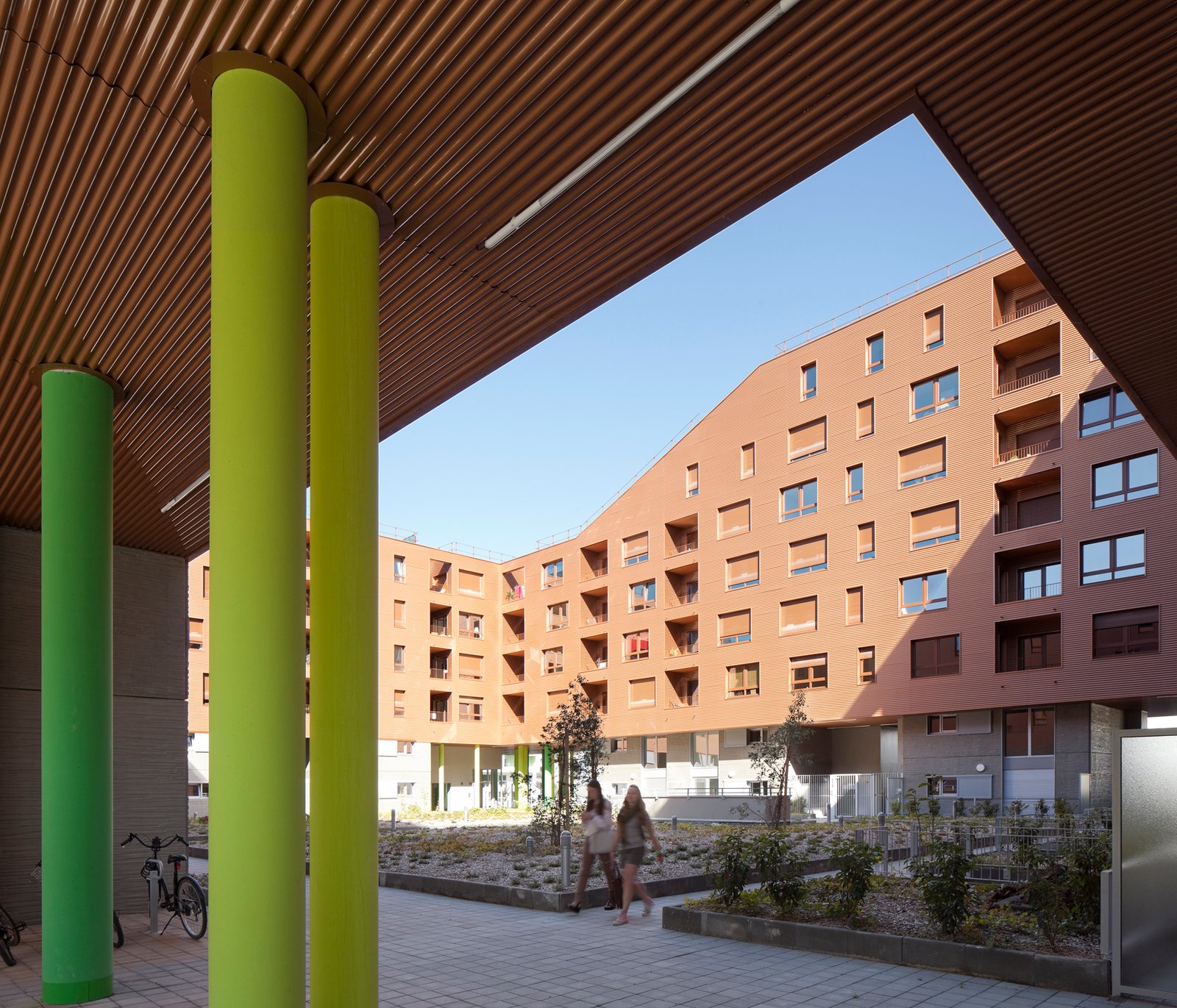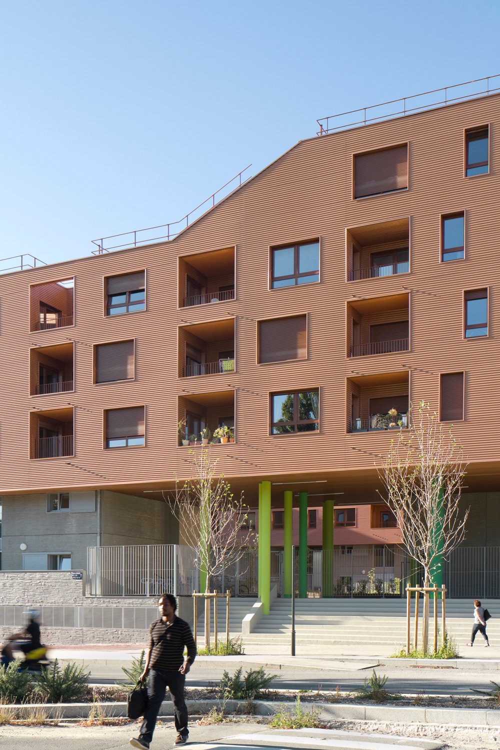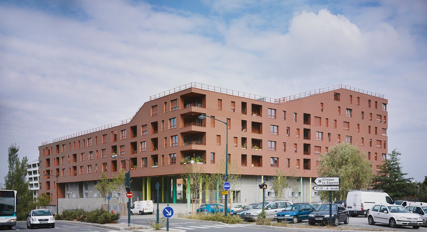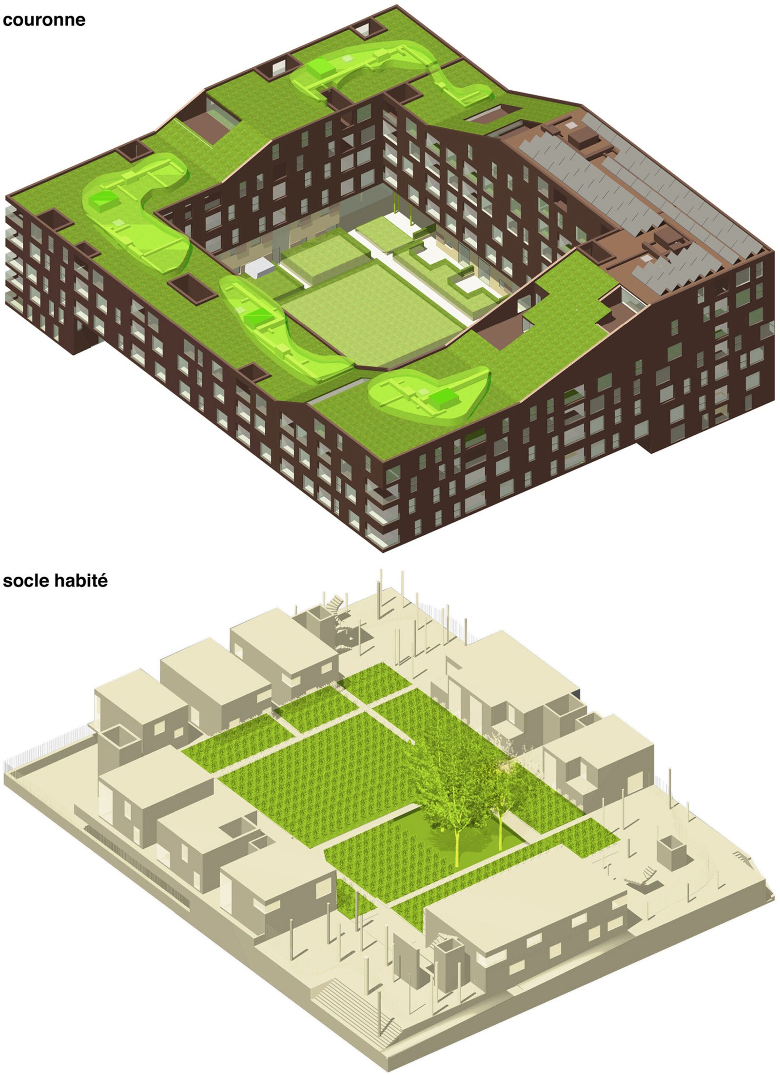 La forme est singulière. Le socle habité rassemble des parkings semi-enterrés, des néo-pavillons en duplex avec accès individuels et des halls organisés autour d’un patio central. La couronne avec son bardage métallique lisse abrite la grande échelle des logements collectifs aux typologies très variées. Ils sont pourvus d’espaces extérieurs en loggias sur jardin.