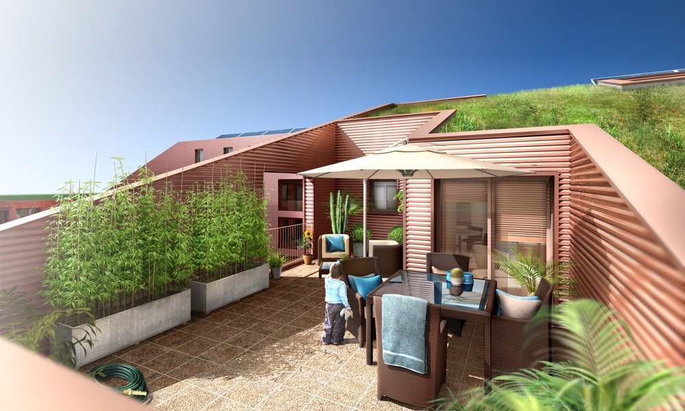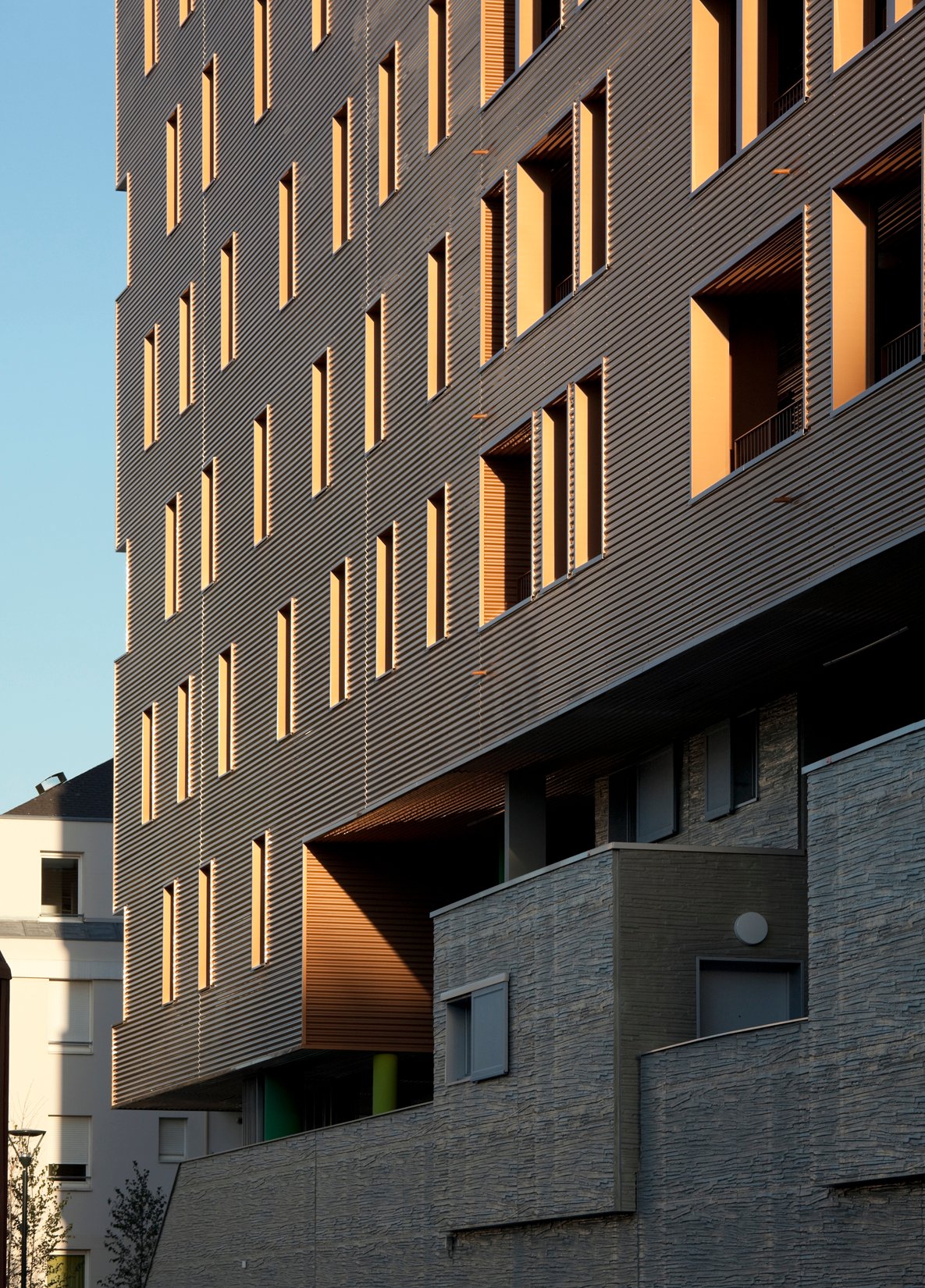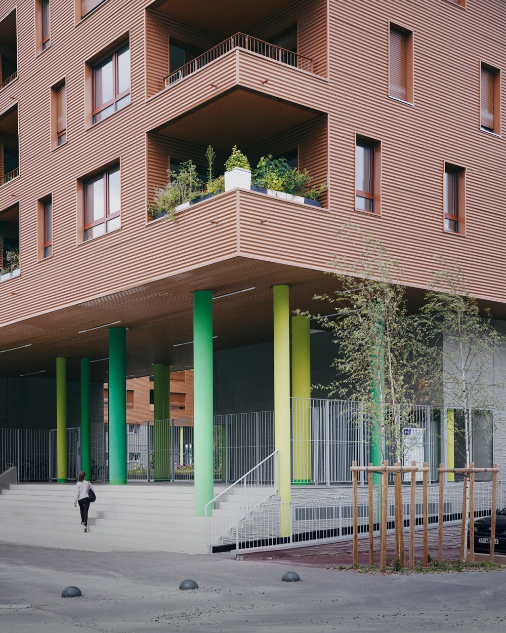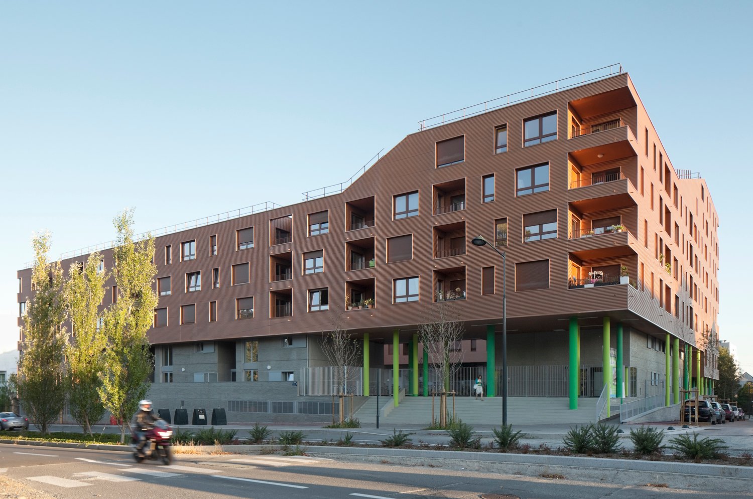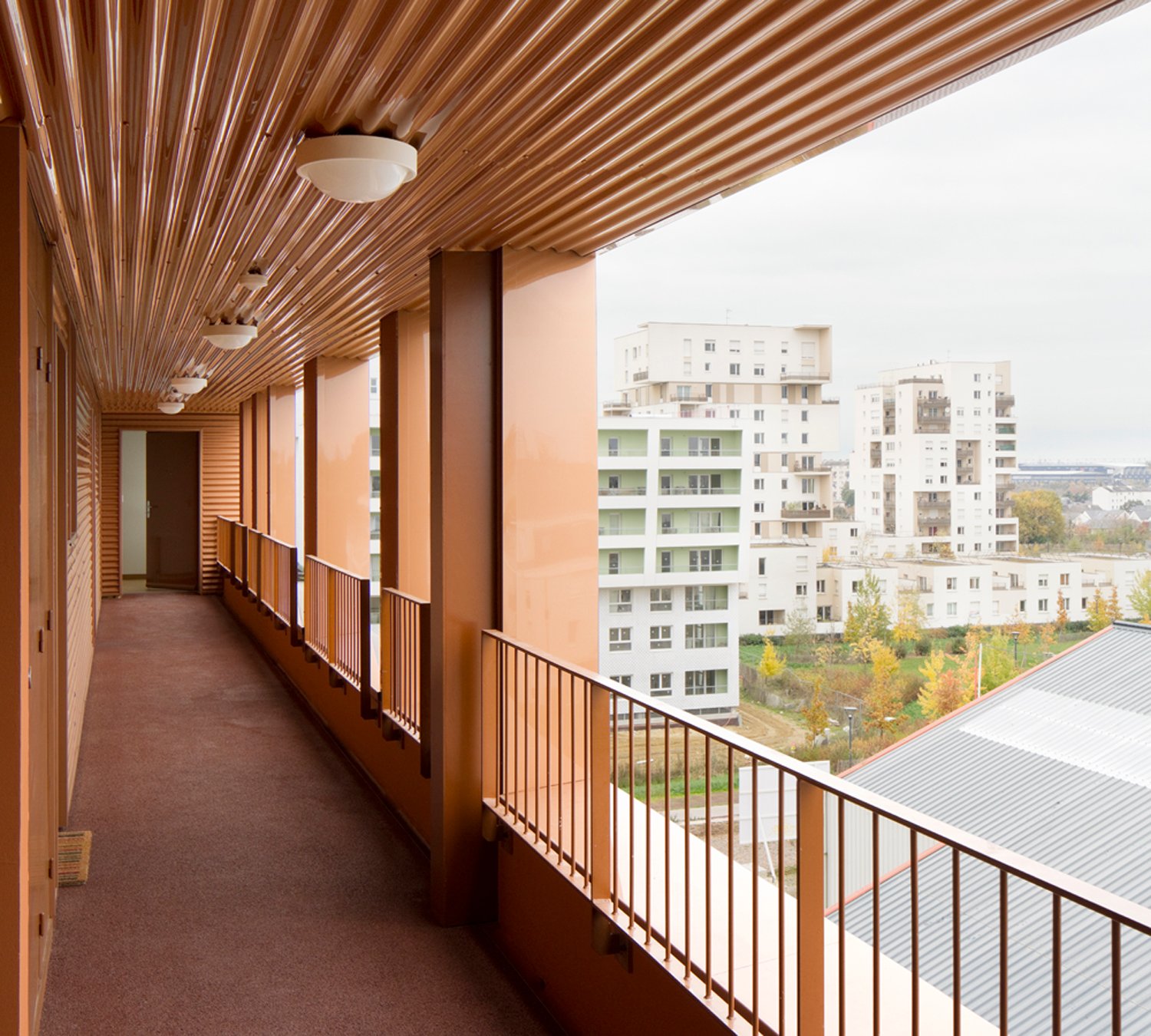 La forme est singulière. Le socle habité rassemble des parkings semi-enterrés, des néo-pavillons en duplex avec accès individuels et des halls organisés autour d’un patio central. La couronne avec son bardage métallique lisse abrite la grande échelle des logements collectifs aux typologies très variées. Ils sont pourvus d’espaces extérieurs en loggias sur jardin.