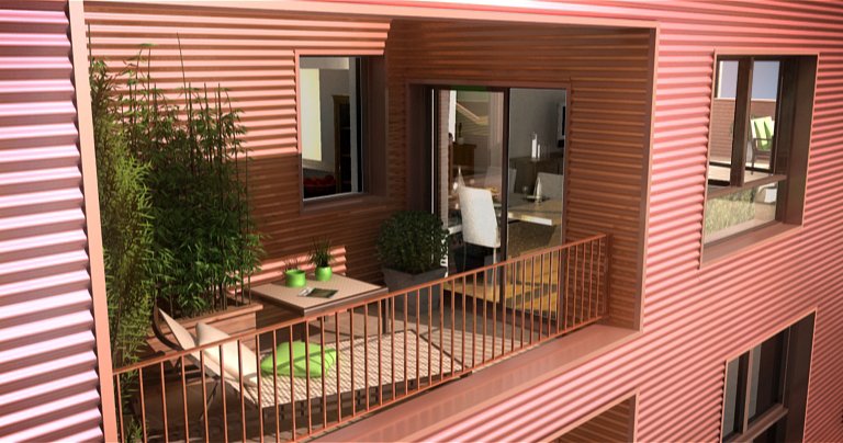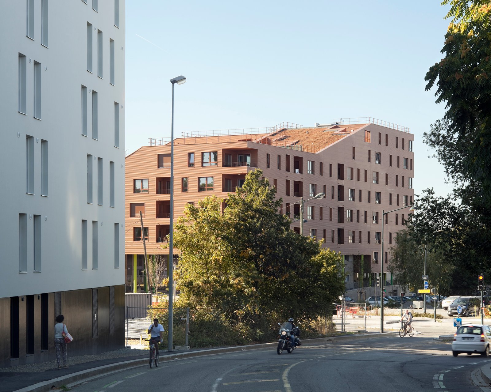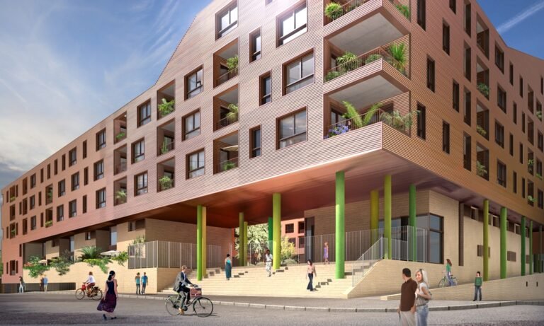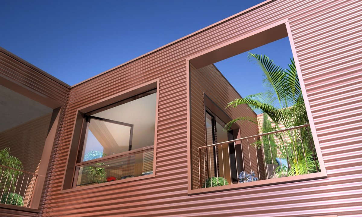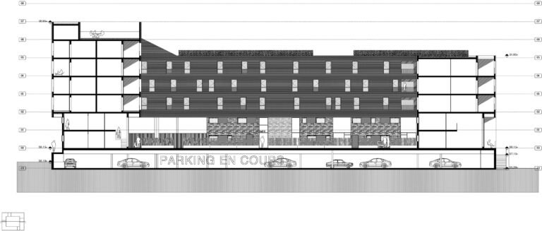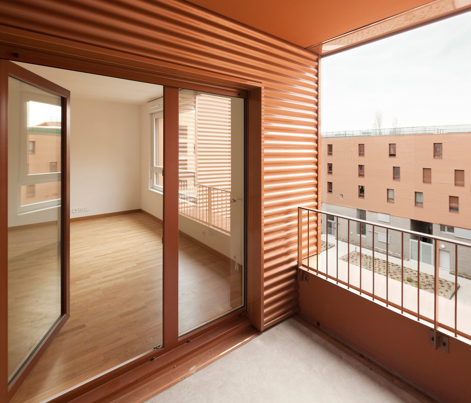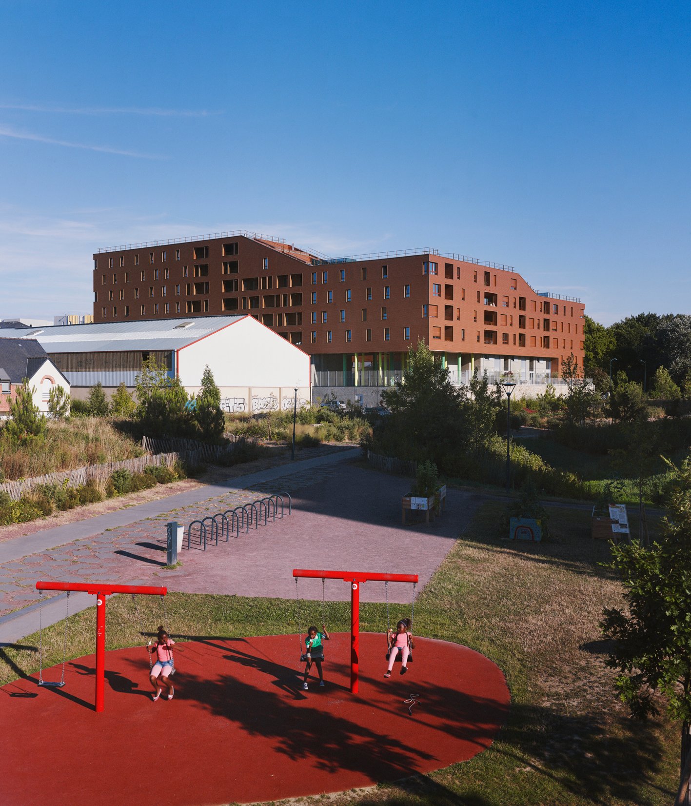 La forme est singulière. Le socle habité rassemble des parkings semi-enterrés, des néo-pavillons en duplex avec accès individuels et des halls organisés autour d’un patio central. La couronne avec son bardage métallique lisse abrite la grande échelle des logements collectifs aux typologies très variées. Ils sont pourvus d’espaces extérieurs en loggias sur jardin.