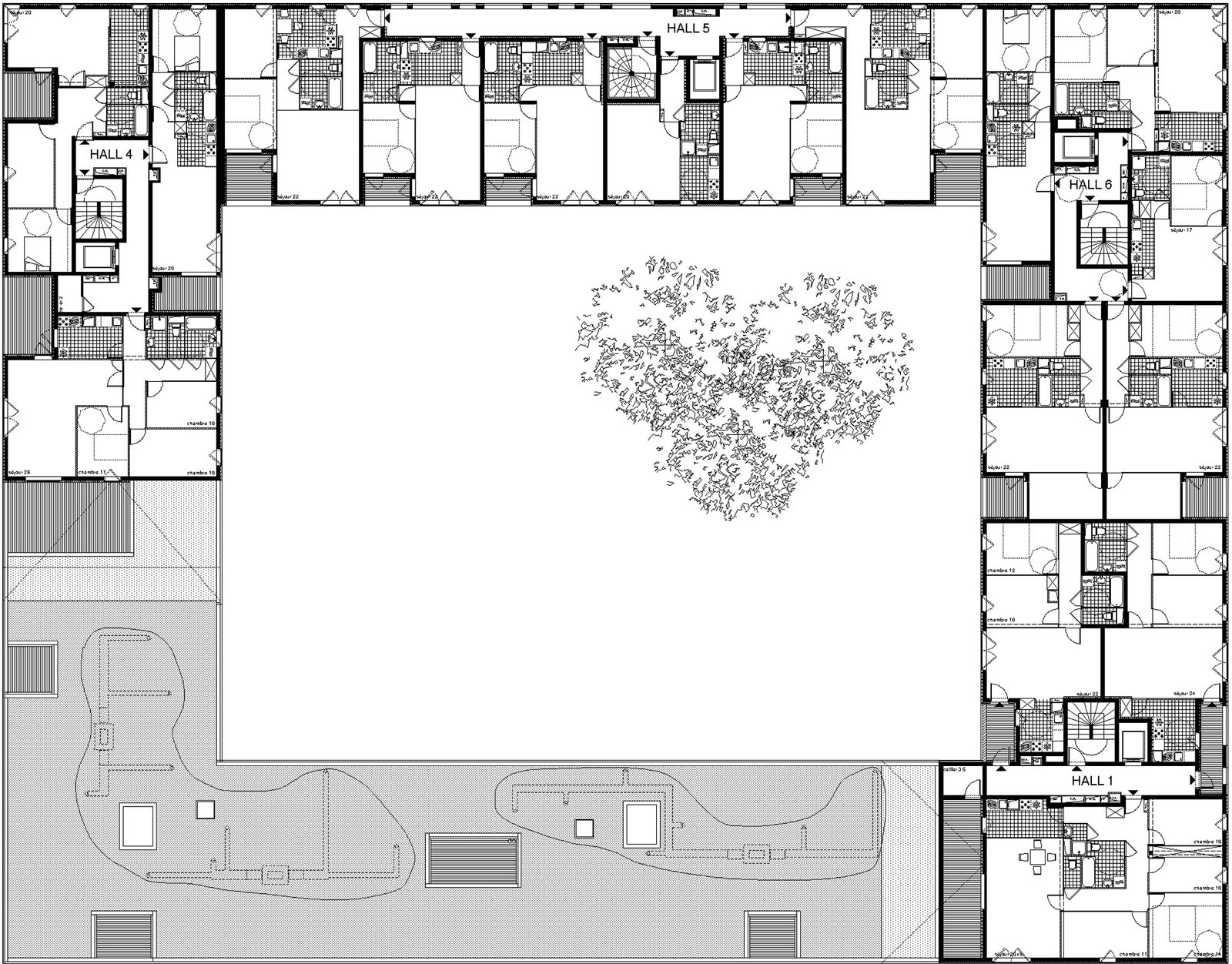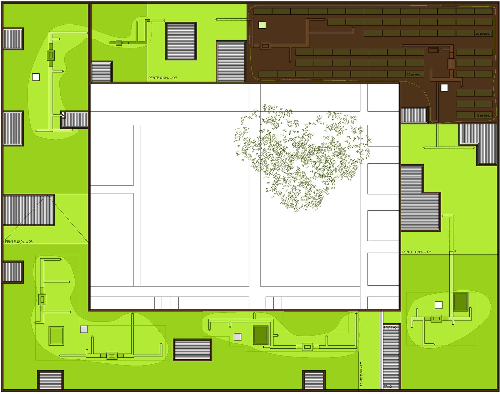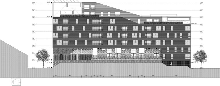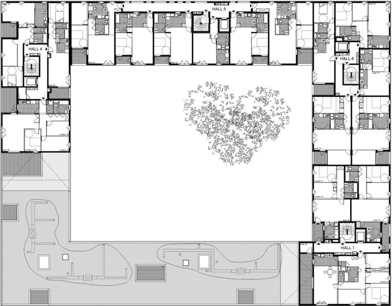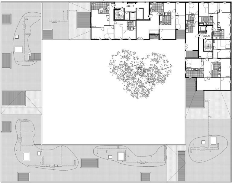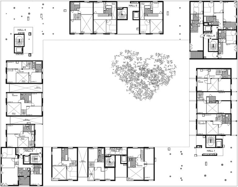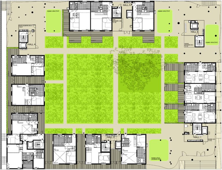 Nous nous inspirons des gabarits urbains alentour pour dessiner une figure communautaire enroulée autour d’un jardin intérieur en pleine terre.