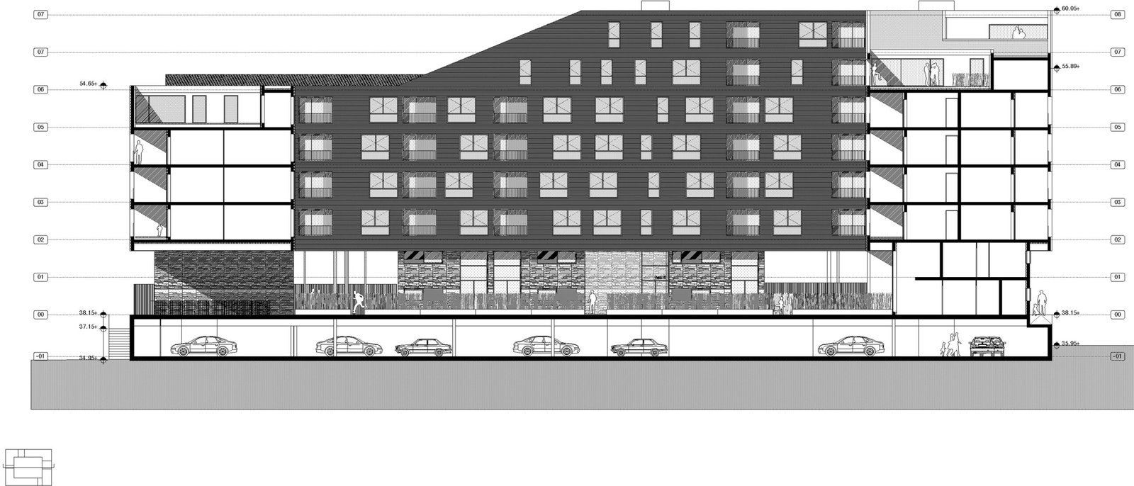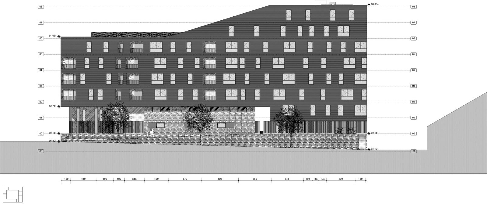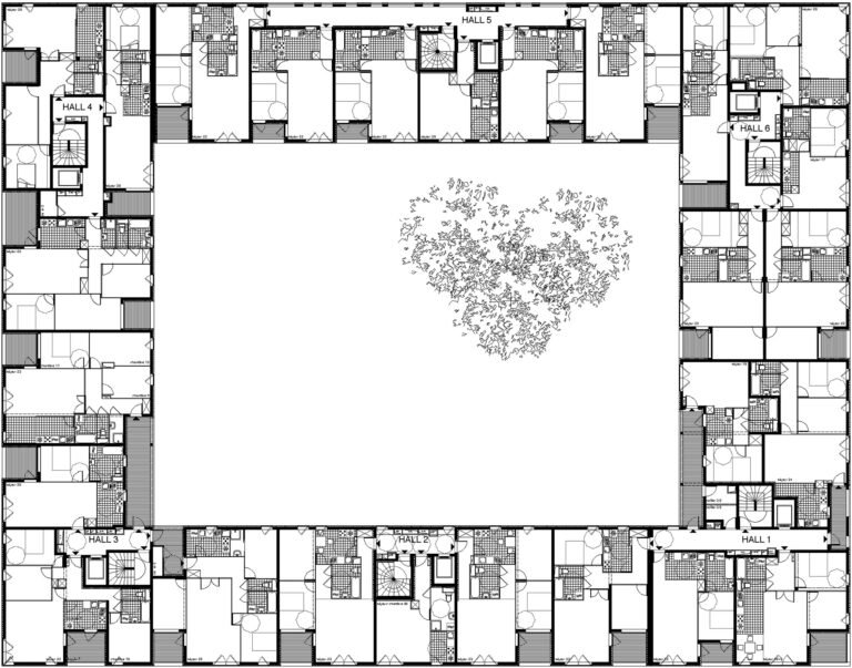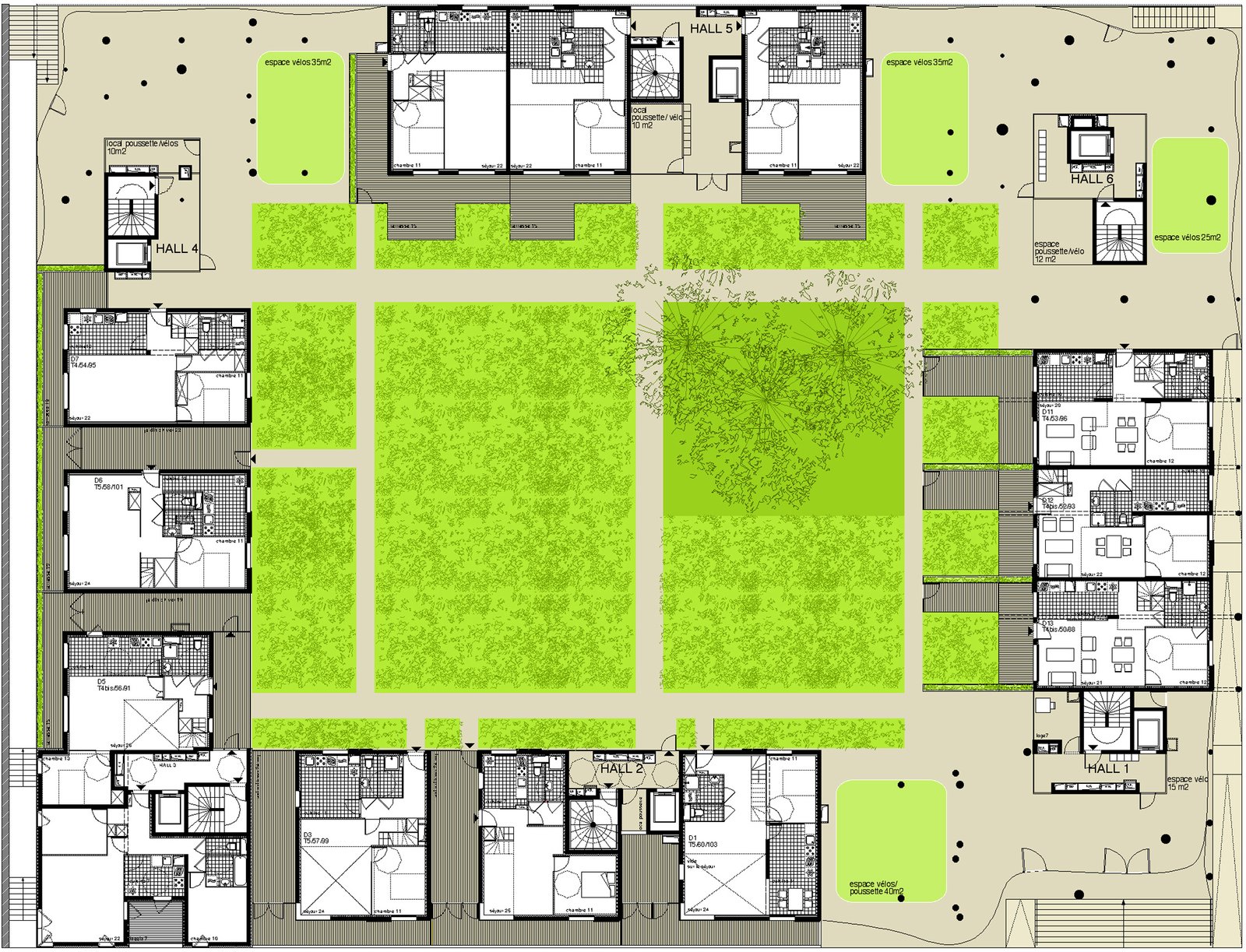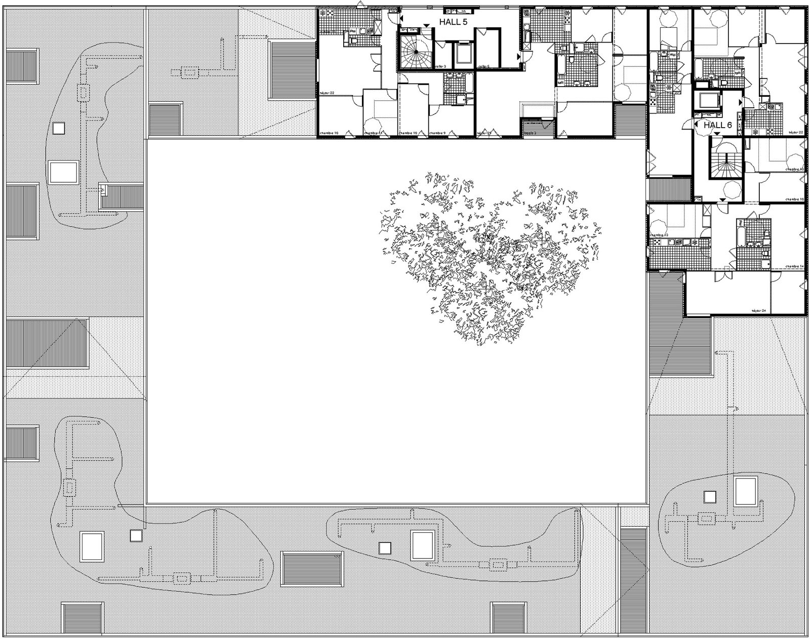 Nous nous inspirons des gabarits urbains alentour pour dessiner une figure communautaire enroulée autour d’un jardin intérieur en pleine terre.