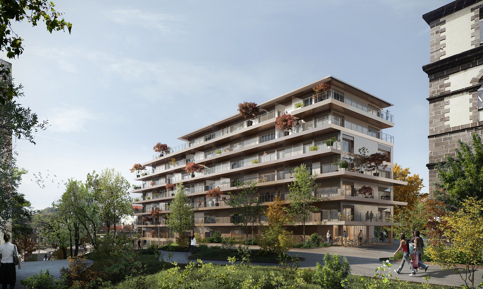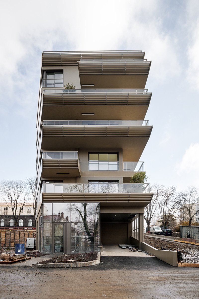La parcelle induisant une volumétrie élancée d’est en ouest, s’insère entre deux espaces boisés classés. Sa volumétrie s’affine en proue à l’ouest et vient marquer l’entrée de la parcelle sur le boulevard Charles de Gaulle. Il prend place dans une topographie accidentée avec un fort dénivelé ce qui lui permet d’avoir deux accès piétons distincts sur deux niveaux différents, l’un à l’est et le second en proue à l’ouest. Le bâtiment qui s’élève en R+5 à l’ouest dialogue avec la polyclinique, et en R+6 à l’est répond au bâtiment Rousseau.