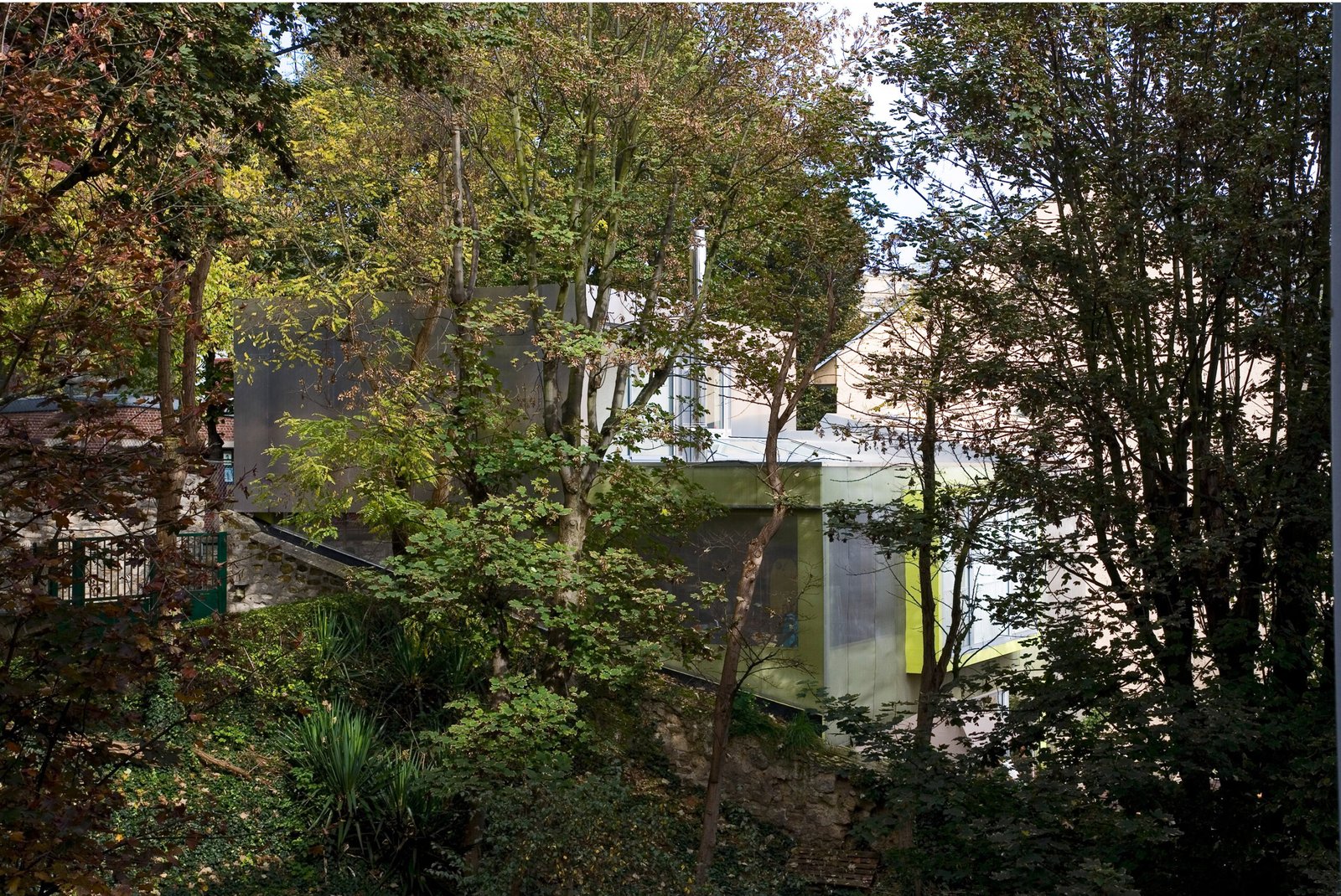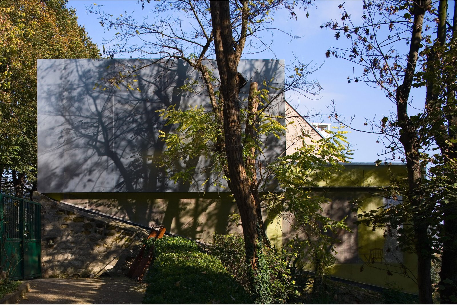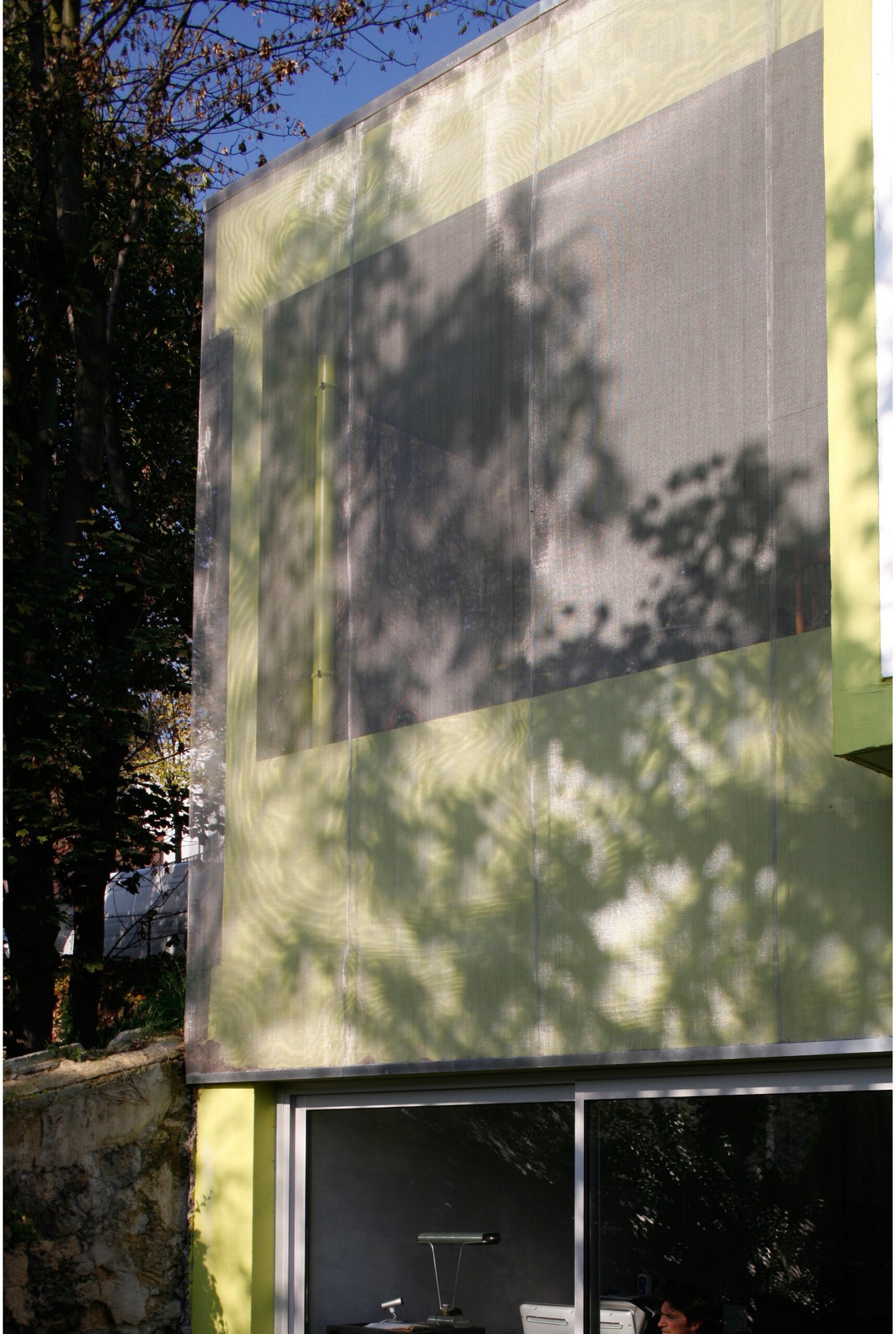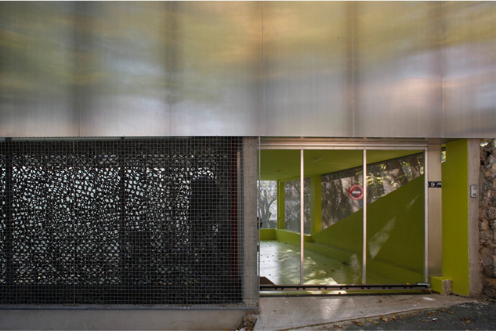 Entièrement carrossée de plaque d’aluminium de 3mm d’épaisseur côté rue, elle se transforme progressivement côté-jardin pour être revêtue d’une fine maille d’inox tressé qui recouvre la structure béton peinte dans un vert – jaune proche de la tonalité des végétaux environnants. Cette superposition des matières et les reflets de la lumière et du paysage sur l’inox et l’aluminium tendent à dématérialiser la maison et à la fondre dans son environnement.