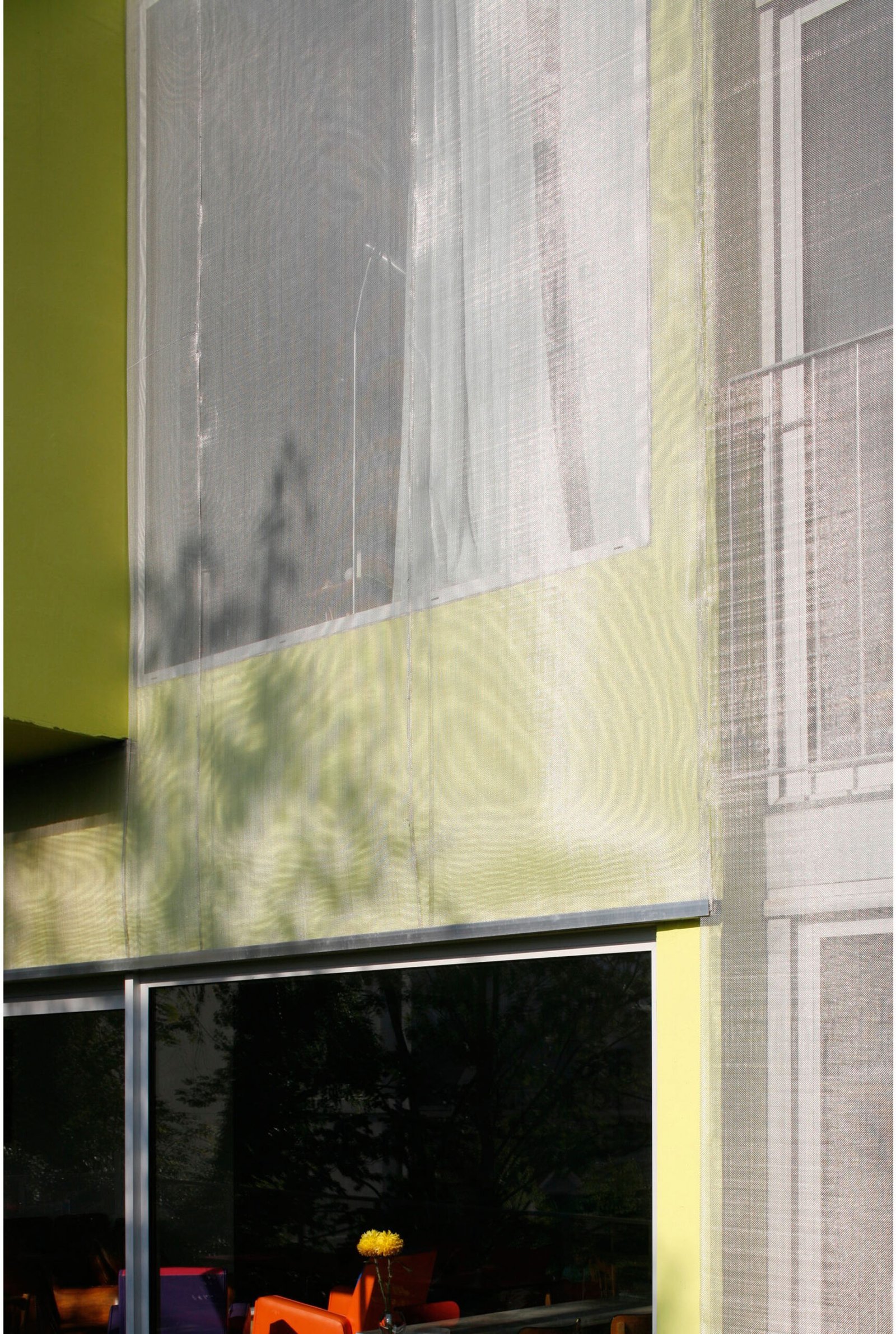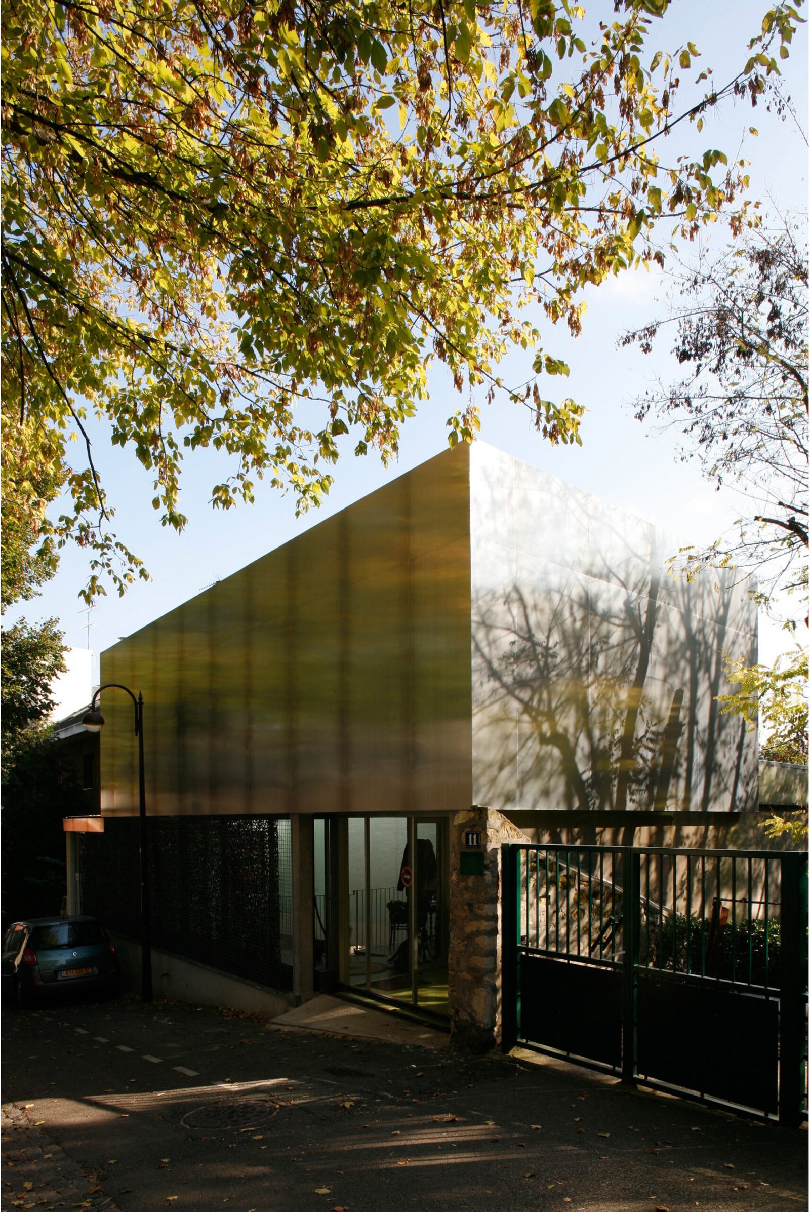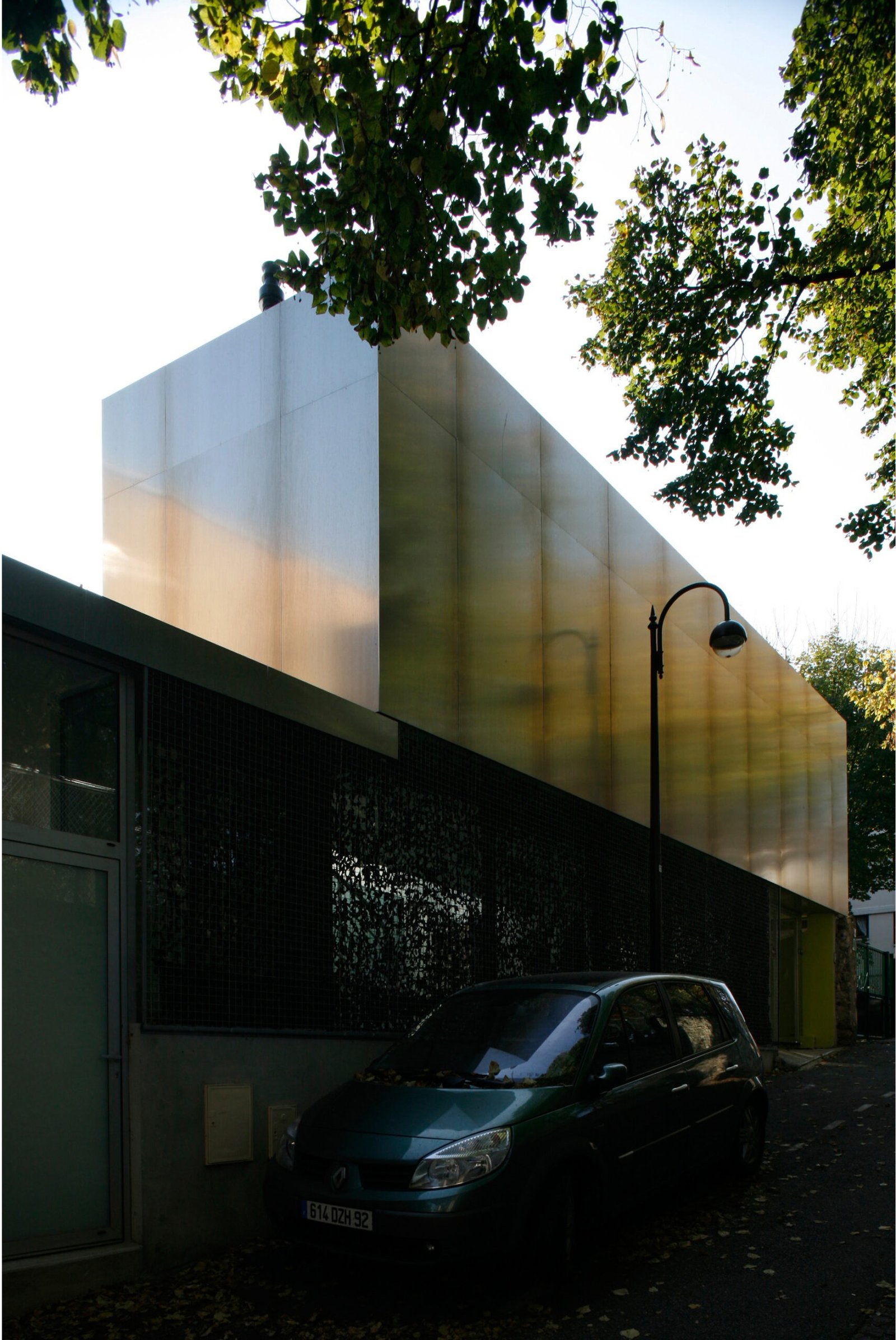 Entièrement carrossée de plaque d’aluminium de 3mm d’épaisseur côté rue, elle se transforme progressivement côté-jardin pour être revêtue d’une fine maille d’inox tressé qui recouvre la structure béton peinte dans un vert – jaune proche de la tonalité des végétaux environnants. Cette superposition des matières et les reflets de la lumière et du paysage sur l’inox et l’aluminium tendent à dématérialiser la maison et à la fondre dans son environnement.