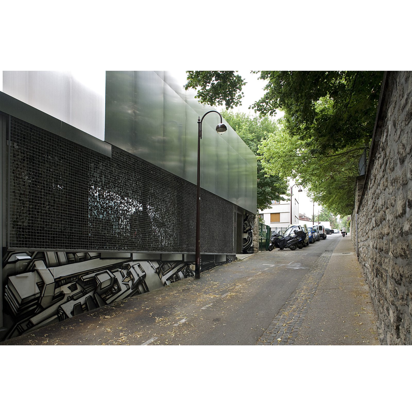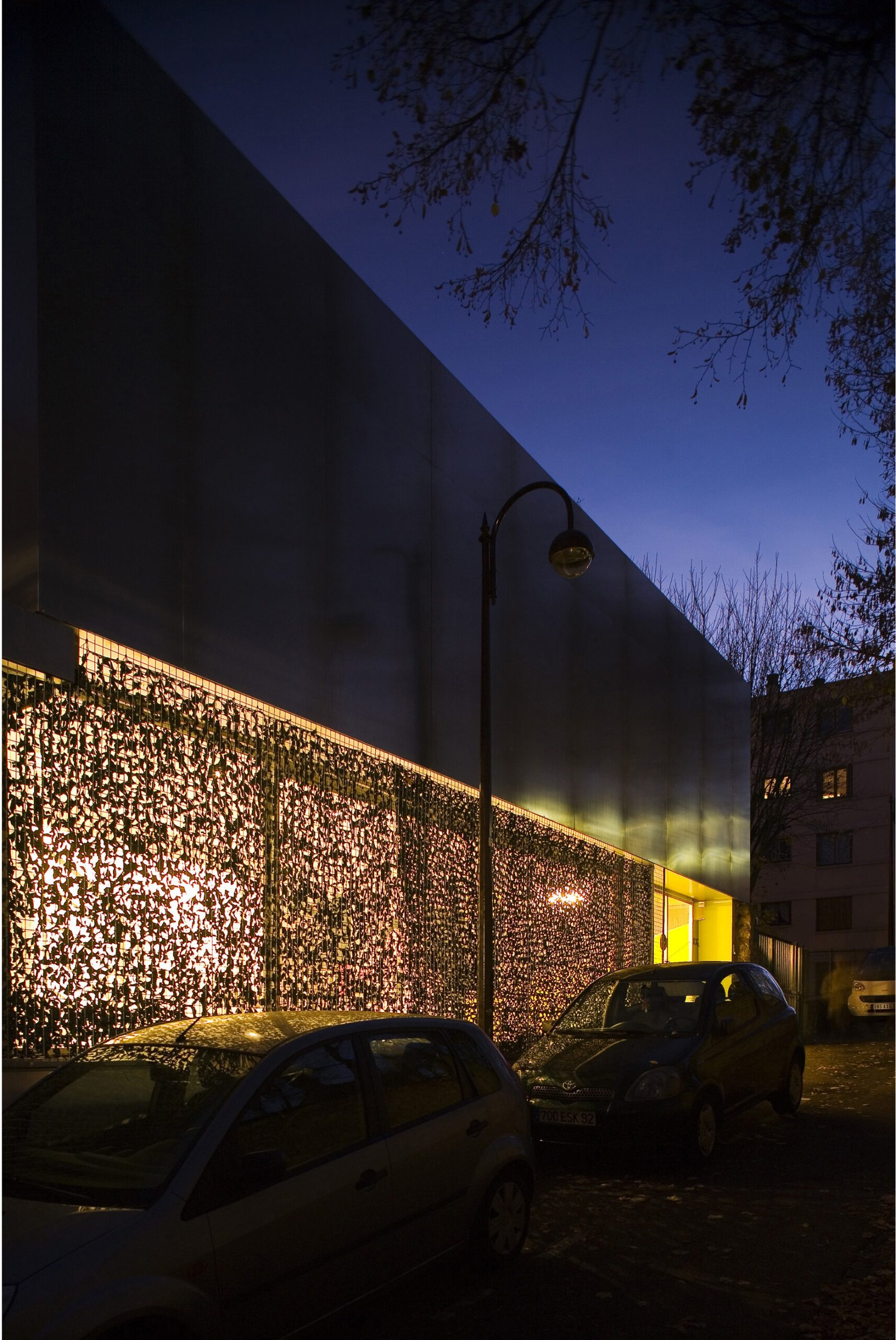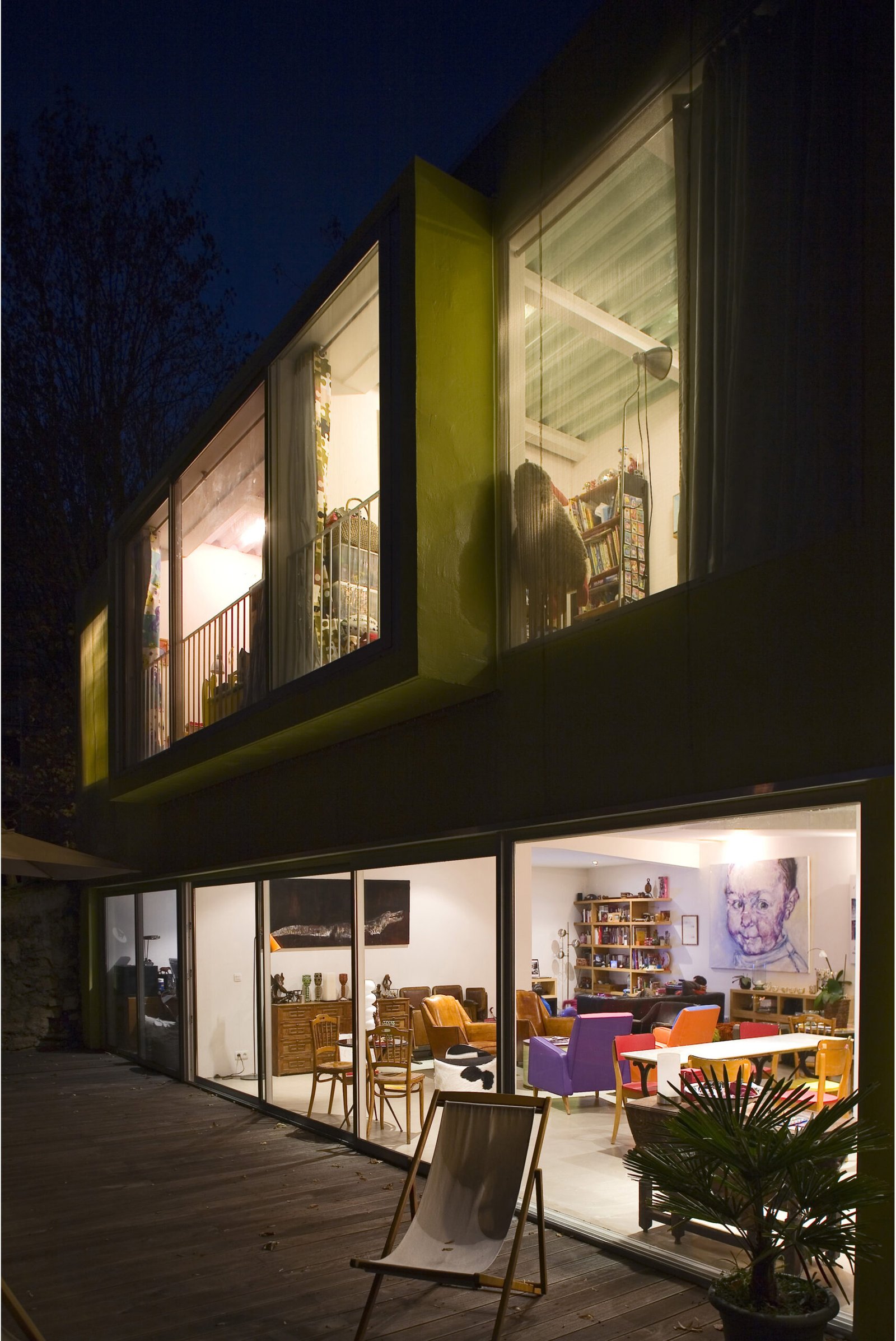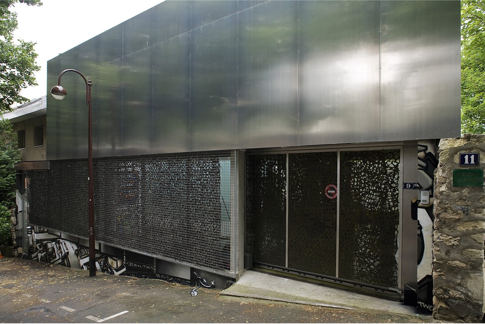 Entièrement carrossée de plaque d’aluminium de 3mm d’épaisseur côté rue, elle se transforme progressivement côté-jardin pour être revêtue d’une fine maille d’inox tressé qui recouvre la structure béton peinte dans un vert – jaune proche de la tonalité des végétaux environnants. Cette superposition des matières et les reflets de la lumière et du paysage sur l’inox et l’aluminium tendent à dématérialiser la maison et à la fondre dans son environnement.