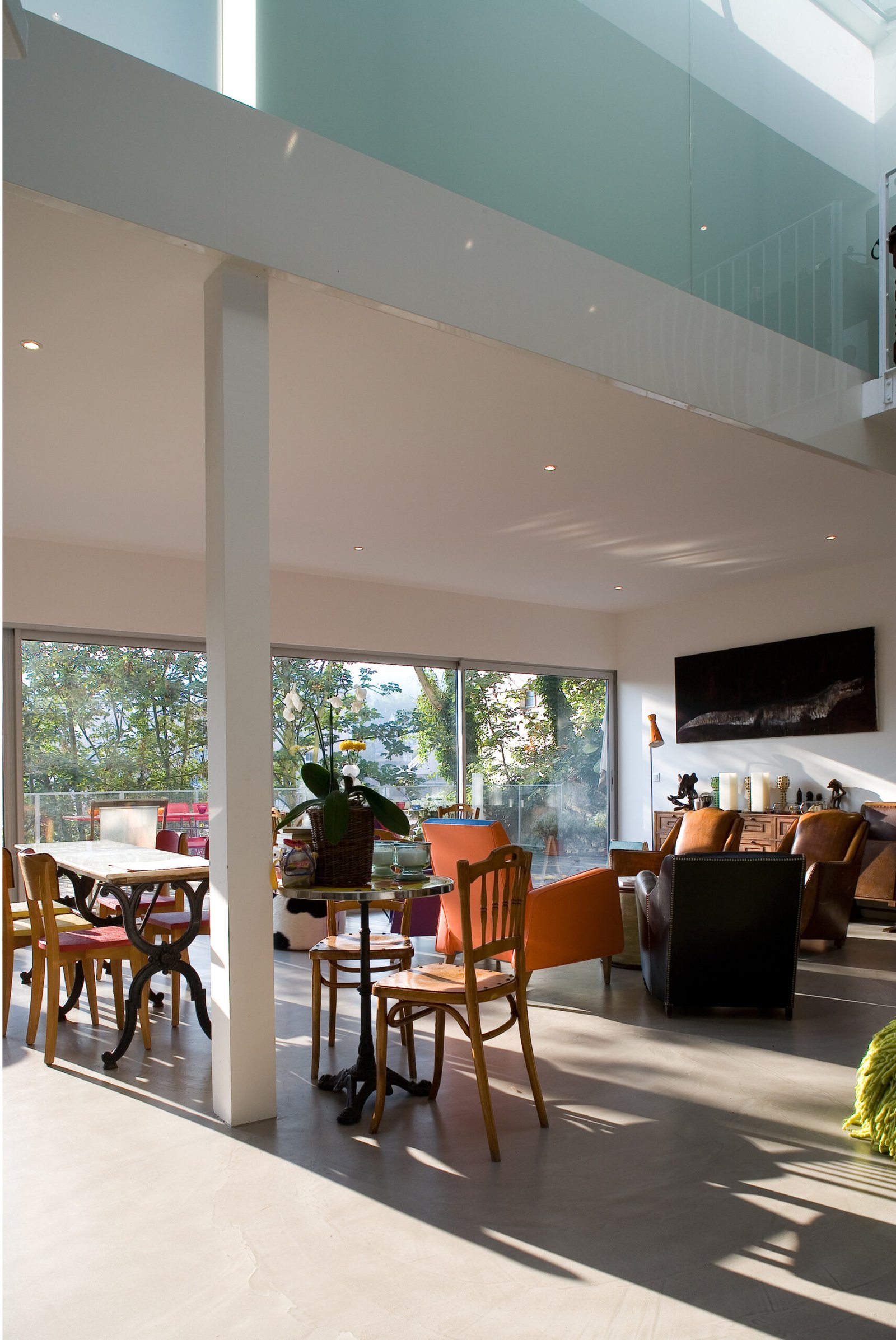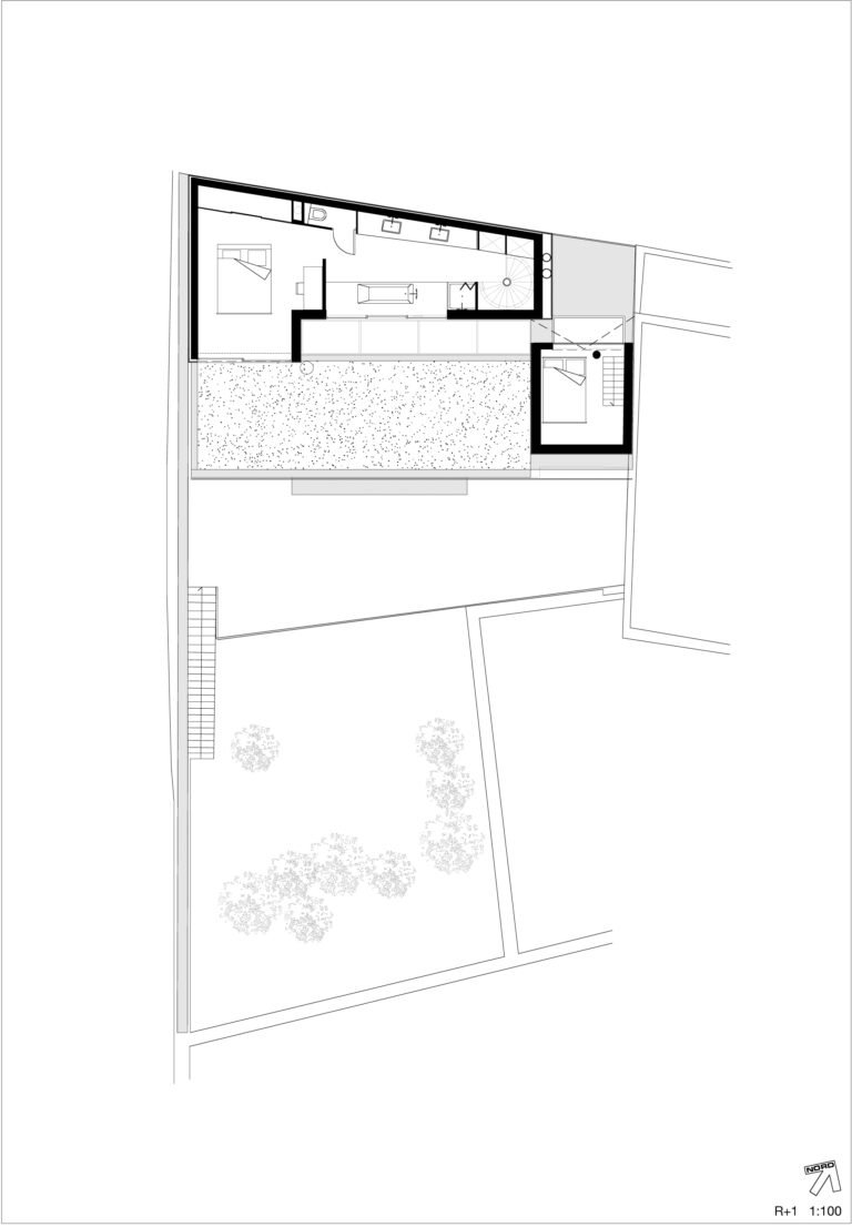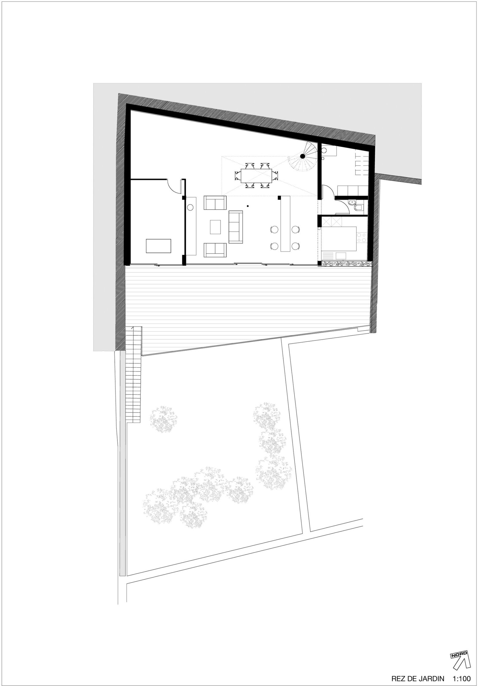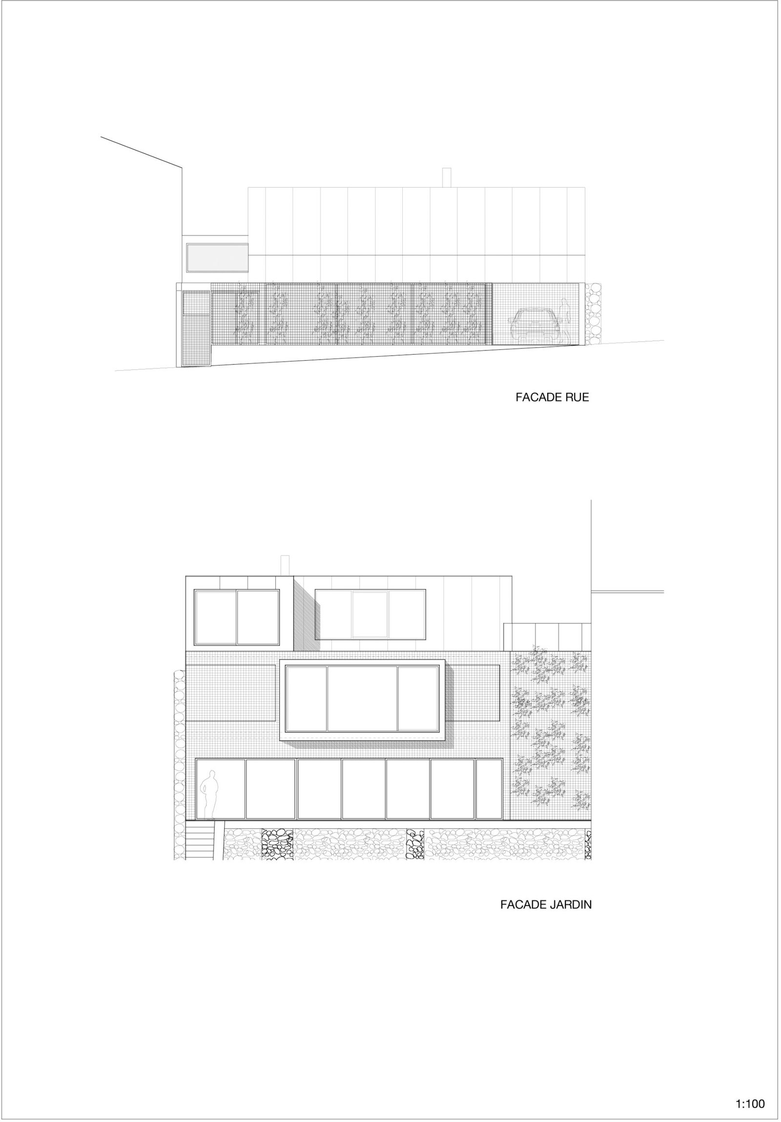 Au rez-de-jardin, le séjour, la cuisine, un bureau et un lieu de projection, s’ouvrent entièrement sur une immense terrasse en porte-à-faux dans les arbres du jardin. Orientée plein sud, la maison bénéficie d’un ensoleillement maximal en hiver et les arbres font office de filtres en été. Côté nord, sur la rue, tous les codes et références à la maison ont été volontairement effacés. Laissant à peine deviné à travers les filets de camouflage disposés derrière la maille inox, l’espace intérieur baigné de lumière naturelle.