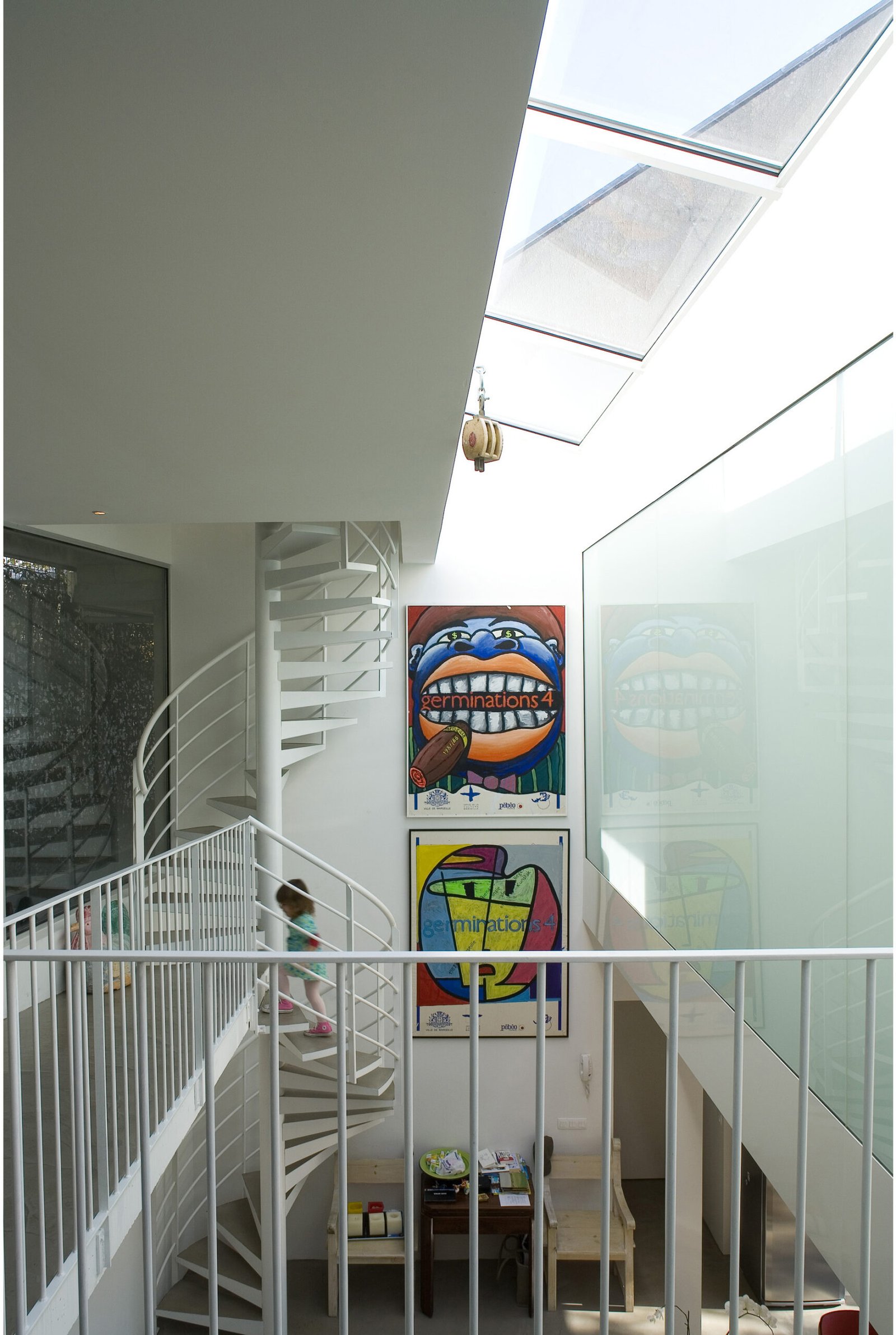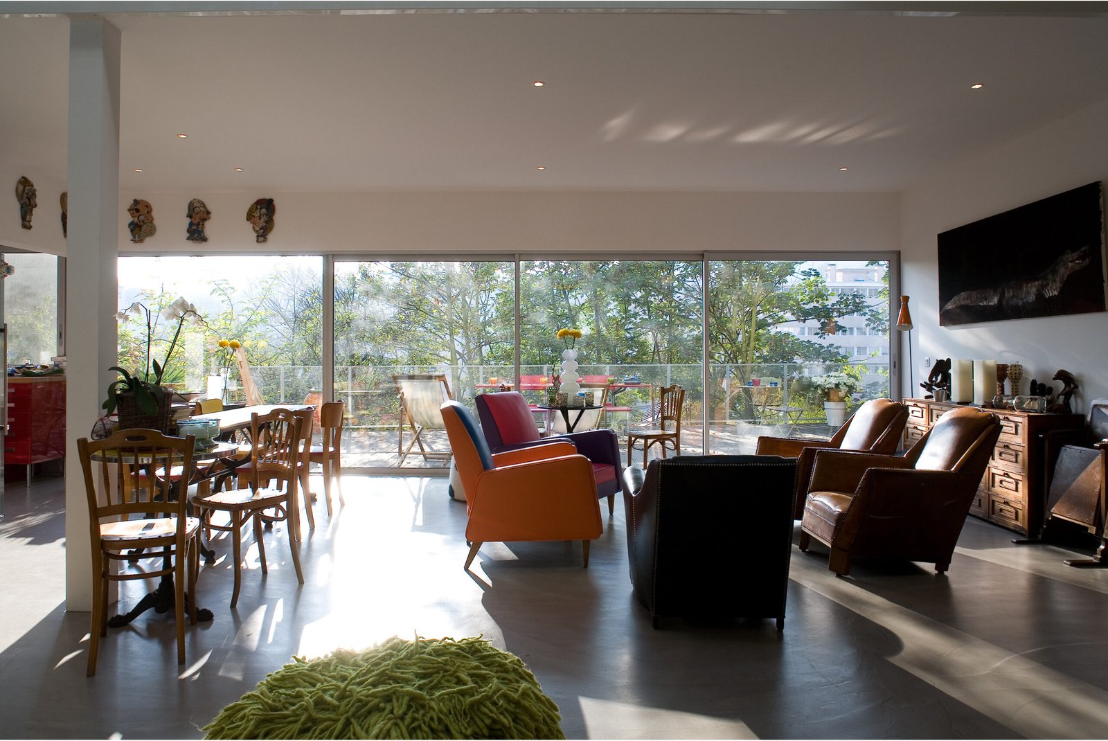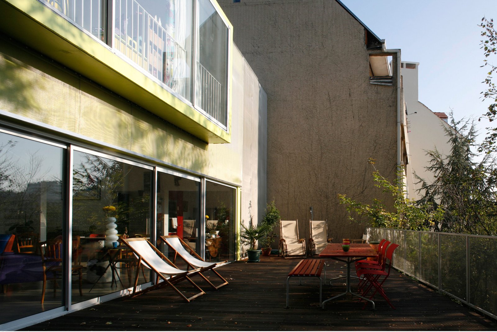 Au rez-de-jardin, le séjour, la cuisine, un bureau et un lieu de projection, s’ouvrent entièrement sur une immense terrasse en porte-à-faux dans les arbres du jardin. Orientée plein sud, la maison bénéficie d’un ensoleillement maximal en hiver et les arbres font office de filtres en été. Côté nord, sur la rue, tous les codes et références à la maison ont été volontairement effacés. Laissant à peine deviné à travers les filets de camouflage disposés derrière la maille inox, l’espace intérieur baigné de lumière naturelle.