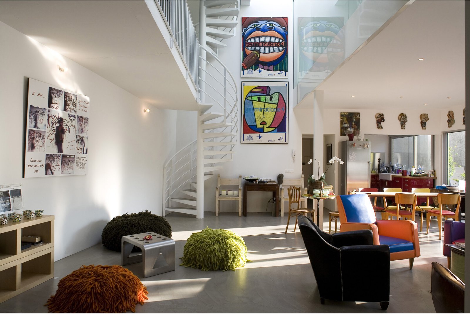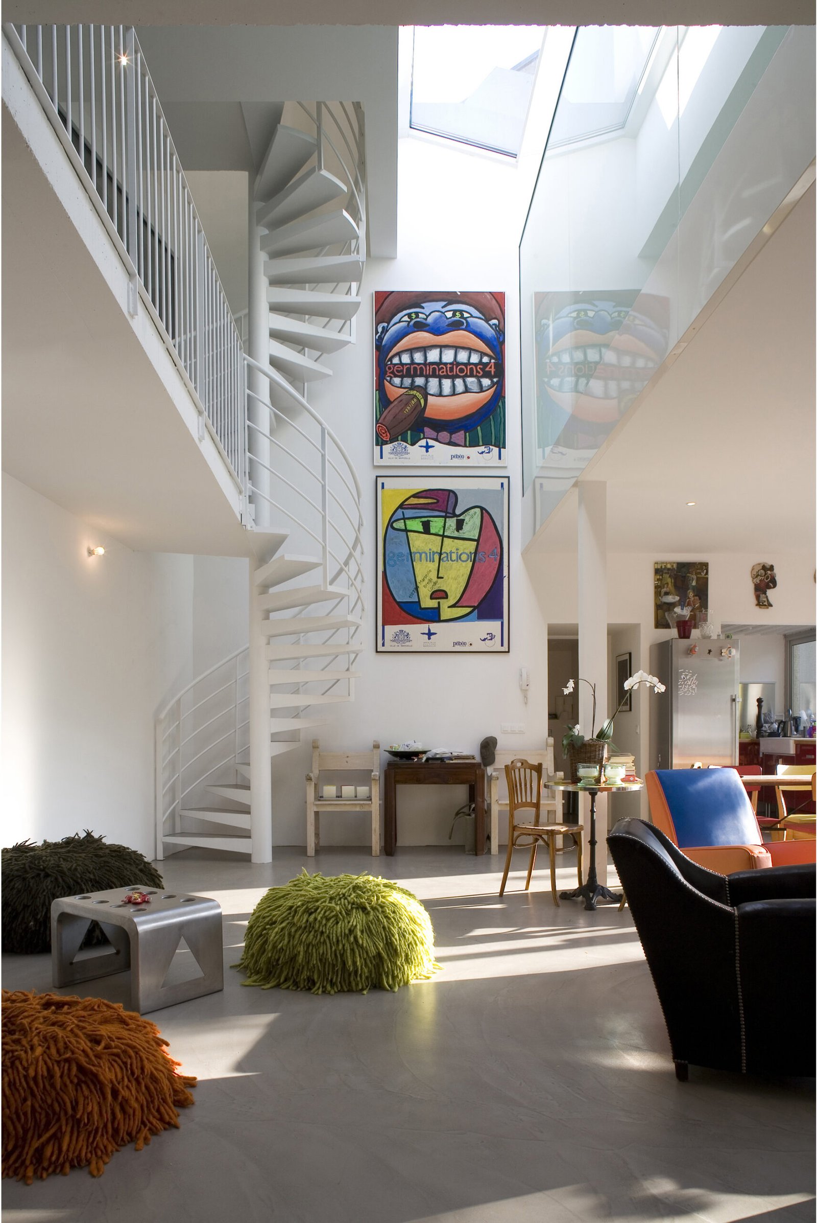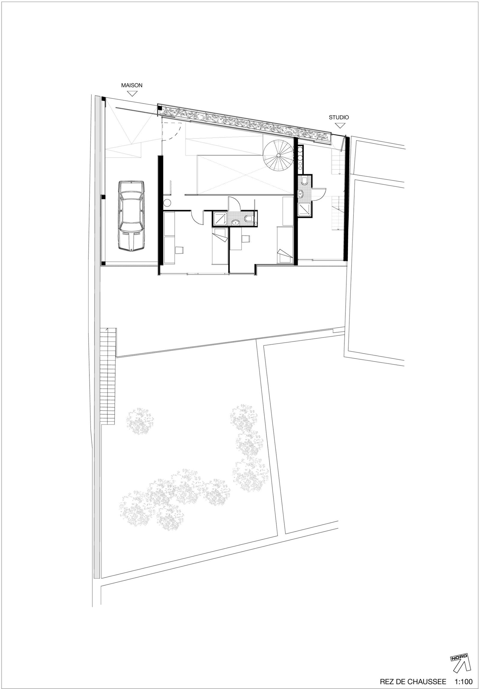 La maison se développe sur 3 niveaux distincts. Au rez-de-chaussée, le parking, l’entrée principale et « la maison des enfants ». À l’étage, la grande salle de bain commune et la chambre des parents.