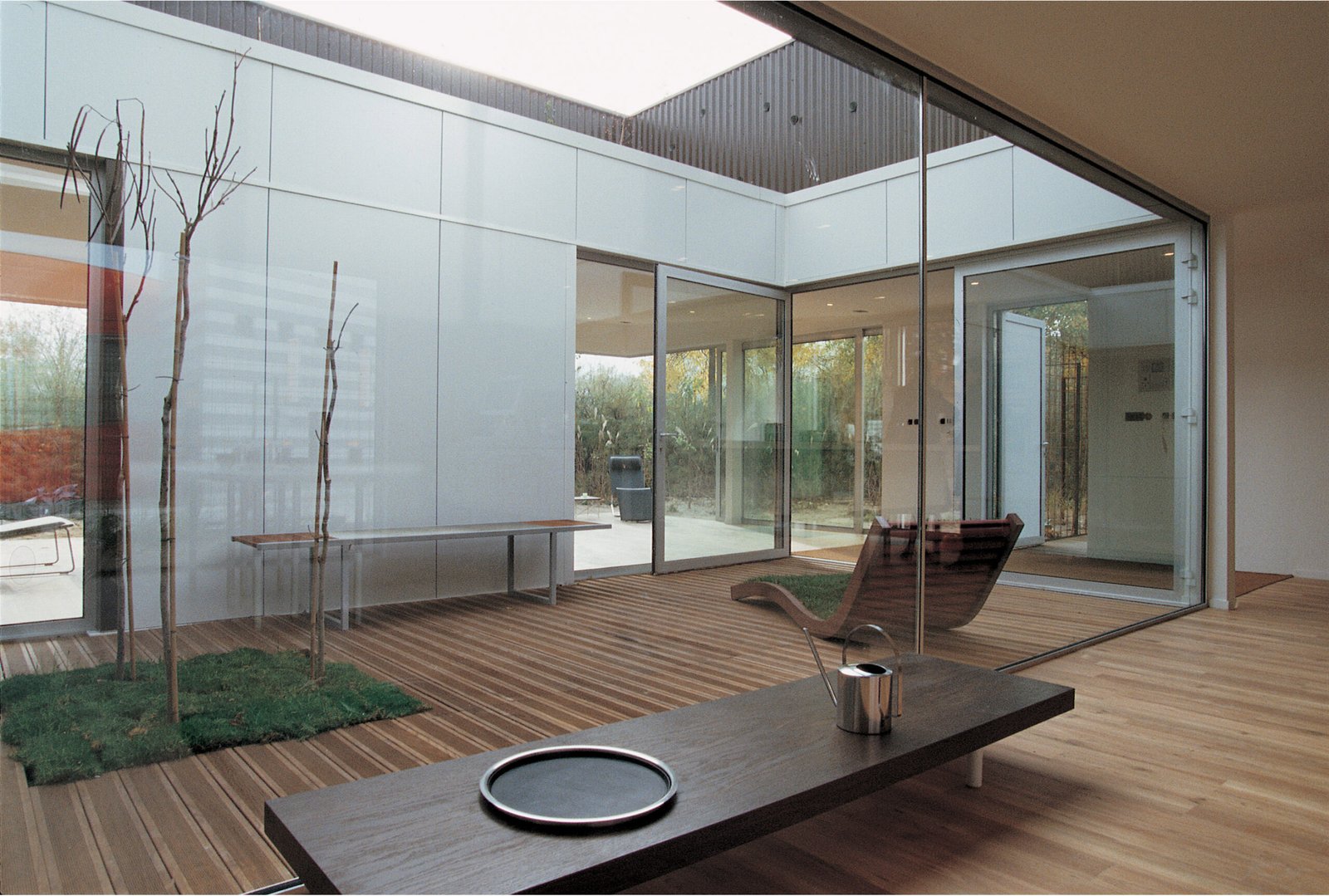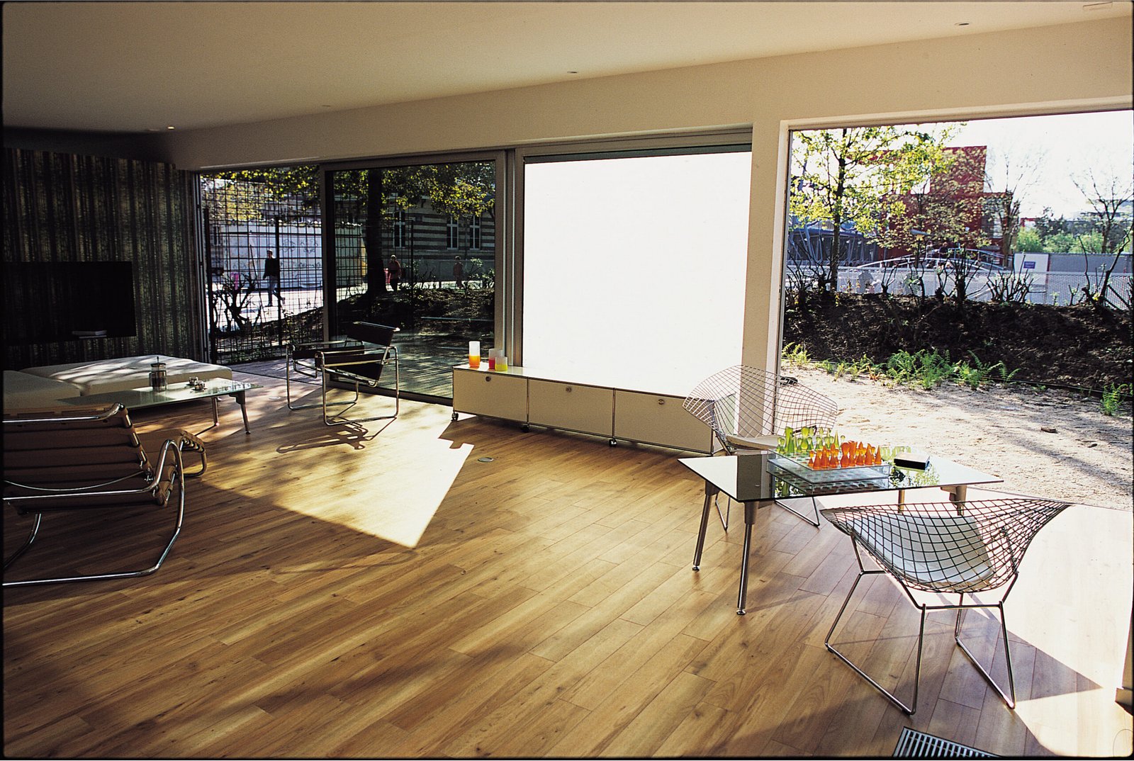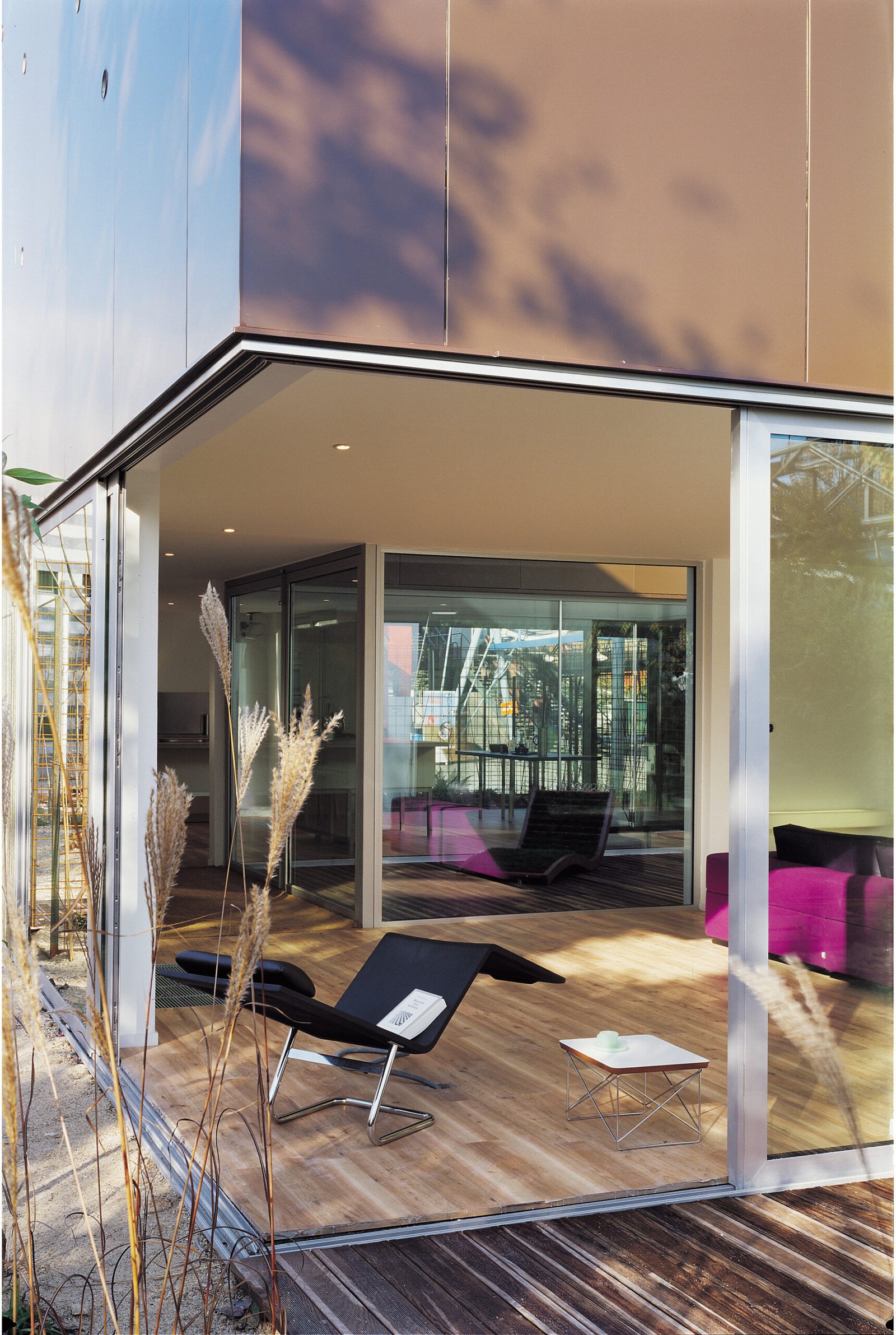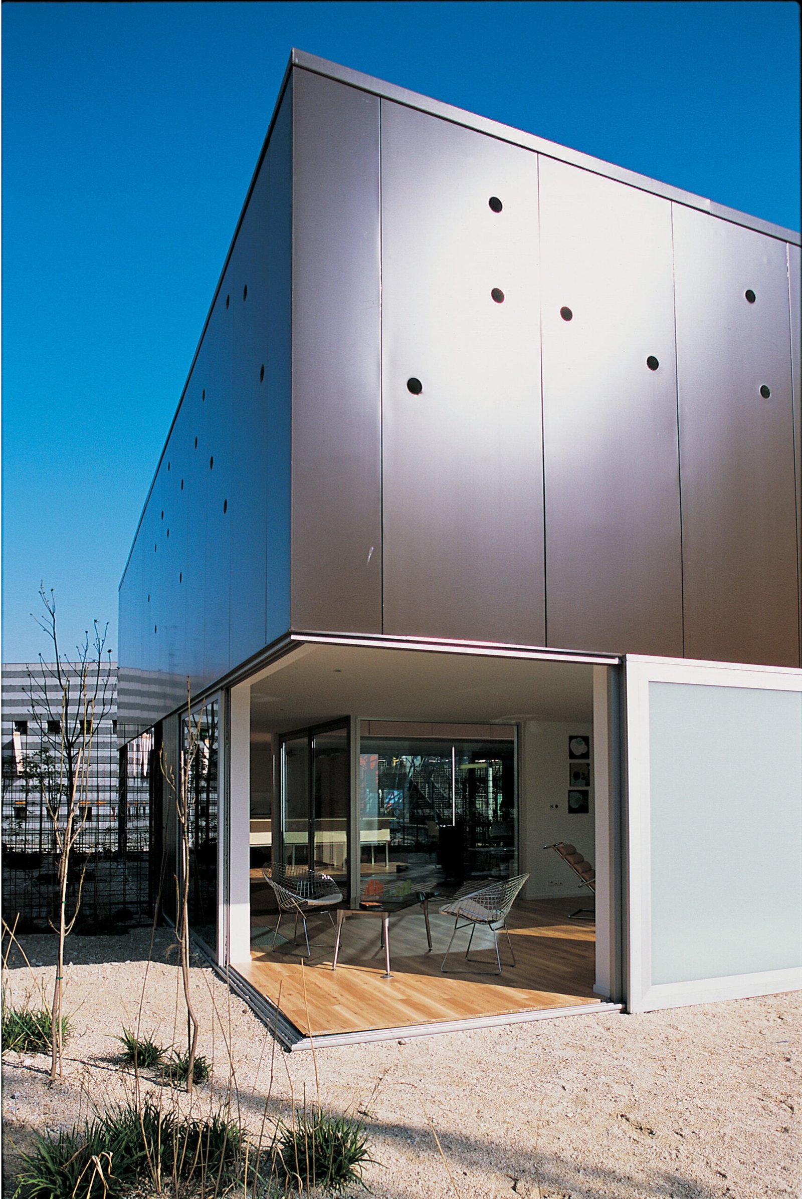 Lire la suite : Maison MétalEn ce sens, elle est programmatique. Le standard élevé de maison individuelle qu’elle devait incarner ne s’exprime pas dans les détails, encore moins dans la décoration, mais dans une certaine qualité d’espaces et dans l’appropriation des extérieurs par des lignes de fuite. Le rapport au-dehors (jardin, patio) dicte le parti architectural qui s’efface au profit de la perception des champs et contrechamps.