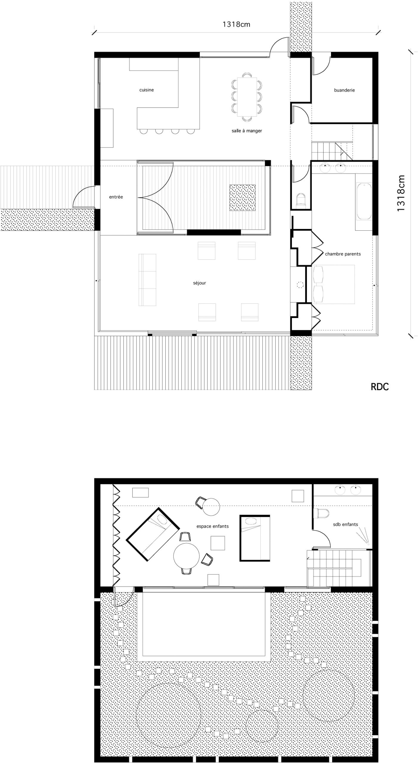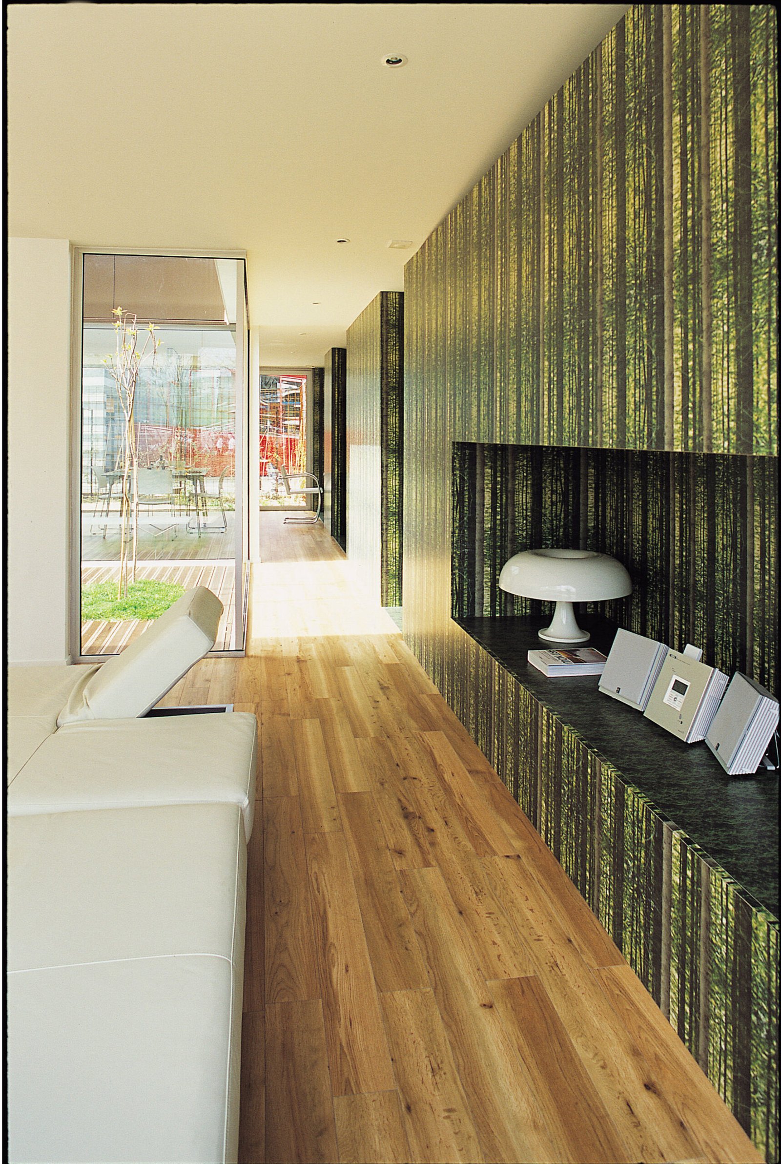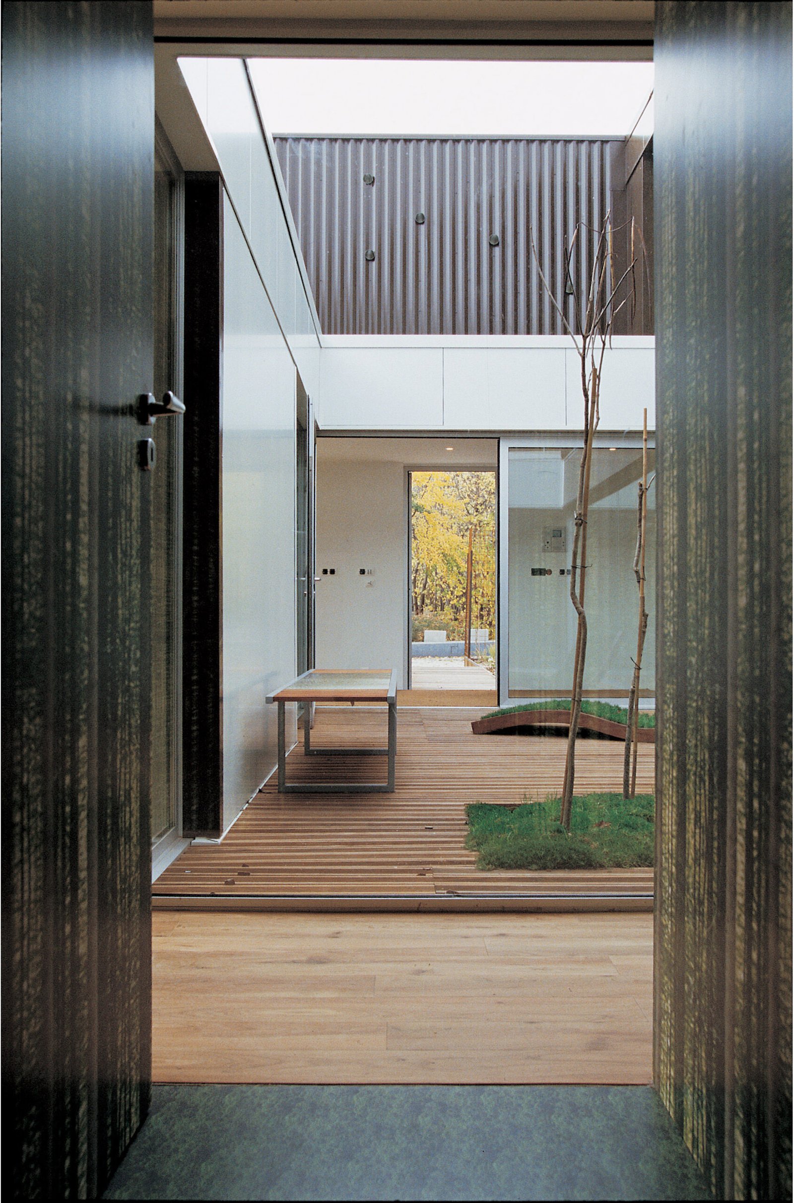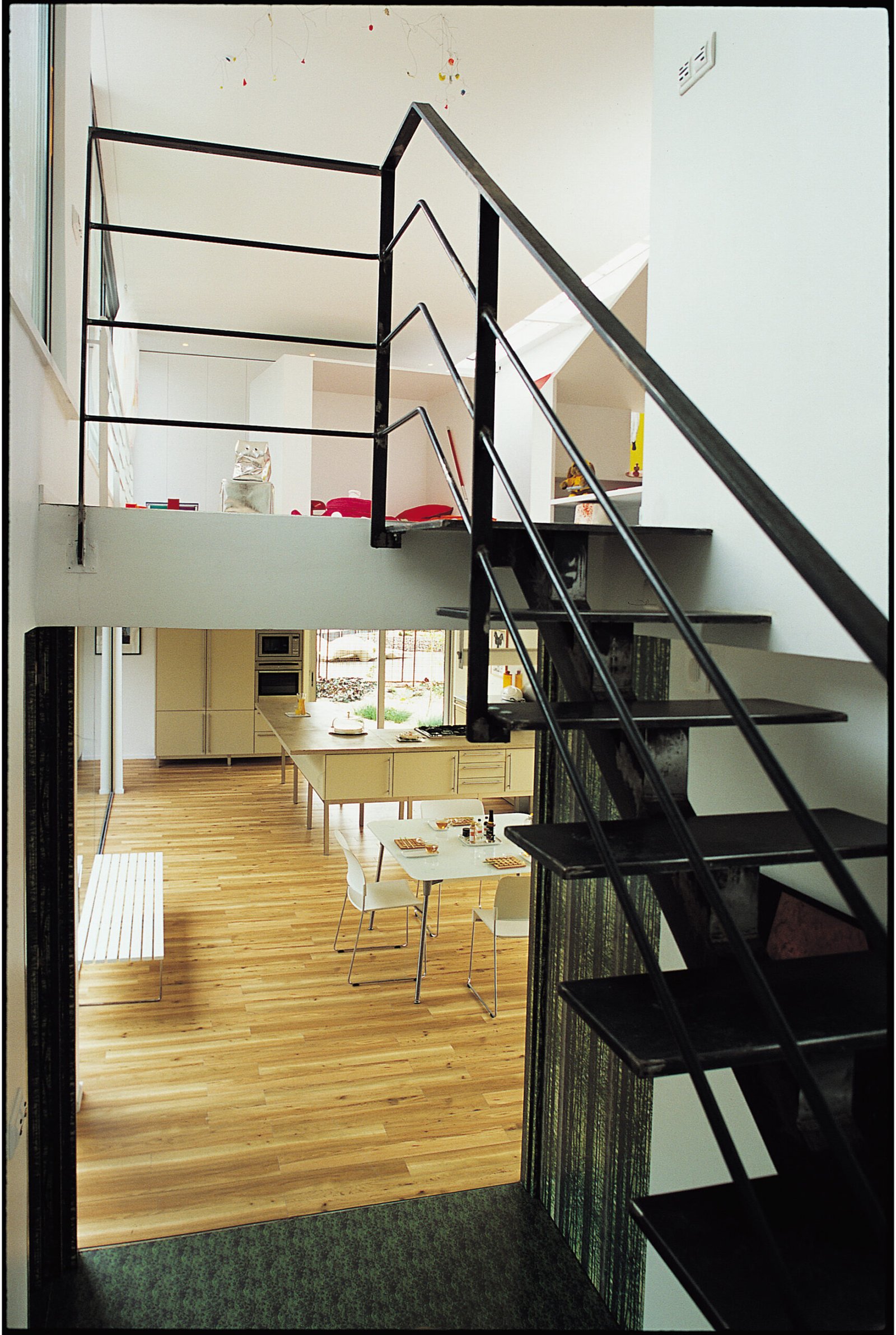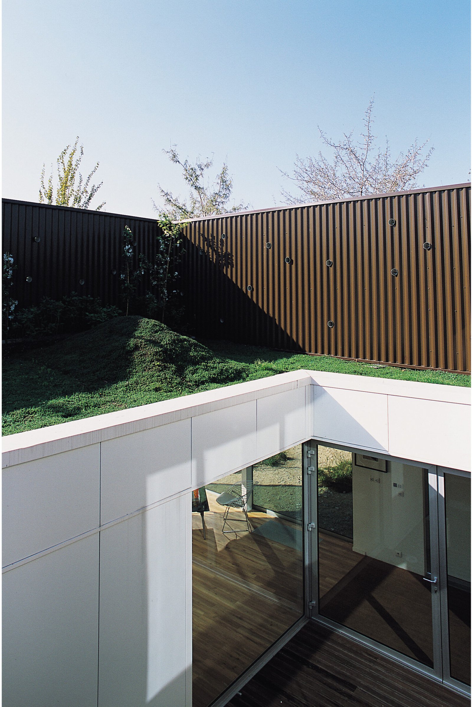 Cette maison forme tout simplement un ruban de 13 x 13 mètres, enroulé autour d’un jardin intérieur et doublé d’un second ruban, végétal celui-ci. En dépit de l’immensité du parc de la Villette dans lequel elle est posée, elle possède son propre jardin qui dessine un « seuil vert ». Il joue en duo avec les façades en verre ou inox poli miroir du rez-de-chaussée pour troubler la perception du volume. Au-dessus, le métal plein, façon blockhaus, laisse présager d’autres ouvertures : les espaces intérieurs à R+1 s’ouvrent sur un jardin suspendu et sur le ciel. Comme souvent dans les maisons Hamonic + Masson, on trouve des volumes bien séparés : enfants en haut avec salle de jeu et terrasse, parents en bas sur le patio, la famille s’étage selon les âges. Le schéma invariable de la tranquillité des uns et des autres.