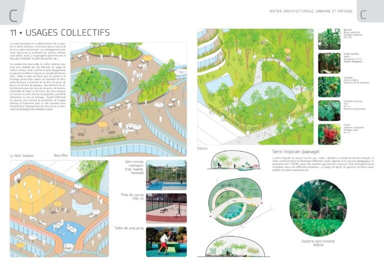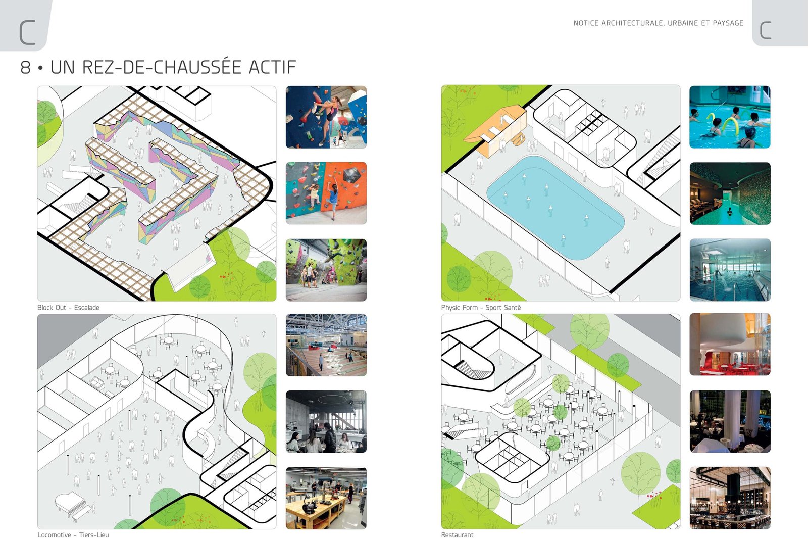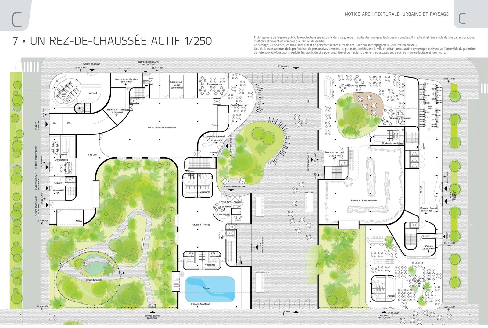 Construction neuve d’un programme superposé : un passage public + une serre événementielle dans le jardin + un espace fitness + une salle d’escalade + une salle de sport + des logements avec espaces de convivialité dédiés + restaurant + bureaux + co-living + parkings