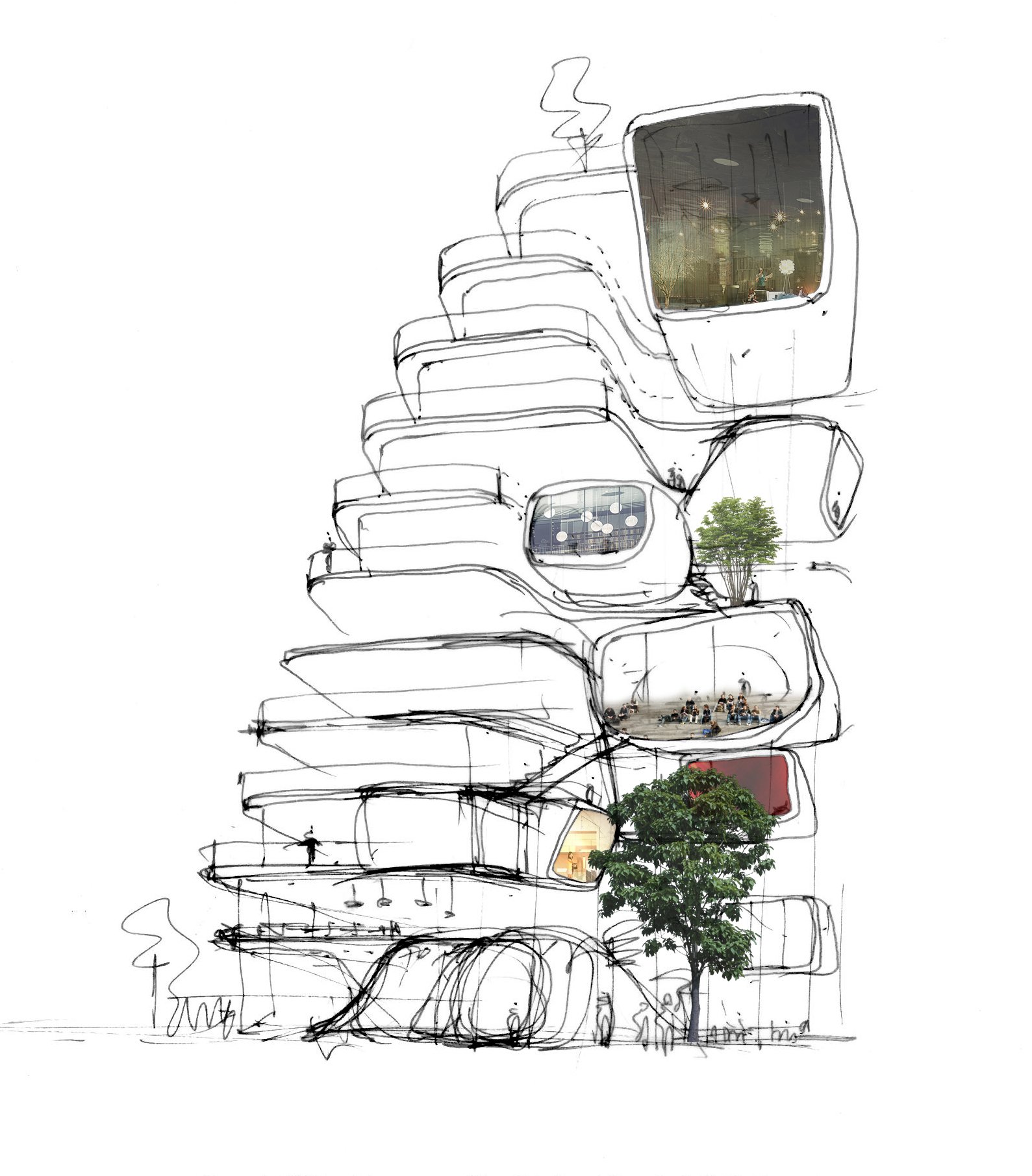 Véritable projet de synthèse, notre proposition a pour ambition d’inventer un bâtiment qui va prendre ses racines dans le site et inventer une nouvelle typologie. Nous allons créer de l’aventure, de l’imprévisible, de la surprise et des émotions dans une volonté d’écrire une partition en accord avec les ambitions portées par la ville.