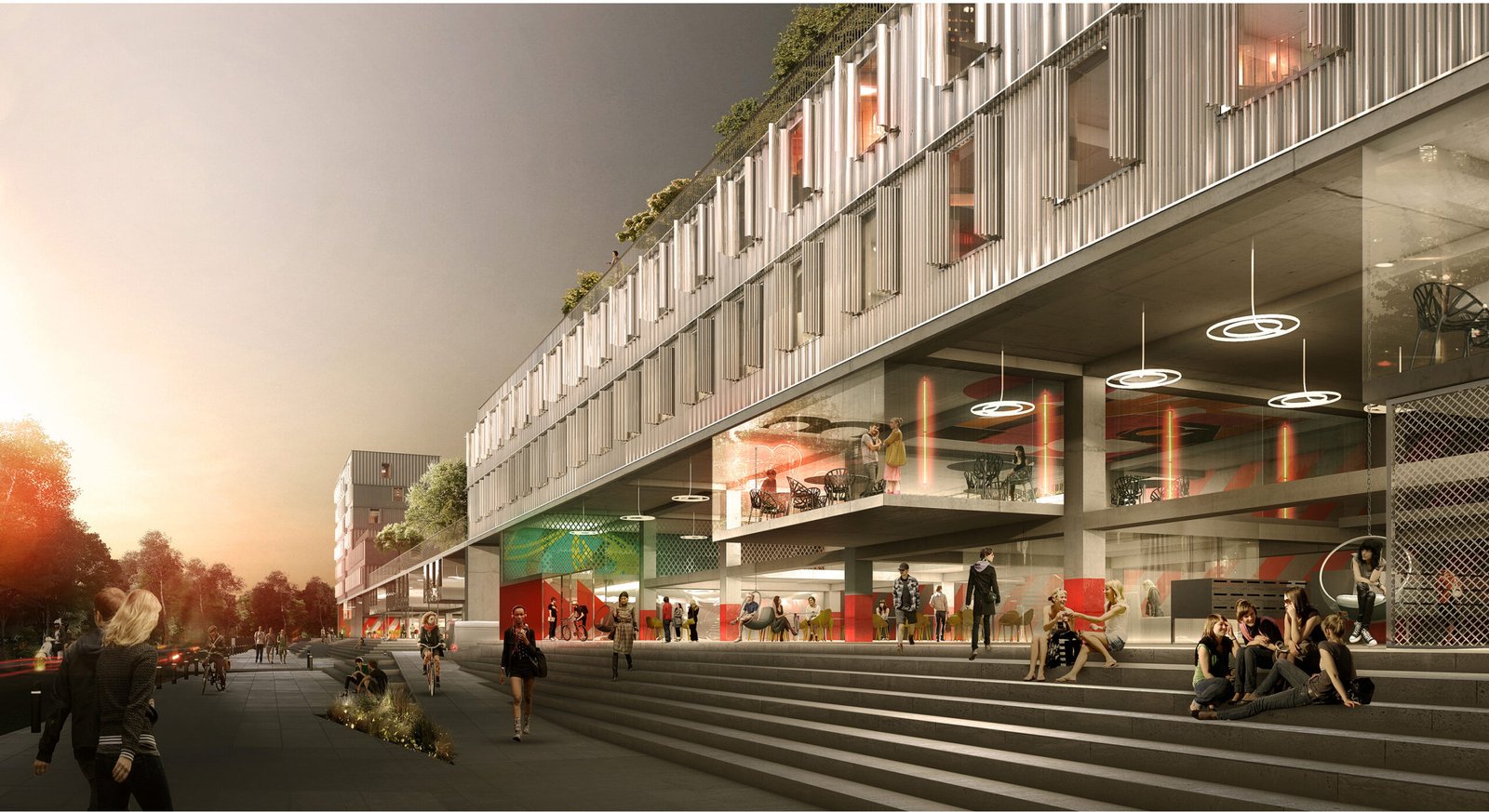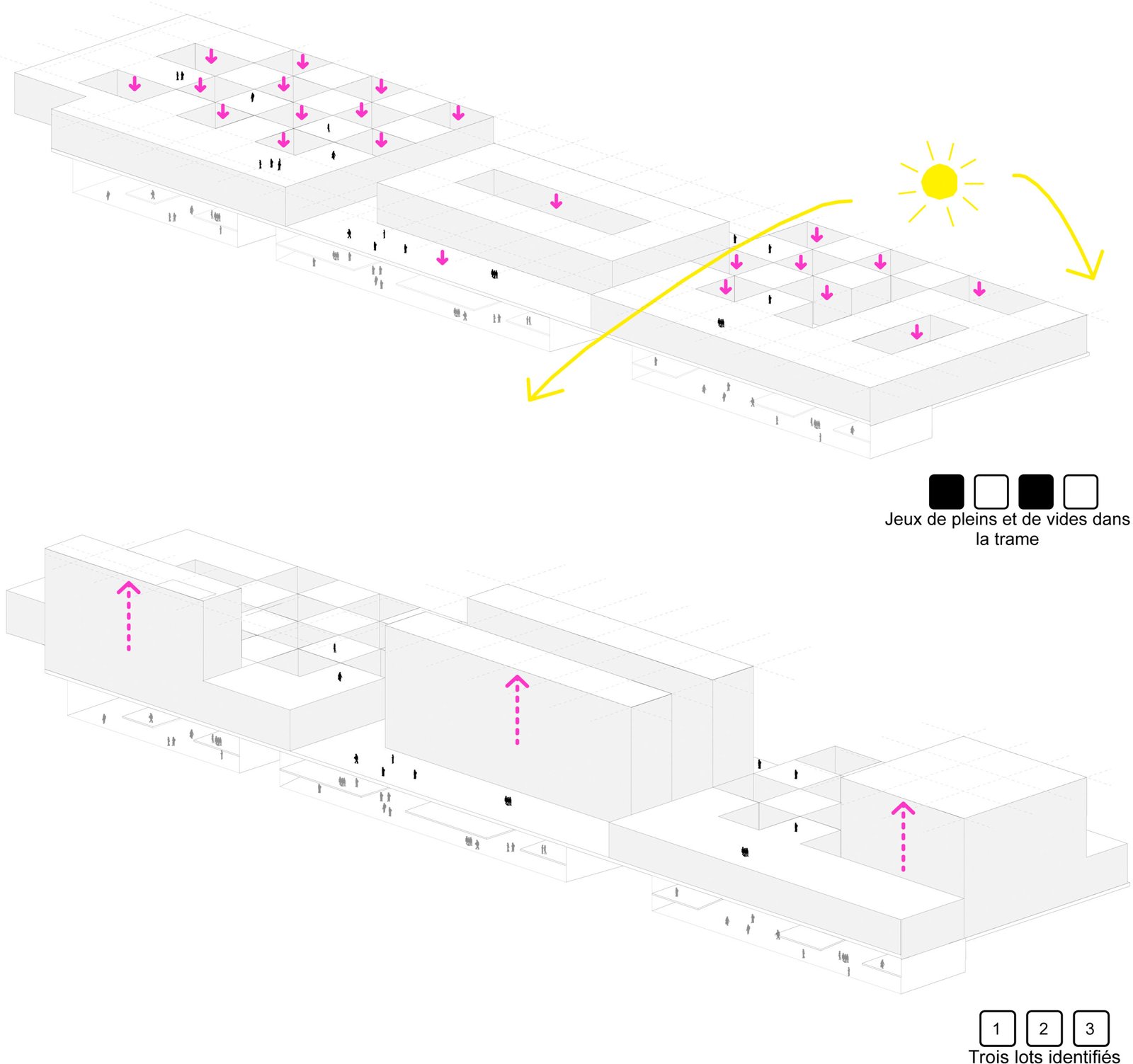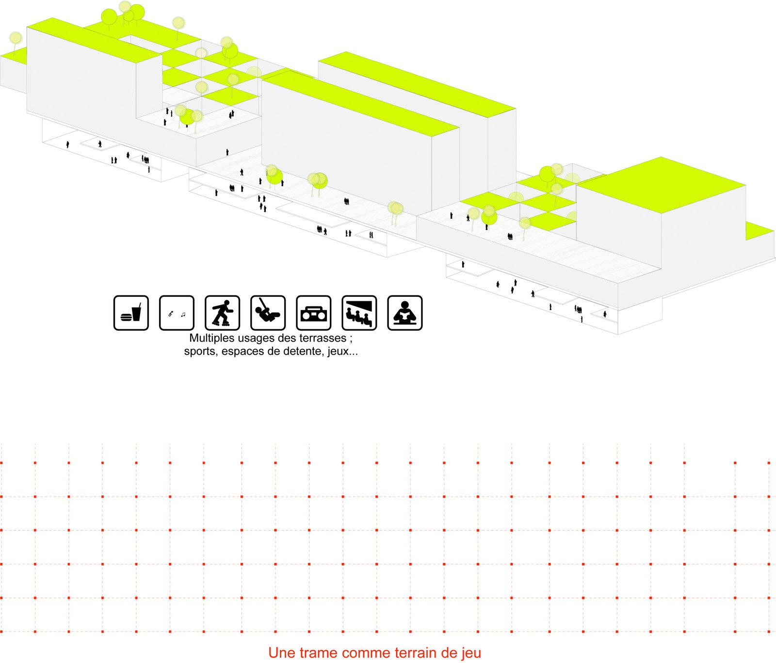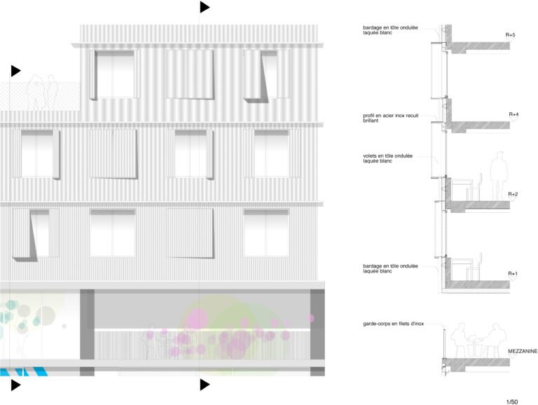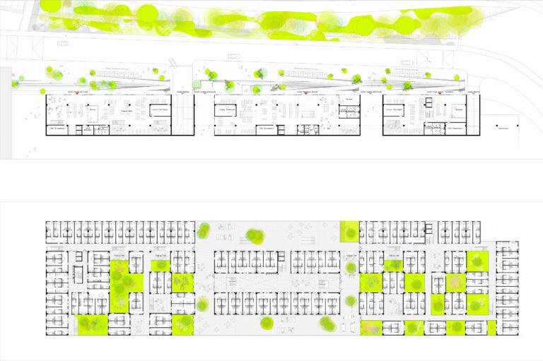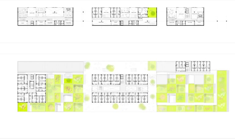 La boîte à outils (cloisons, façades…) mise à disposition permettra modularité et adaptations. Les trois entités du programmes (foyer de jeunes travailleurs, résidence sociale et résidence privée) peuvent fonctionner séparément ou ensemble. Comme les chambres, elles peuvent se connecter en un vaste campus urbain… ou pas. Mais elles composent un tout à l’échelle du site.