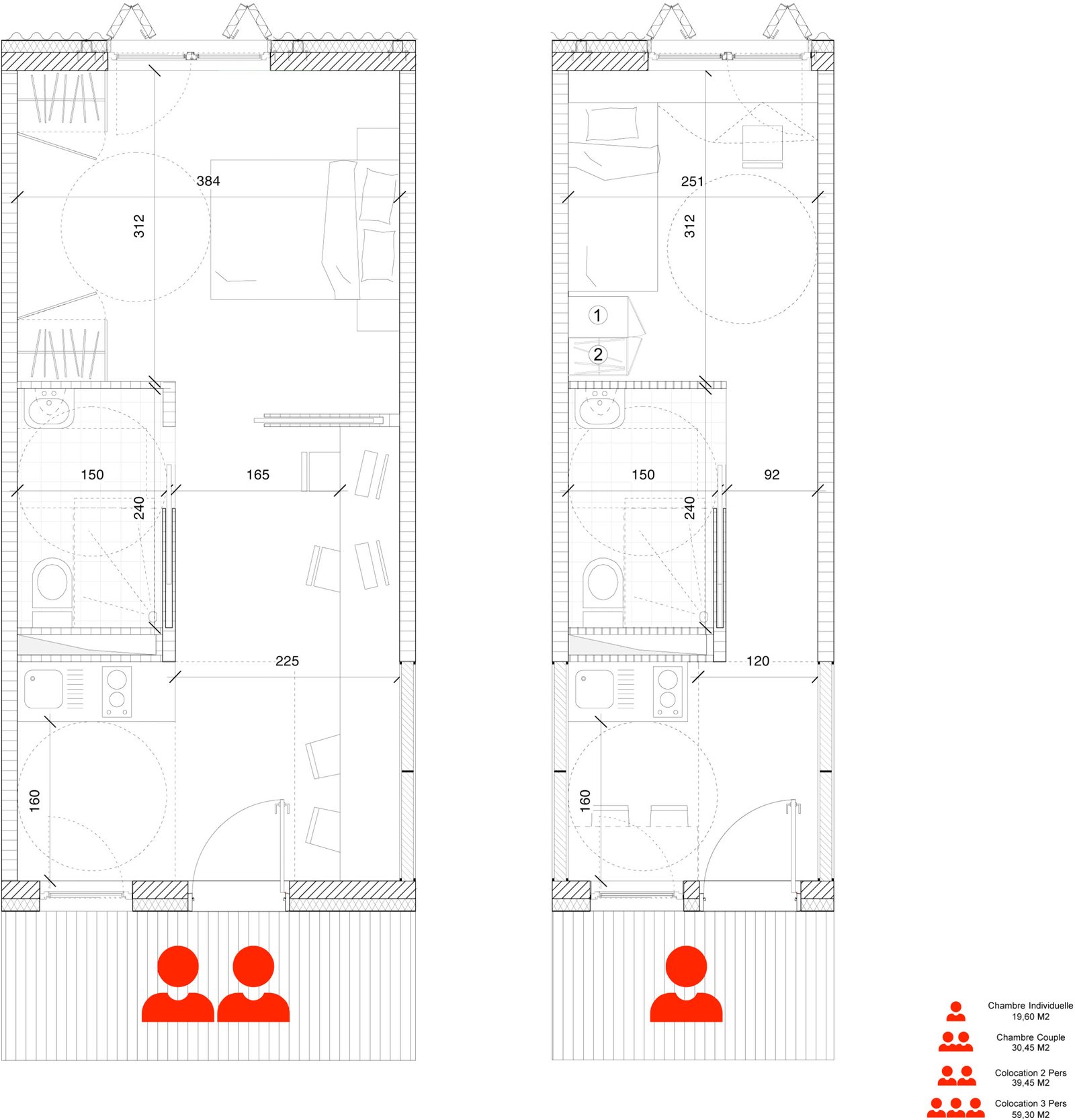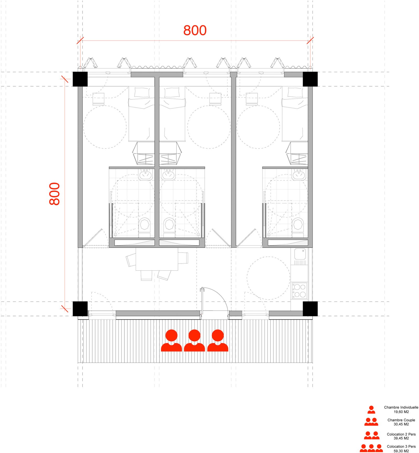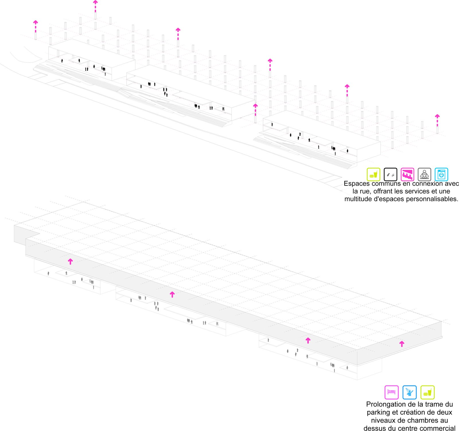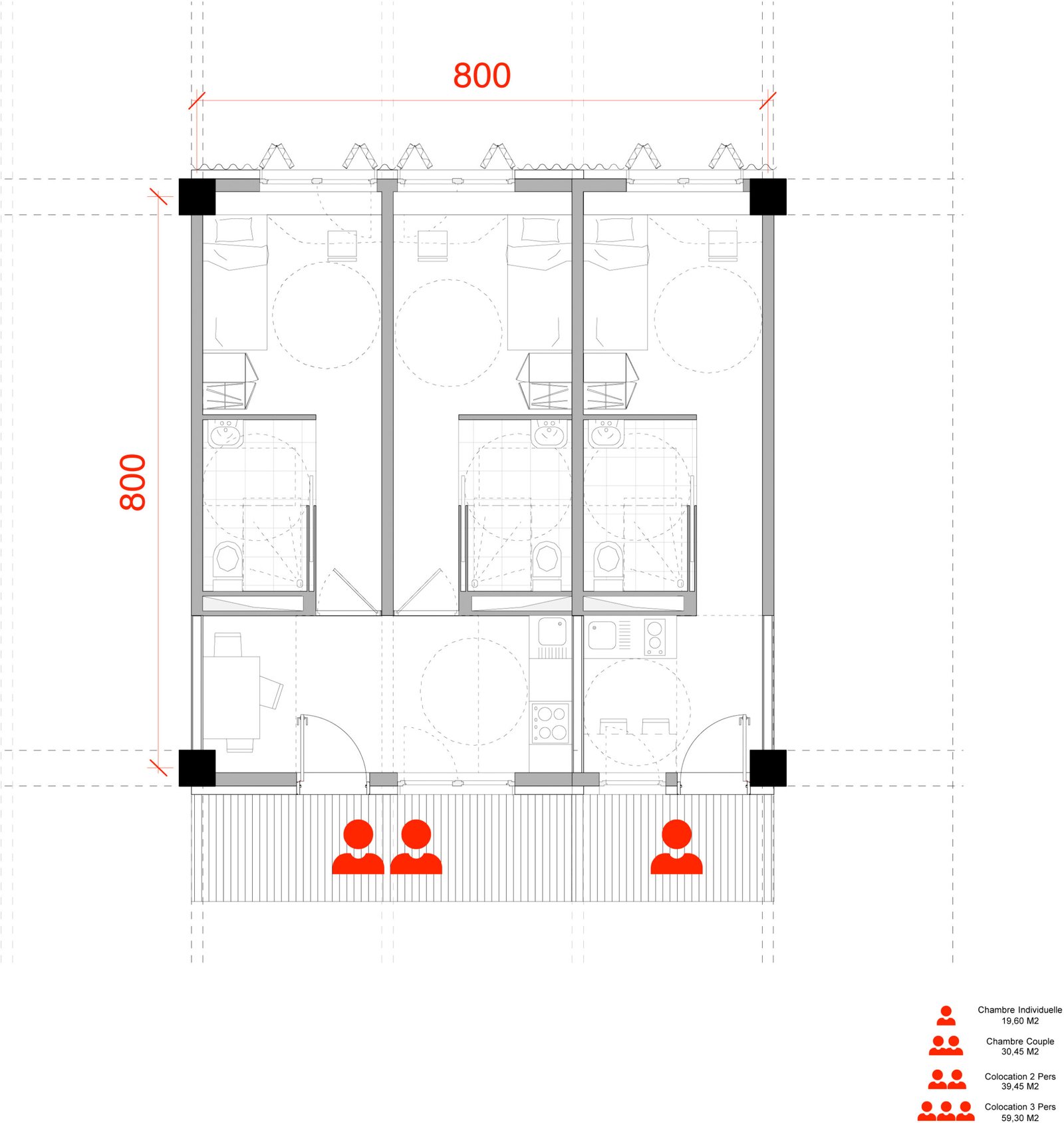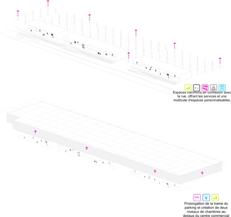 En partant de la trame du parking et du centre commercial, nous installons un vaste terrain de jeux sur la base d’un plan libre issu du contexte. La chambre type, conforme à toutes les normes et à la disposition tripartite traditionnelle (cuisine, sdb, lit/bureau) est ordinaire mais elle permet toutes les combinaisons possibles. Il appartiendra aux futurs gestionnaires et utilisateurs de définir les modes de vies : chambres simples, doubles, collocations à deux, à trois, etc … Tout sera possible.
