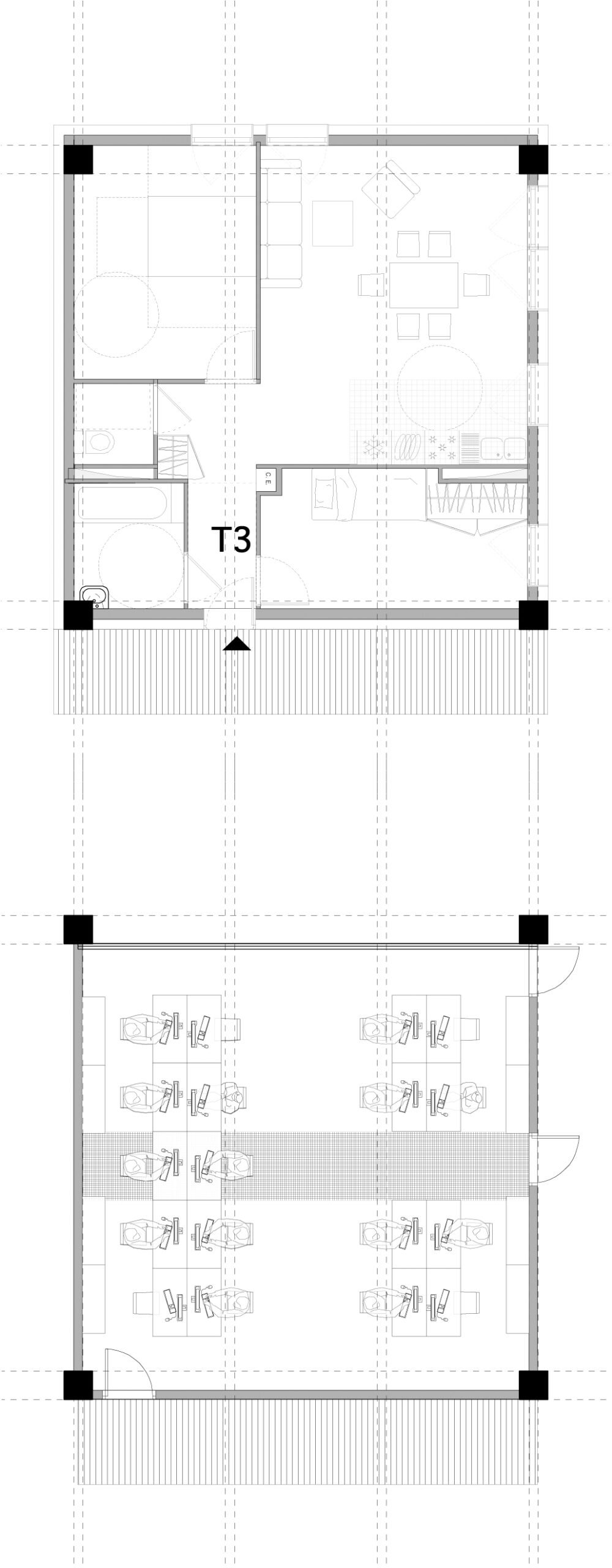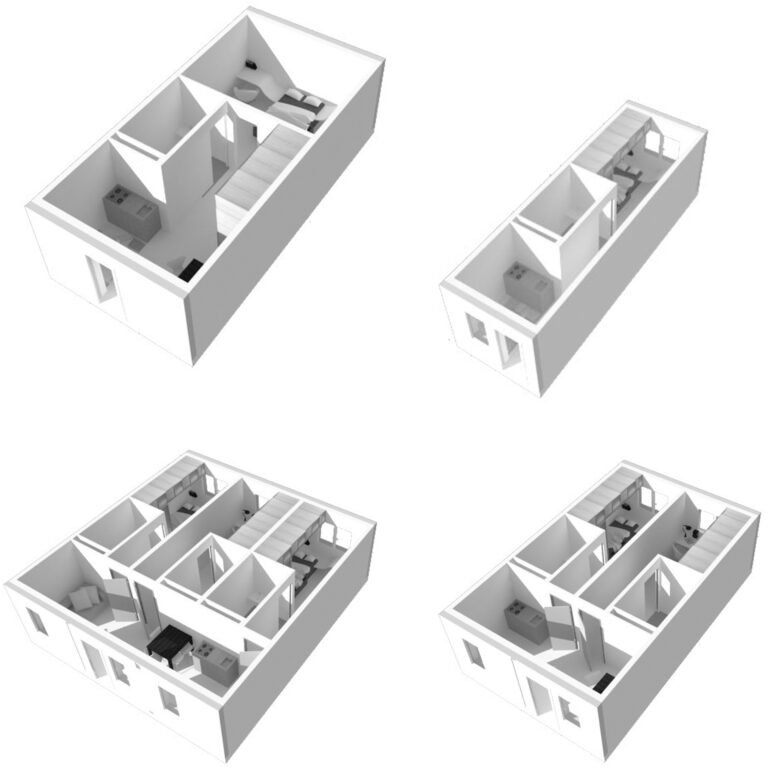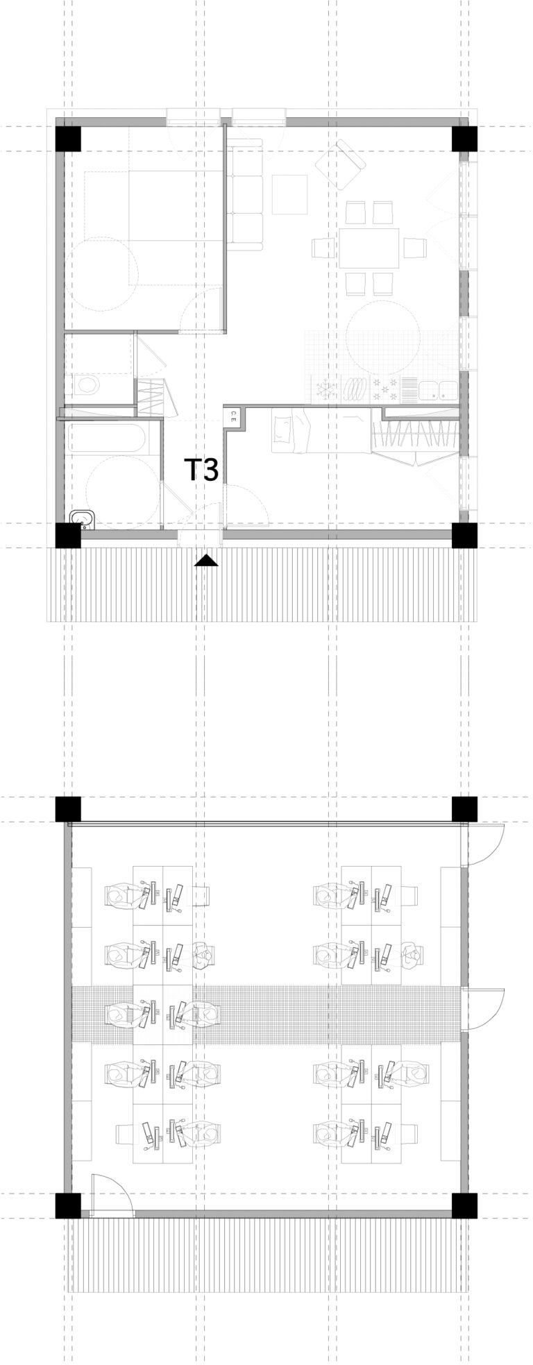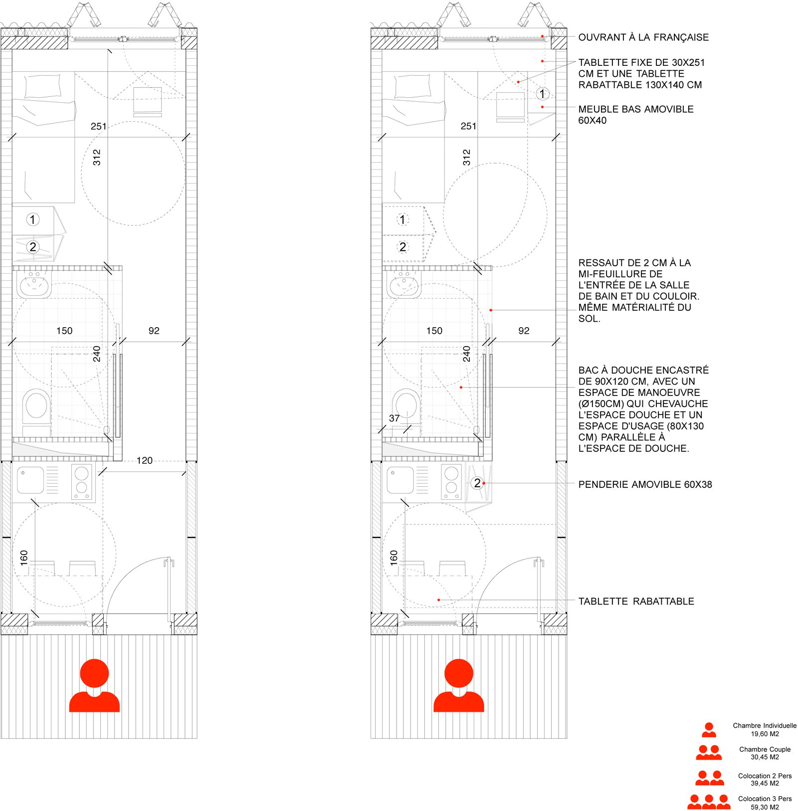 En partant de la trame du parking et du centre commercial, nous installons un vaste terrain de jeux sur la base d’un plan libre issu du contexte. La chambre type, conforme à toutes les normes et à la disposition tripartite traditionnelle (cuisine, sdb, lit/bureau) est ordinaire mais elle permet toutes les combinaisons possibles. Il appartiendra aux futurs gestionnaires et utilisateurs de définir les modes de vies : chambres simples, doubles, collocations à deux, à trois, etc … Tout sera possible.