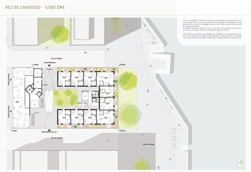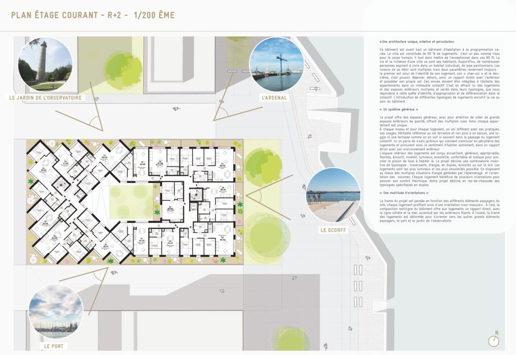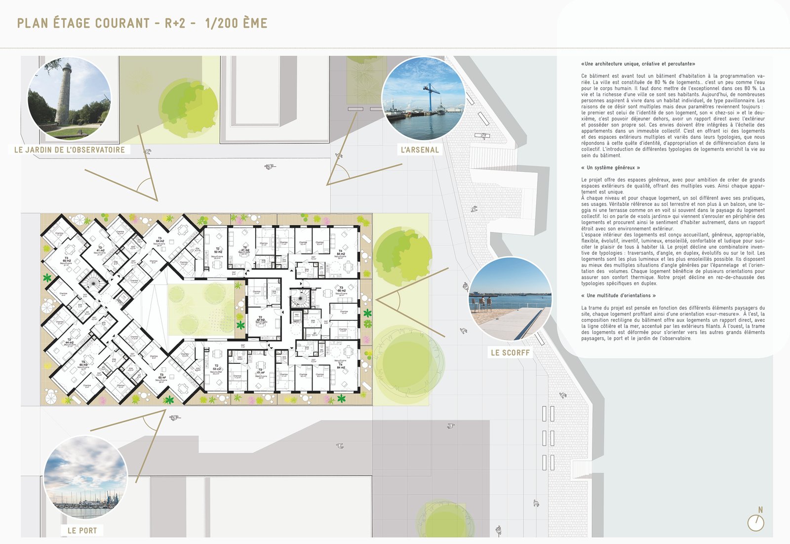 Lire la suite : SafranAffirmant une franche frontalité sur le quai face à la mer, le bâtiment se développe ensuite à travers une architecture en gradin pour finalement dialoguer avec le jardin reposoir, le mail et la maison des imprimeurs. Les orientations et les vues sont multipliées par la rotation opérée des volumes donnant sur les rues et sur le jardin. Cela permet à la fois d’échapper aux masques et vis à vis direct avec les bâtiments voisins sur les rues nord et sud, et de permettre des dégagements visuels sur la mer et le grand paysage. L’ensoleillement et les vues sont démultipliés par ce travail de géométrie du plan.
