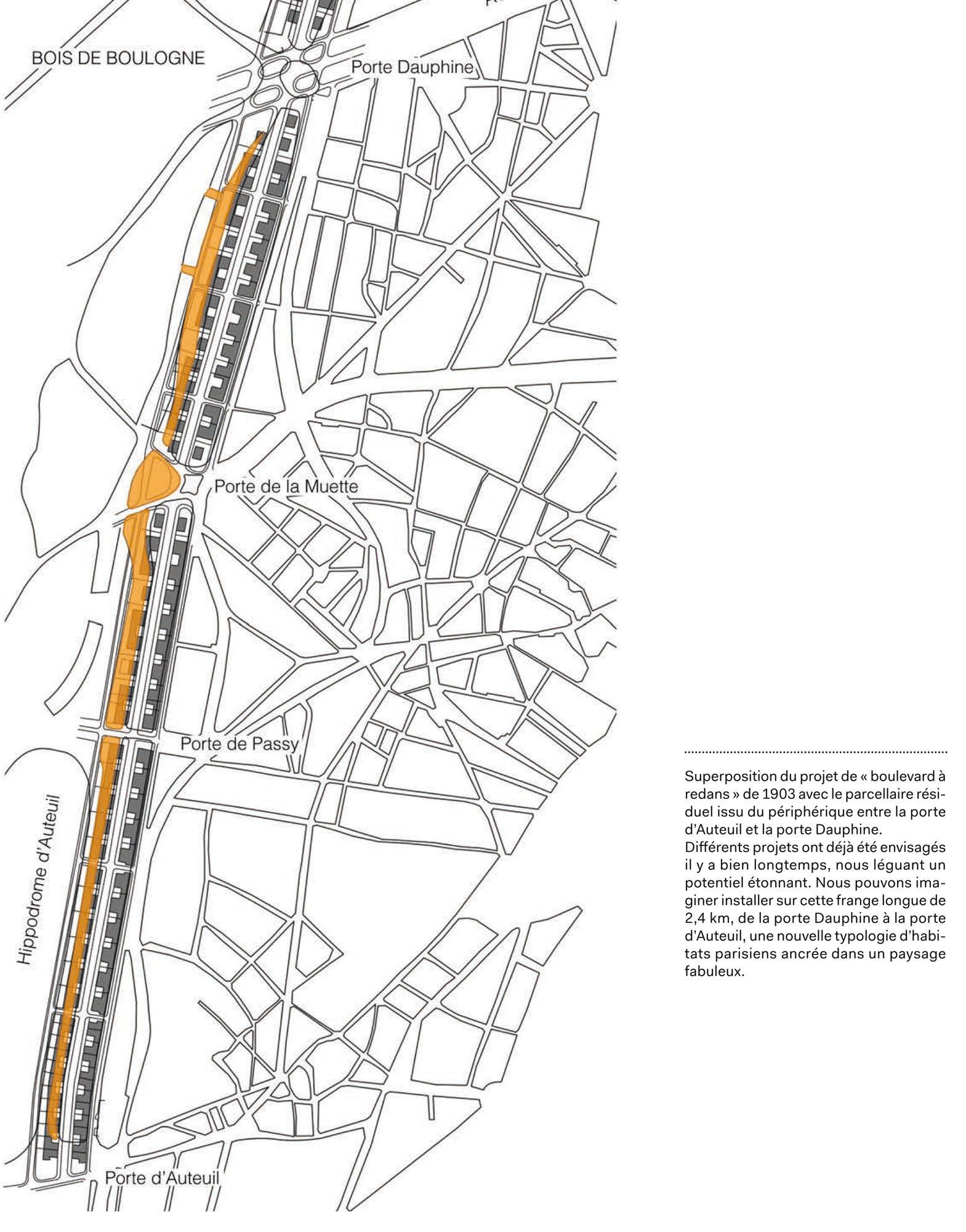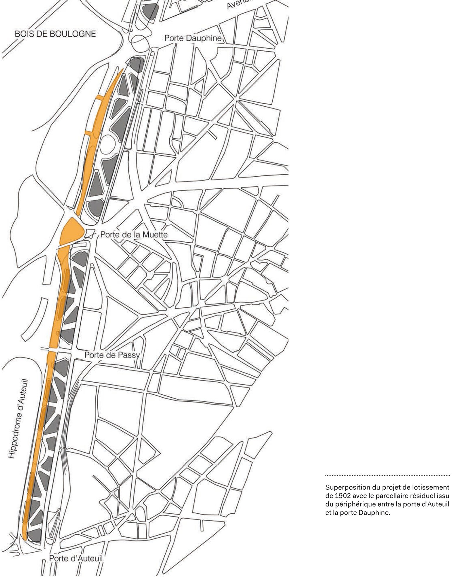 Le périphérique a également engendré un parcellaire résiduel en lieu et place des anciennes fortifications. Après le déclassement des fortifications au début du siècle dernier, la mise en valeur des terrains disponibles attire divers projets de lotissements. Par exemple, celui de « boulevard à redans » entre la porte Maillot et la porte d’Auteuil d’Eugène Hénard, datant de 1903, illustre à merveille les ambitions de l’époque en matière de réaffectation programmatique du foncier libéré. Ce projet n’a jamais vu le jour : seule une bande plus large a trouvé sa place et un espace libre de promenade a été conservé, faisant le lien entre le bois de Boulogne et les bâtiments de logements. La construction du périphérique a remis en cause cet horizon paysagé et a créé un espace résiduel entre la nouvelle infrastructure et les constructions.