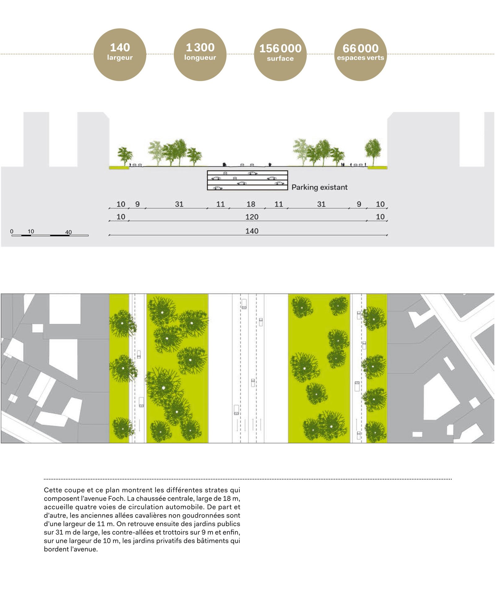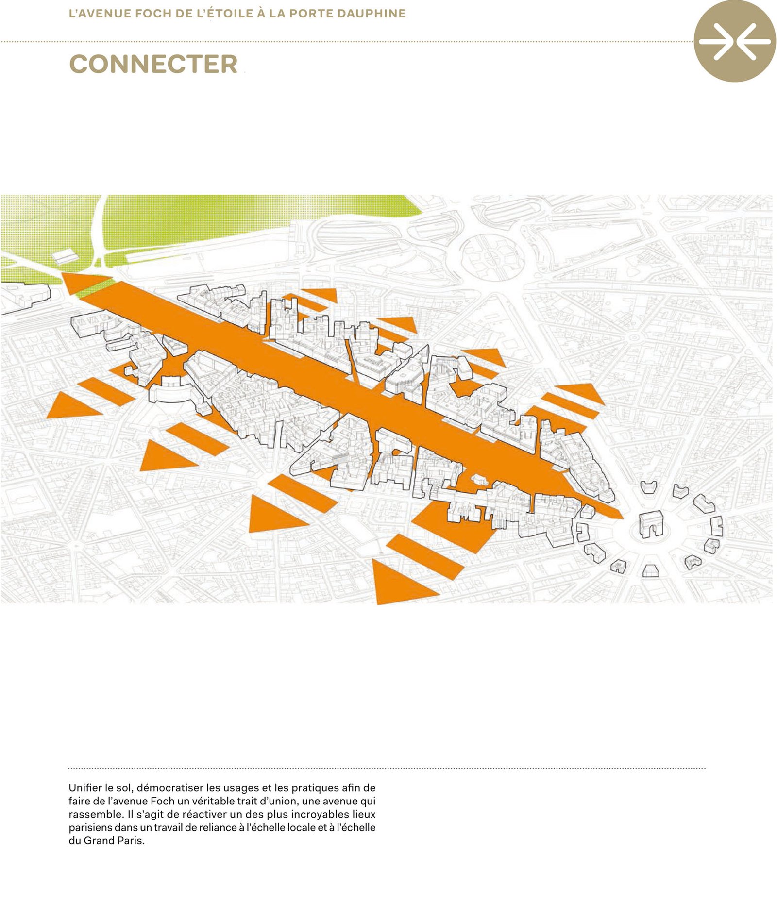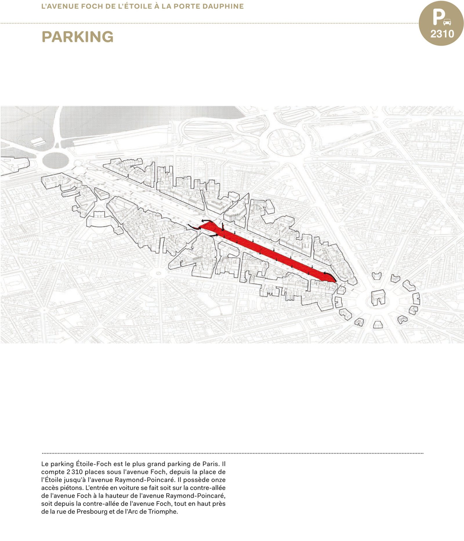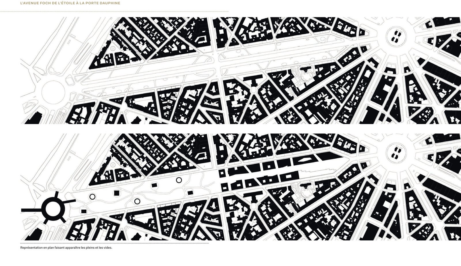 Parce que l’ignorer ne mène qu’à la reconduction d’erreurs anciennes, le regard sur l’avenir est impossible sans un regard sur le passé. Originellement, l’avenue Foch est un lien fort entre le bois de Boulogne et Paris, son prolongement naturel. Nous proposons ici de revenir à cet aspect fondateur essentiel, progressivement détourné puis perdu par l’édification du périphérique. En effet, dès 1960, la réalisation du rond-point de la porte Dauphine, dû à la présence de plus en plus importante de la voiture, porte le premier coup et contribue à la séparation physique du bois et de l’avenue, qui est définitive en 1973, quand le périphérique est édifié. L’avenue Foch, ayant jusqu’ici le statut de la plus grande promenade urbaine, devient la première autoroute intra muros. Elle brille aujourd’hui par les absences qu’elle met en scène. Absence d’activités, absence de vie tout simplement. Convoquer l’histoire nous permet de comprendre les strates urbaines, les éléments fondamentaux et les moments de ruptures qui ont contribué à la perte de l’essence première de cette voie. Il est intéressant de constater ici que la construction du parking Étoile Foch en 1968 a totalement éventré la moitié de l’avenue. Le paysage que nous avons donc sous les yeux aujourd’hui est en fait, pour moitié, un pastiche haussmannien de la fin des années soixante. Les dossiers de classement de l’avenue Foch, rattachée au bois de Boulogne, du 23 septembre 1957 et du 18 juin 1960 n’ont donc pas empêché la construction du périphérique et du parking. La voiture et les déplacements étant décrétés cause nationale, l’État a signé les autorisations nécessaires. Aujourd’hui, le périphérique se retrouve donc en site classé ! L’histoire nous permet ainsi de constater des absurdités, mais aussi de s’appuyer sur la jurisprudence. Si la voiture a été une cause nationale dans les années soixante et soixante-dix, que dire du logement et de l’espace public en ce début de XXIe siècle ?
